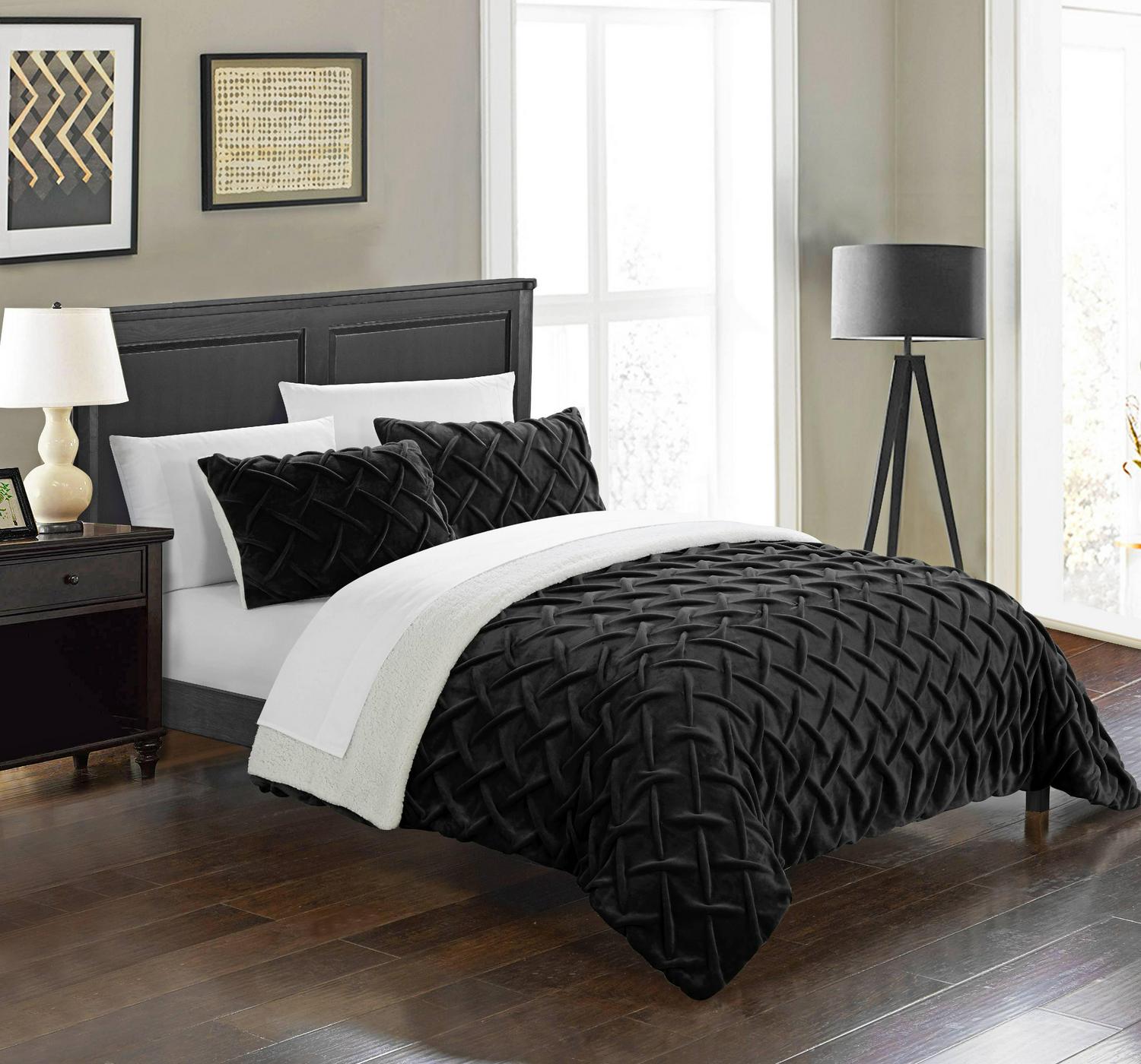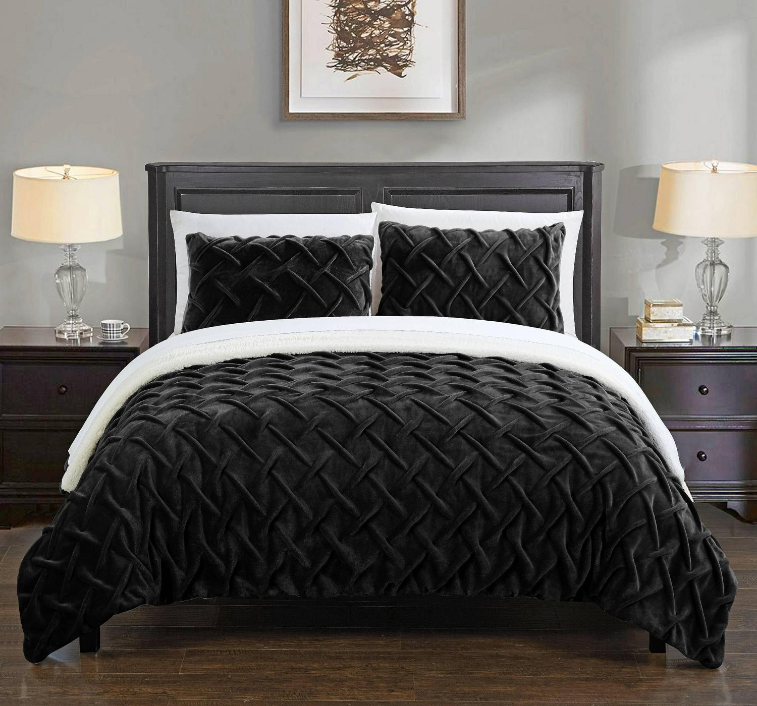 Treat yourself with this gorgeous super plush, super warm Sherpa lined comforter with design coordinated pillow shams. Made with a new technique that highlights a pinch pleat style in a crisscross design. Stunning colors guaranteed to enhance any room or decor all year round.
