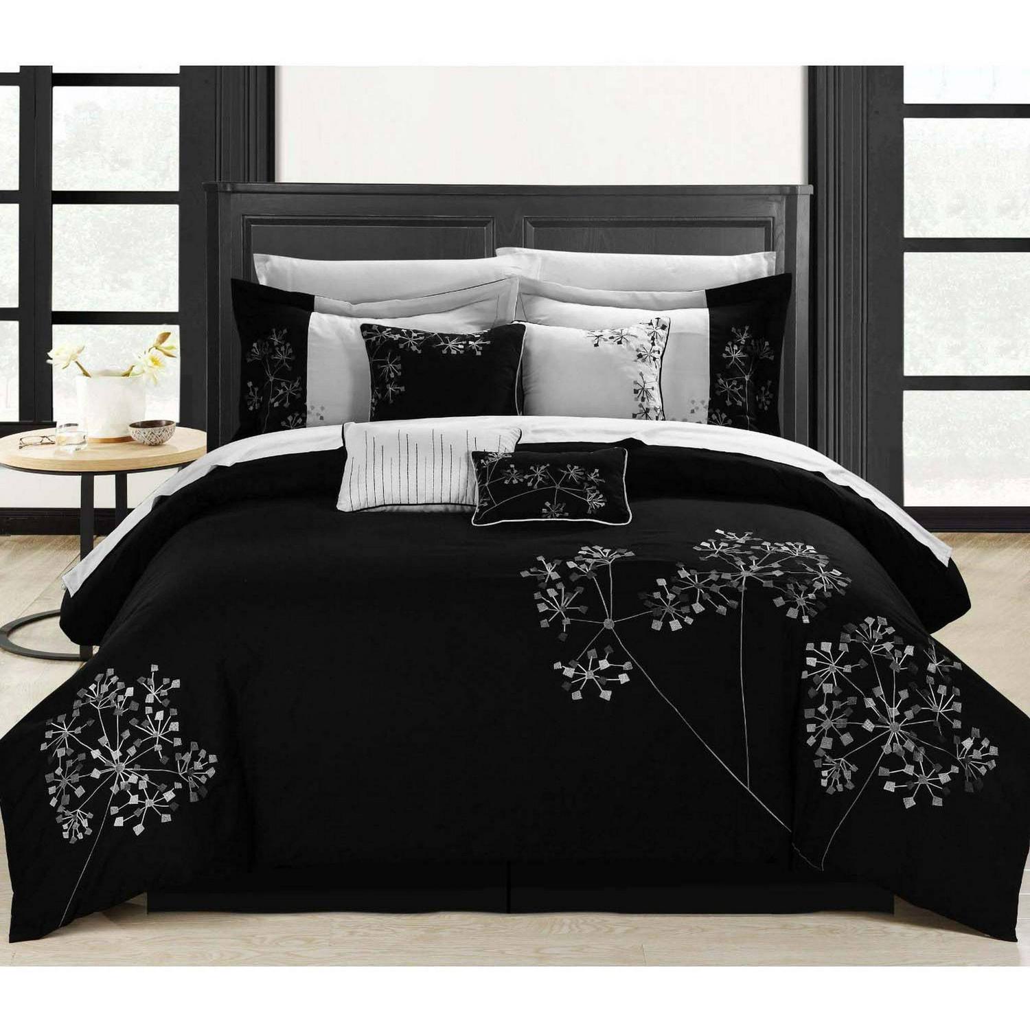 Chic Home Petunia 12-Piece Embroidered Comforter, Queen, Black White