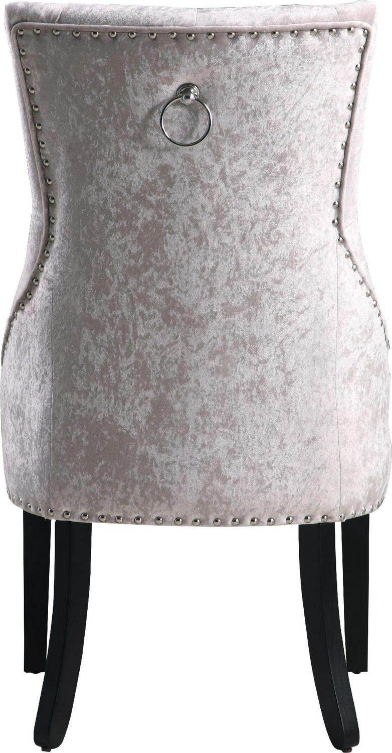 This is an updated interpretation of a classic dining chair. Design details abound from a gently sculpted solid-wood frame, upholstered beautifully in luxurious velvet with all-around nailhead trim. Dark espresso finished legs and a decorative nickel pull on the back complete the refined look that will complement a dining table or living area. The digital images we display have the most accurate color possible. However, due to differences in computer monitors, we cannot be responsible for variations in color between the actual product and your screen.