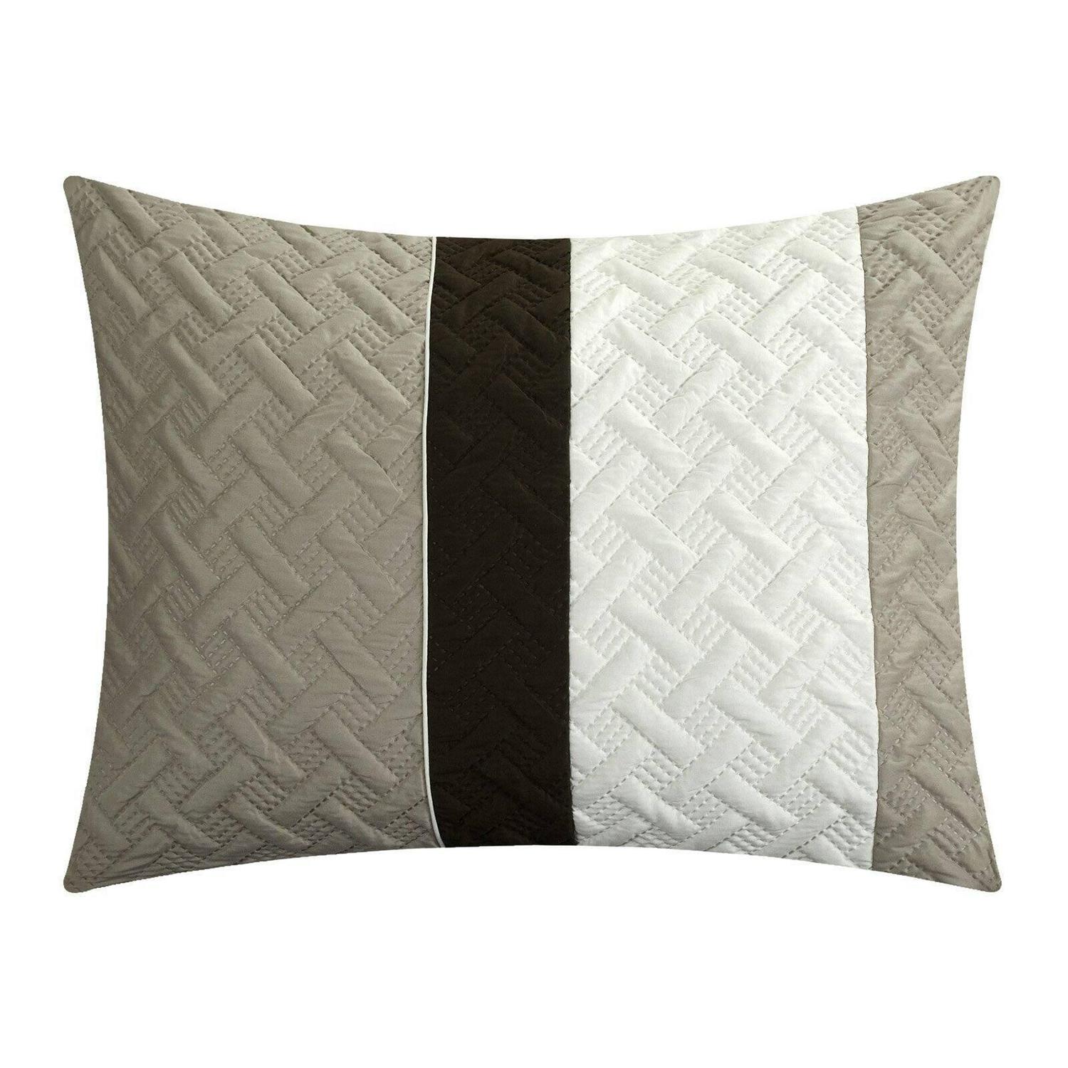 An elegant fashion forward bedding collection with everything you need for a complete bedroom décor makeover. Elegant and sophisticated color block design with quilted embroidery stitching. Super-soft microfiber sheets, design coordinated shams and trendy deco pillows are included to complete the look.