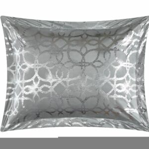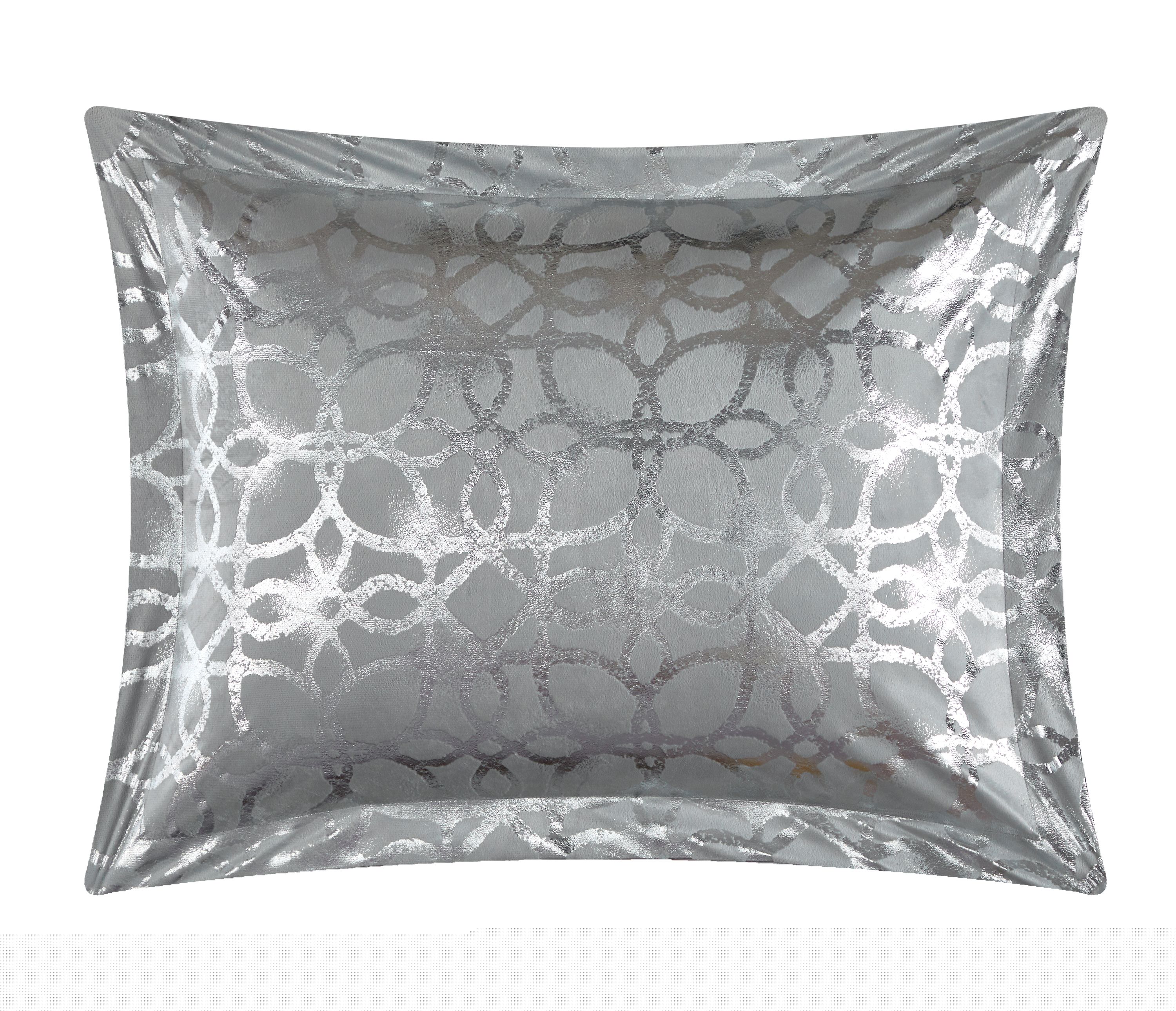 – METALLIC PRINT – Fashion forward design featuring an intricate gold tone metallic lattice pattern print – Design coordinated shams and deco pillows included