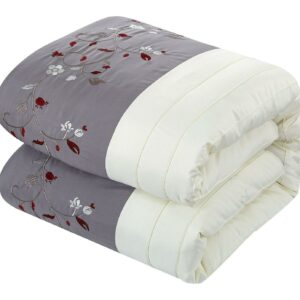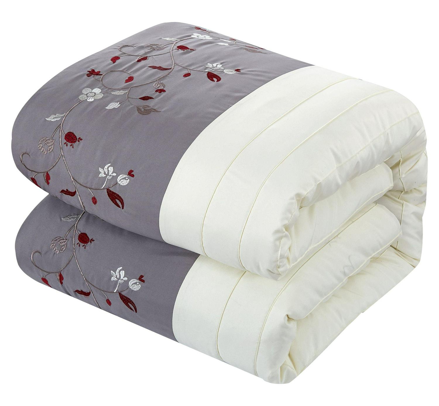 A fashion forward bedding collection with everything you need for a complete bedroom décor makeover. The comforter features an elegant color block technique with floral embroidery details. Window treatments, super-soft microfiber sheets, design coordinated shams, and embellished deco pillows are included to complete the look.