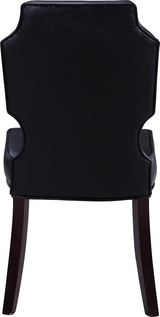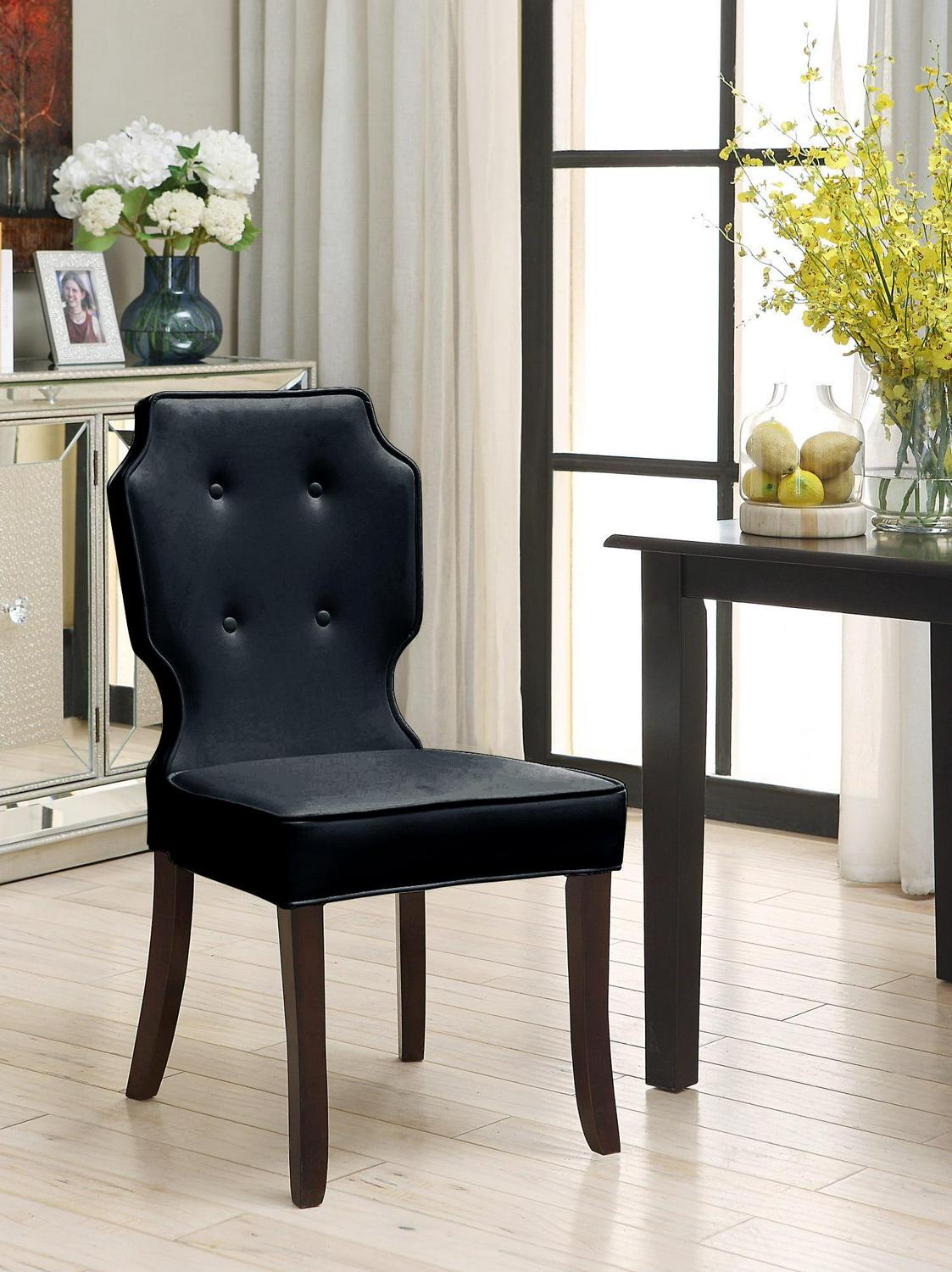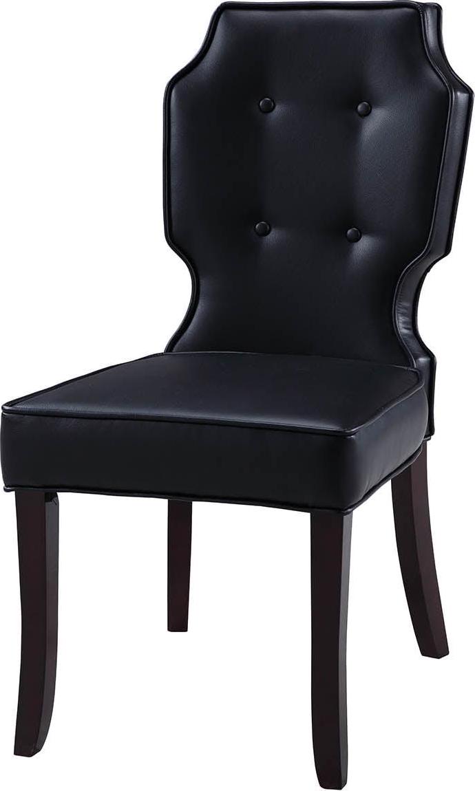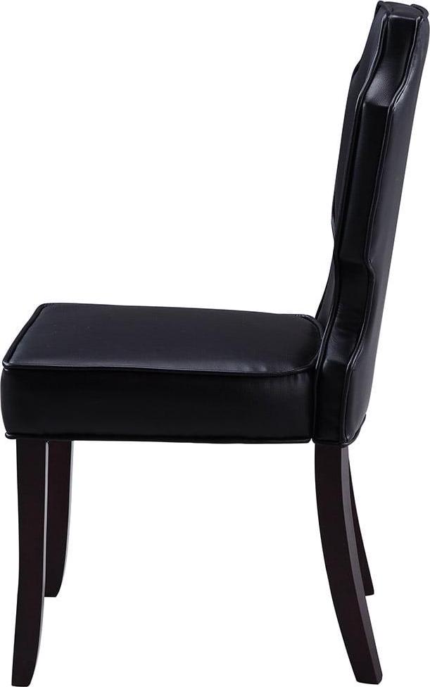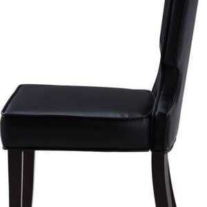 This is an updated interpretation of a classic dining chair. Design details abound from a gently sculpted solid – wood frame, upholstered beautifully in luxurious PU leather. Dark espresso finished legs complete the refined look that will complement a dining table or living area. Includes 2 Dining Side Chairs Specifications Color: Black Product Length: 25 Product Width/Depth: 19 Product Height: 38 Materials: PU leather upholstery, multi density foam seating, espresso finished wood frame Fabric and Design Premium quality pebble grain PU leather upholstery Elegant armless design Clean lines and softness create a look that fits a traditional or contemporary interior décor Features Luxurious plush multi density cushioning to relax in comfort and style Built to last with premium fabrics, materials, and expert craftsmanship Care Instructions Spot clean only This images we display have the most accurate color possible. However, due to differences in computer monitors, we cannot be responsible for variations in color between the actual product and your screen.