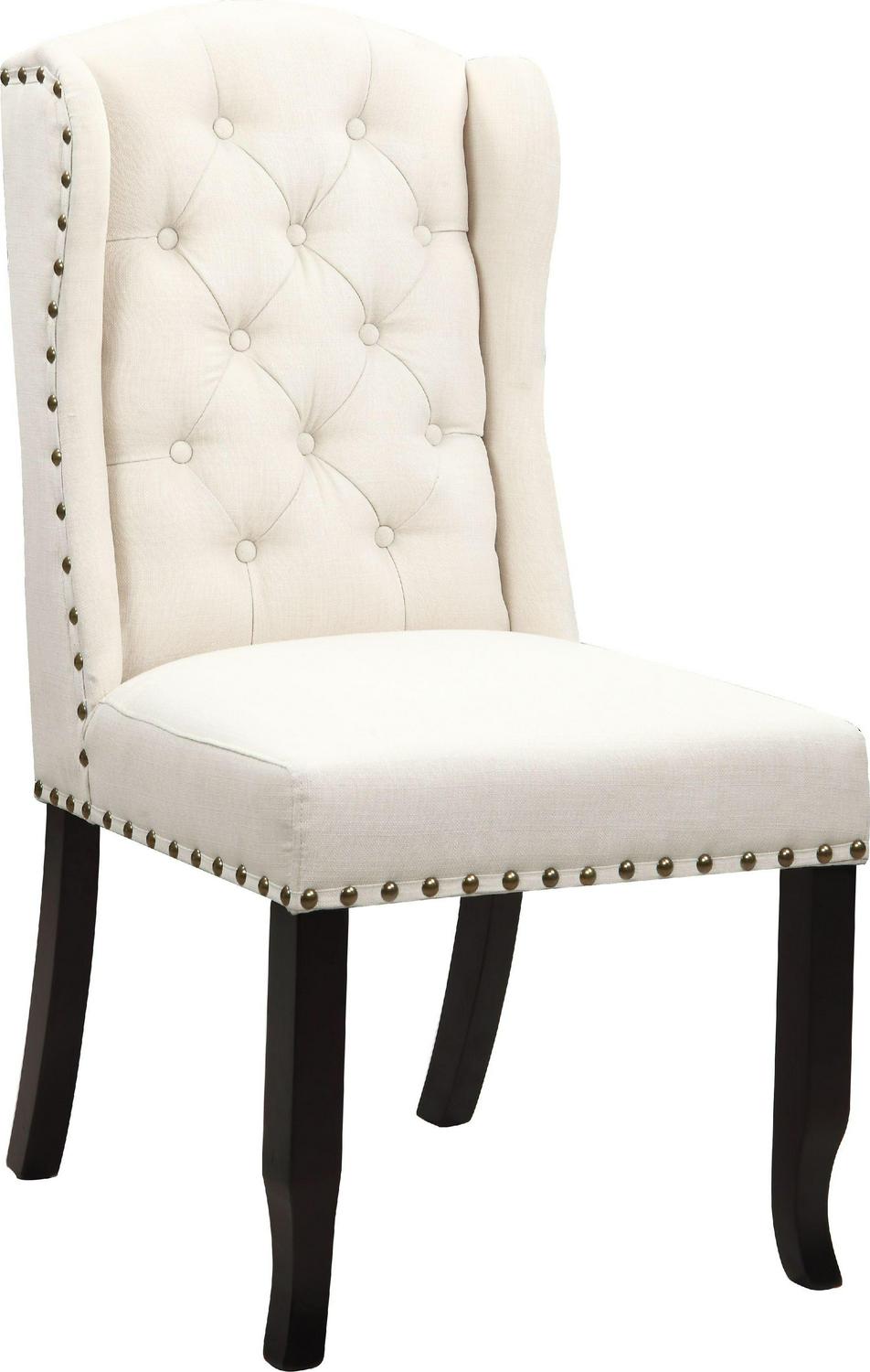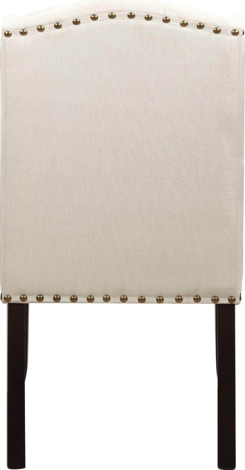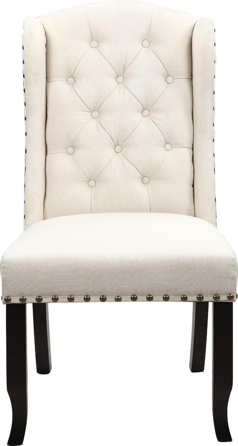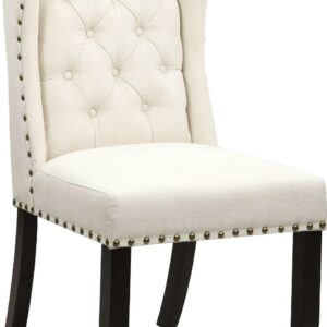 This is an updated interpretation of a classic dining chair. Design details abound from its wingback look and luxurious faux linen upholstery all around to its diamond button tufting. Tapered espresso finished solid wood legs and gold nailhead trim complete the refined look that will complement a dining table or living area.