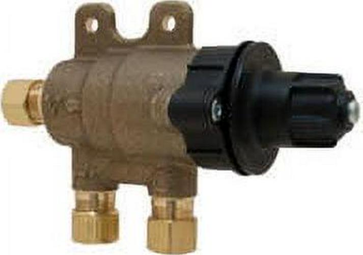 ECAST Thermostatic Mixing Valve Design Standard 3/8″ Compression Inlets and Outlet Integral inlet check valves to protect against cross-flow Adjustment cap with locking feature Brass Body Construction Corrosion resistant internal components Thermostatic Wax Element Design Thermostat controls both hot and cold water Installs between the stop valves and the faucet – Manufacturer: Chicago Faucets
