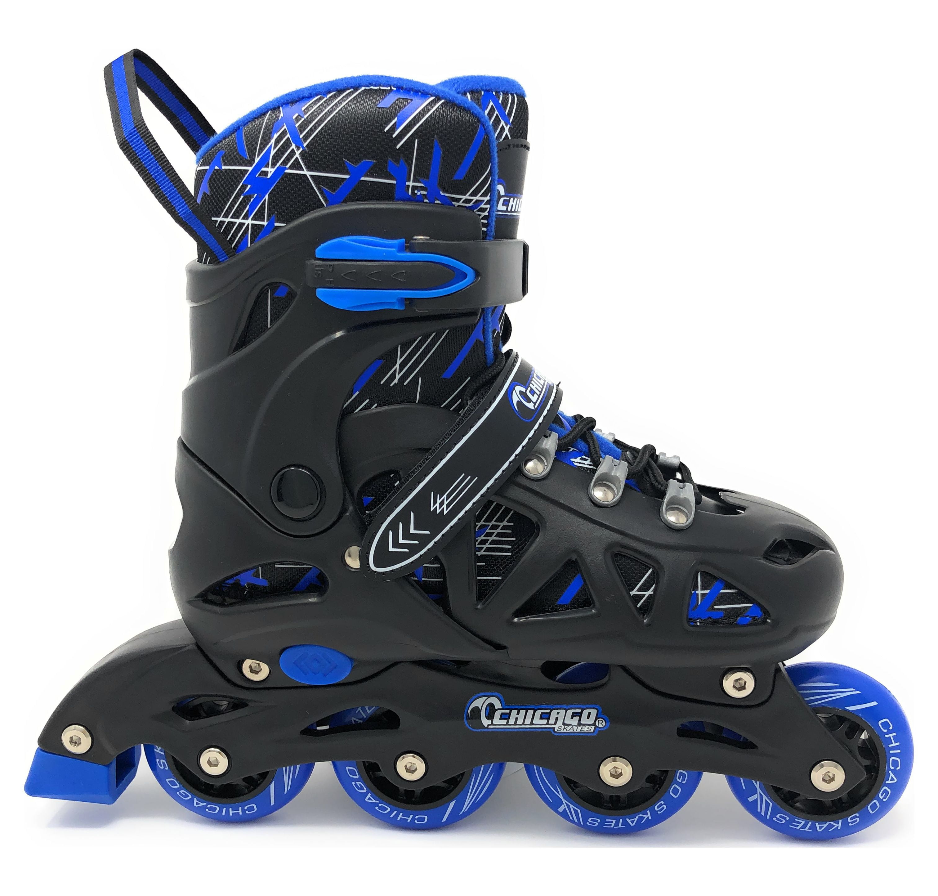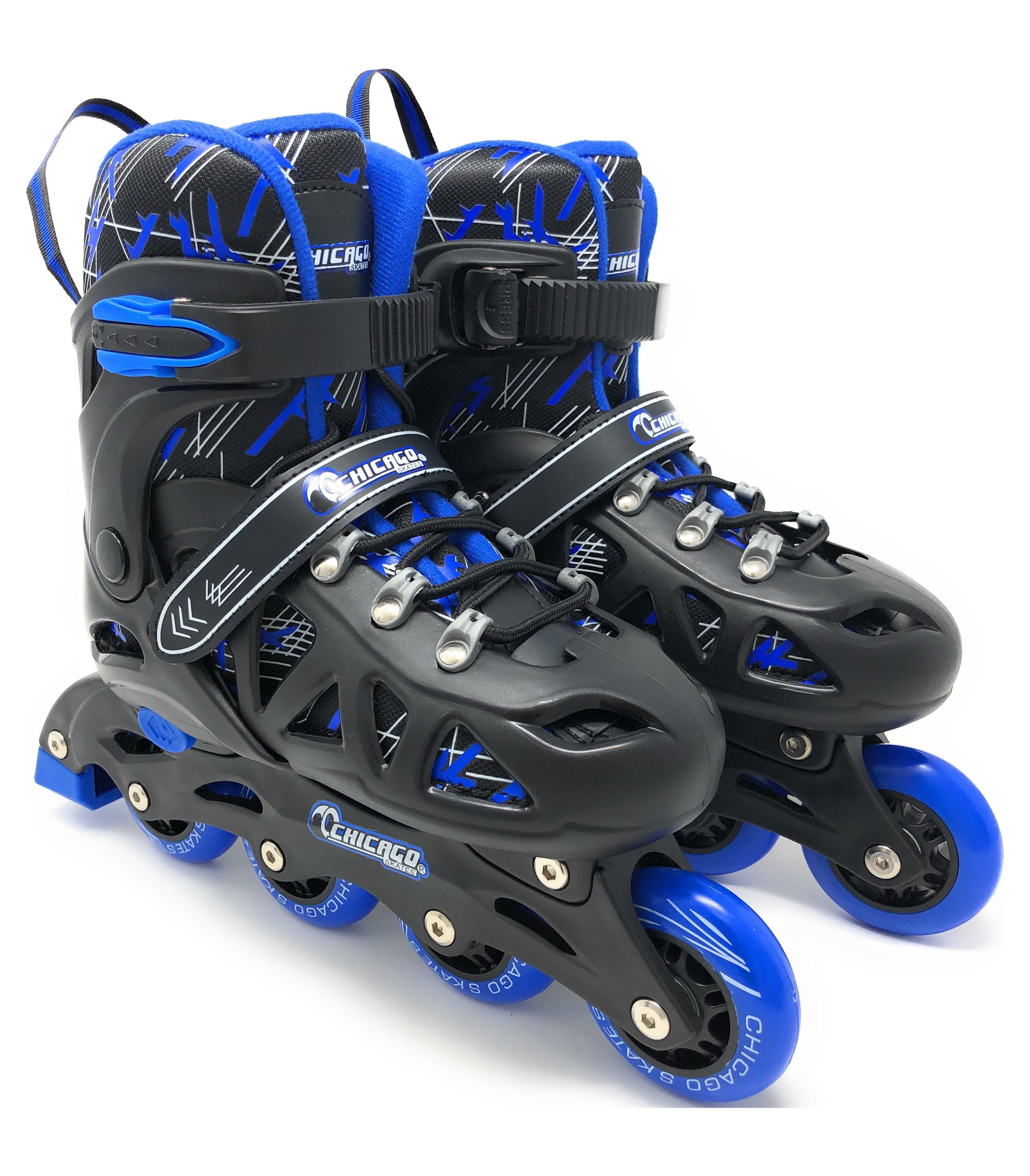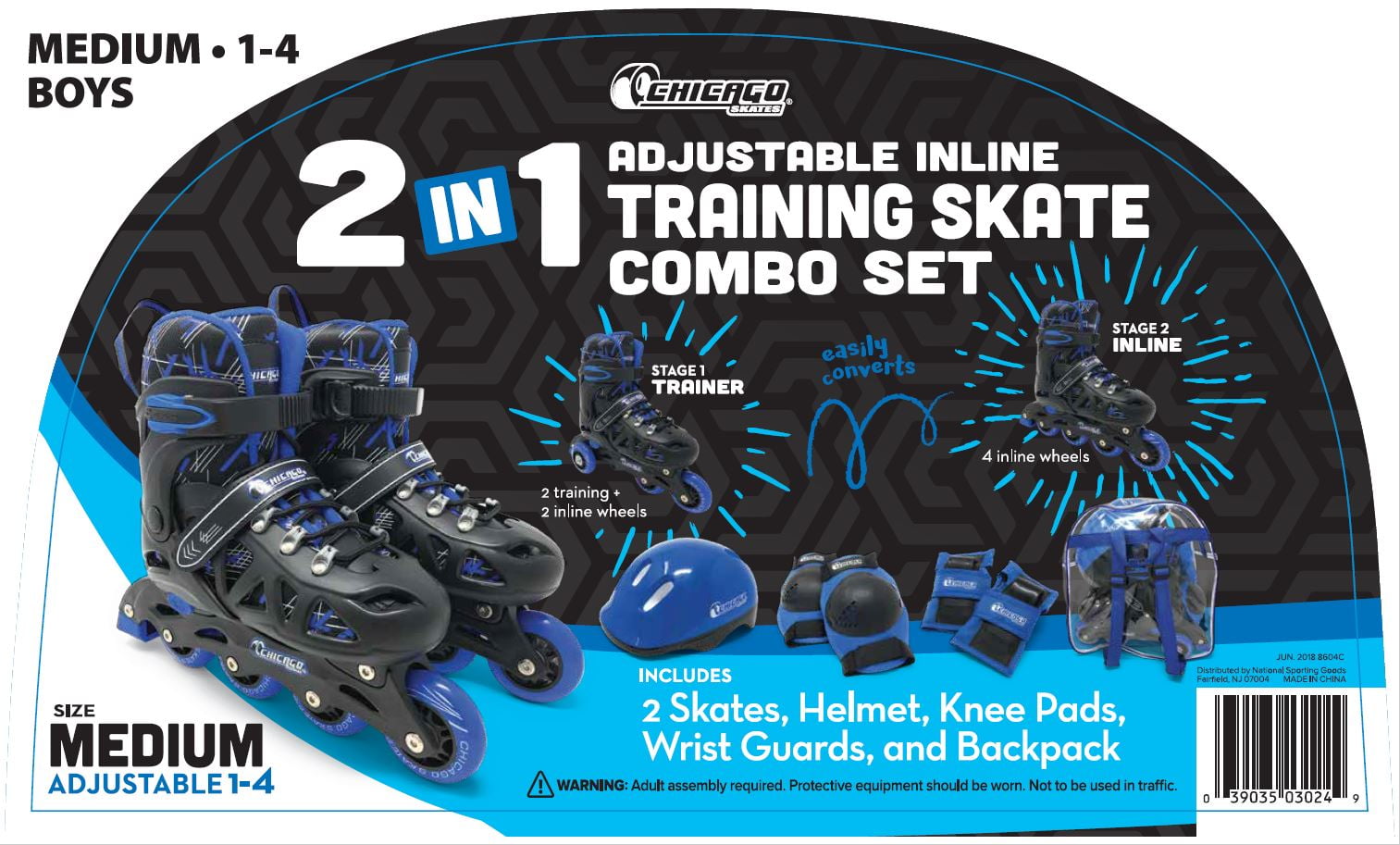 Learn to skate: Start your young one’s training out right with the Chicago Skates Inline Training Skate Combo Set that includes everything you’ll need to get started… a pair of convertible skates, a safety helmet, wrist guards, kneepads, and a backpack to carry it all Adjustable: The Chicago Skates Inline Training Skates easily convert from double rear wheel training skates to traditional inline skates and can be adjusted 4 full shoe sizes to grow with your child. Comfortable and Secure: The laces, ankle strap and easy-adjusting micro ratchet buckle secure the skates firmly to your feet while the soft inner boot cushions the legs to absorb the stress while skating. Stability & Control: Equipped with 64mm indoor/outdoor wheels and smooth 608z bearings your child will easily be able to roll around town while feeling safe and in control. SPECIFICS: Black/Blue/White. Adjustable youth size Medium (1 – 4). Chicago Skates – the leading brand in the skating industry for over 100 years. Includes a 30-day manufacturer’s warranty.