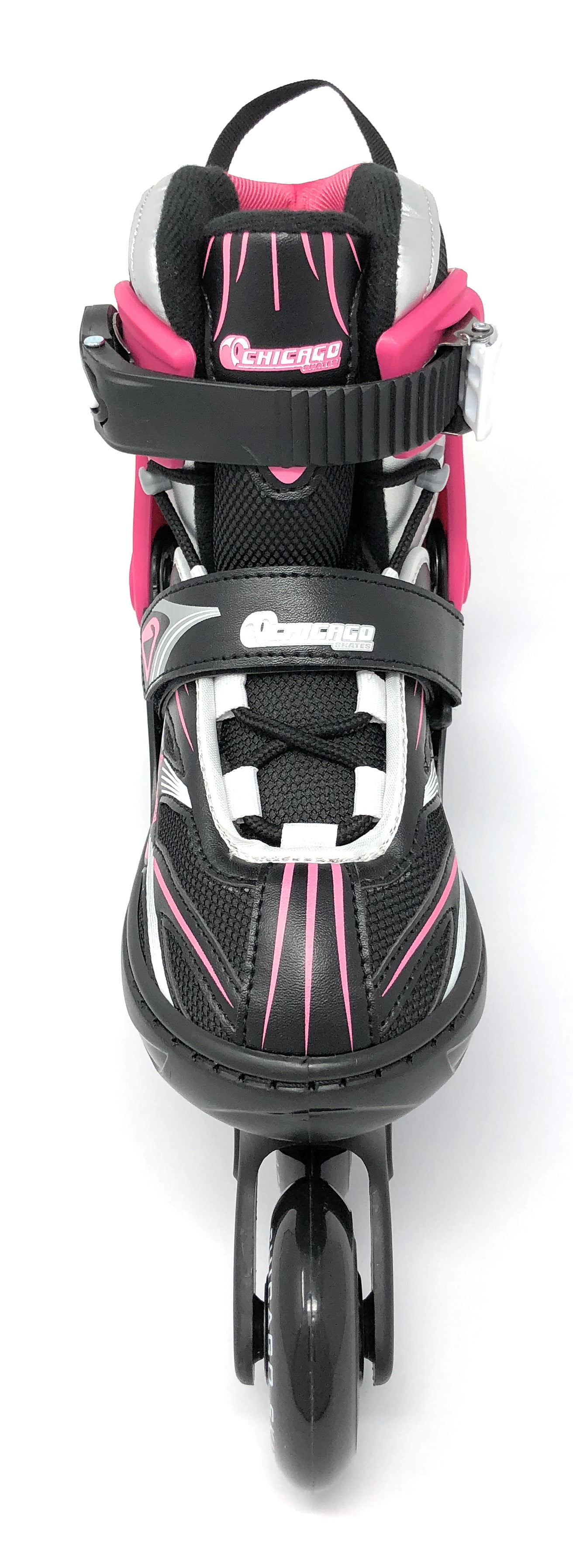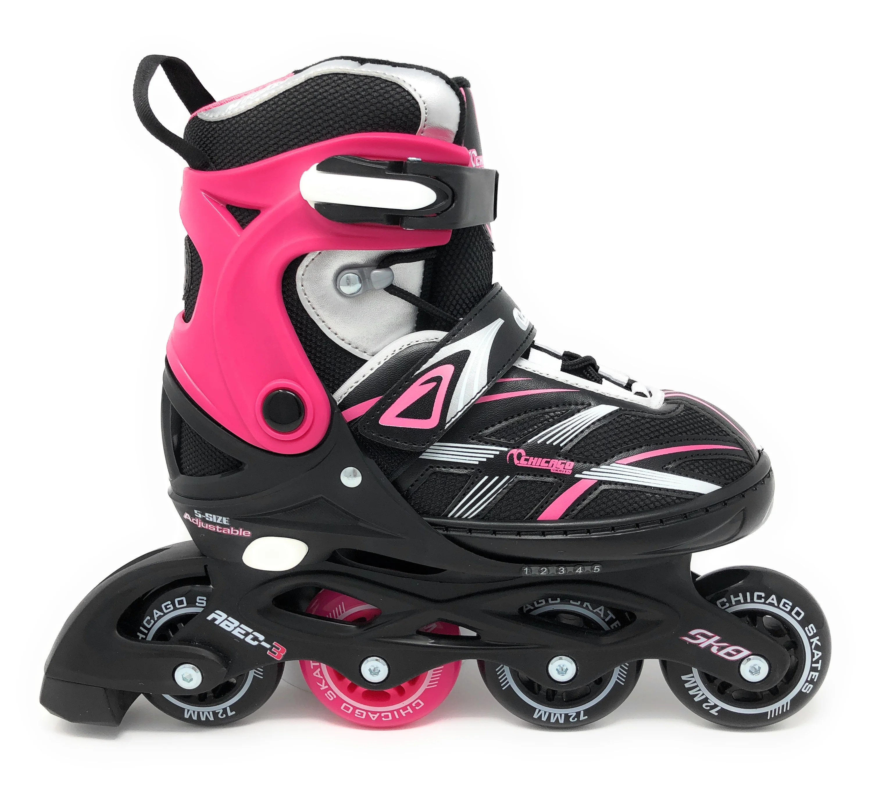 Chicago Skates Girls Five Size Adjustable Inline Skates Black/Pink/Silver: Adjustable inline skates: Enhanced by multi-size push-button adjustments; the Chicago Blazer inline skates allow for effortless proper adjustments to accommodate growing feet. Adjust 5 full shoe sizes. For the young speedster: Great for beginners yet tailored for the intermediate to the advanced skater who is looking for torsional stiffness and superior performance. Developed for fitness, designed for fun. Comfortable and secure fit: Nylon meshes inner boot delivers breathability, two-piece vented boot with pivoting collar, speed-lace closures with micro ratchet buckle, and power strap. Stability & control: These high-quality speed skates provide excellent traction and stability featuring nylon chassis with 70 mm 82a high-rebound urethane wheels with ABEC-3 rated speed bearings. Stylish: Roll in style! The contrast stitching and trim give these skates a stylish sleek look. Specifics: Pink/Black/White. Adjustable size Large (5 – 9). Chicago Skates – the leading brand in the skating industry for over 100 years. For The Young Speedster: Great for beginners yet tailored for the intermediate to the advanced skater who is looking for torsional stiffness and superior performance. Developed for fitness, designed for fun. Comfortable And Secure Fit: Nylon meshes inner boot delivers breathability, two-piece vented boot with pivoting collar, speed-lace closures with micro ratchet buckle, and power strap. Stability & Control: These high-quality speed skates provide excellent traction and stability featuring nylon chassis with 70 mm 82a high-rebound urethane wheels with ABEC-3 rated speed bearings. Stylish: Roll in style. The contrast stitching and trim give these skates a stylish sleek look. Specifies: Pink/Black/White. Adjustable size Large (5 – 9).