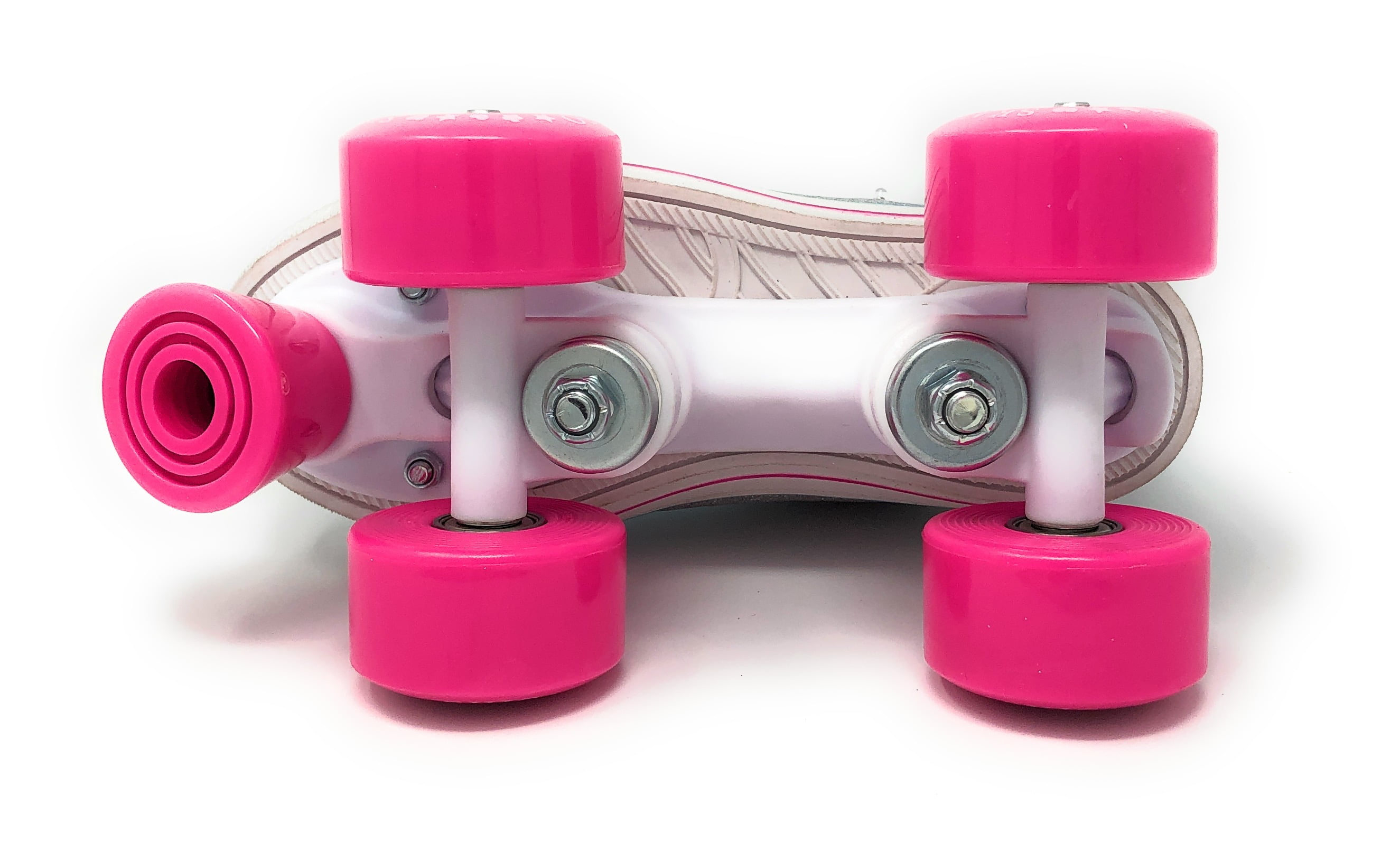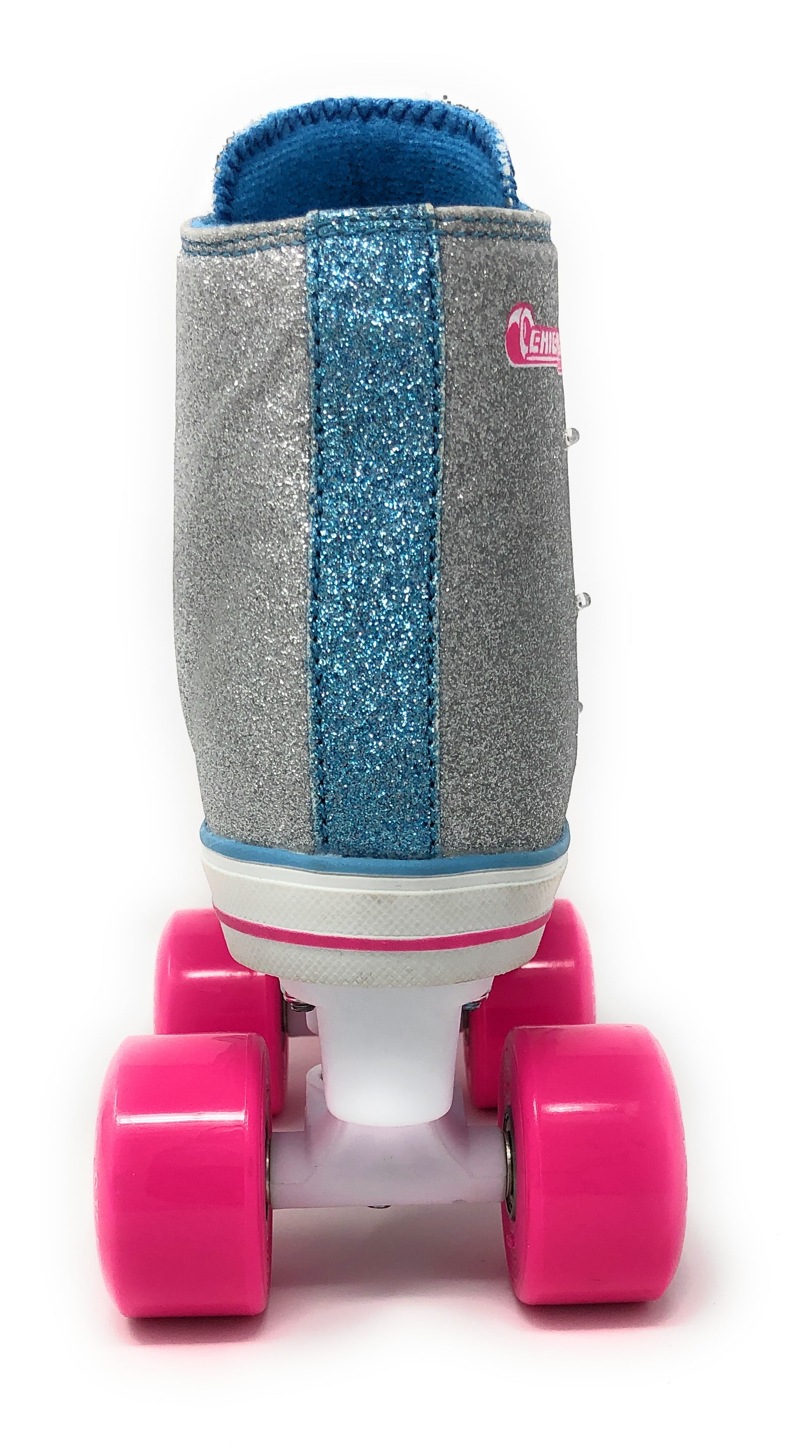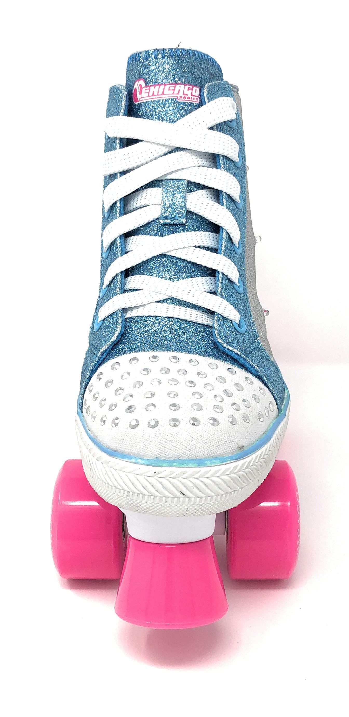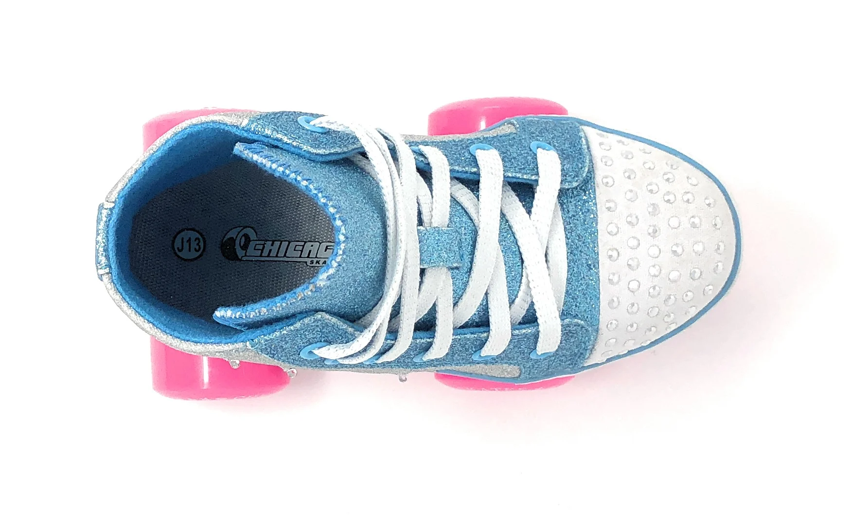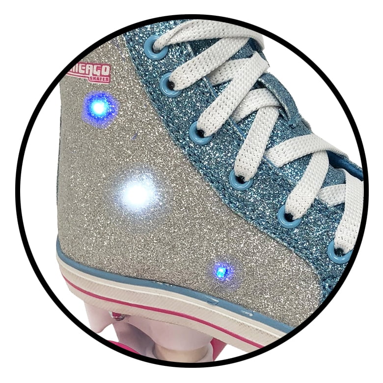 Glitter, sparkle, and shine. There is nothing like a pair of classic roller skates with timeless Chicago Skates design and now with our new junior fashion quad roller skates, you can be the star of the show. These sparkly skates with motion-activated led lights can be used in the roller rink, in the park, or on the sidewalk. Chicago stakes take pride in building the best quality skates for the entire family. Features of the quad glitter sparkle roller skates include adjustable toe stops, nylon chassis, dual action adjustable trucks, rink-style boots, smooth-rolling urethane wheels, and precision bearings.