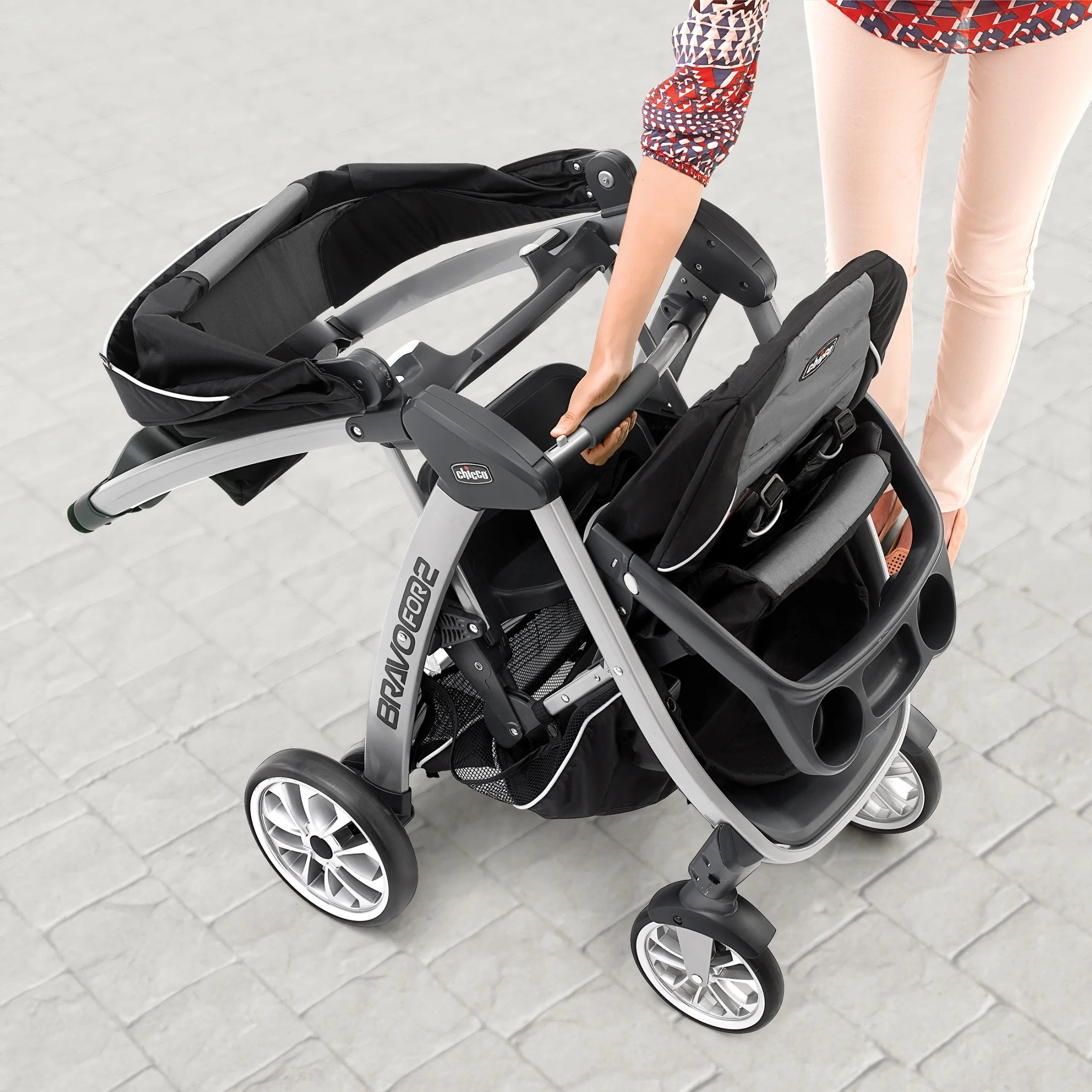 The Chicco BravoFor2 Standing/Sitting Double Stroller features a traditional padded stroller seat, five-point harness, large adjustable canopy and removable tray with two cup holders. For infants, the stroller seat folds forward to accept any Chicco infant car seat with easy click-in attachment (car seat sold separately). For older siblings, the BravoFor2 is outfitted with a bonus back seat and platform where big kids can choose to sit or stand. The seat folds away easily when unoccupied and includes a three-point harness for security. Easy-grip handles provide added stability for standing and a backrest gives extra support. The BravoFor2 is designed with a one-hand, ultra-compact quick fold. An integrated handle easily activates the fold and simultaneously rotates the front wheels inward to keep the folded unit standing. Once the stroller is closed, the fold handle also doubles as a carry handle. Treaded rubber tires, full suspension and front swivels help maintain a smooth ride. One-touch brakes keep the stroller in place when parked. A padded handle, parent tray with two cup holders and large storage basket with front and rear access provide added convenience.