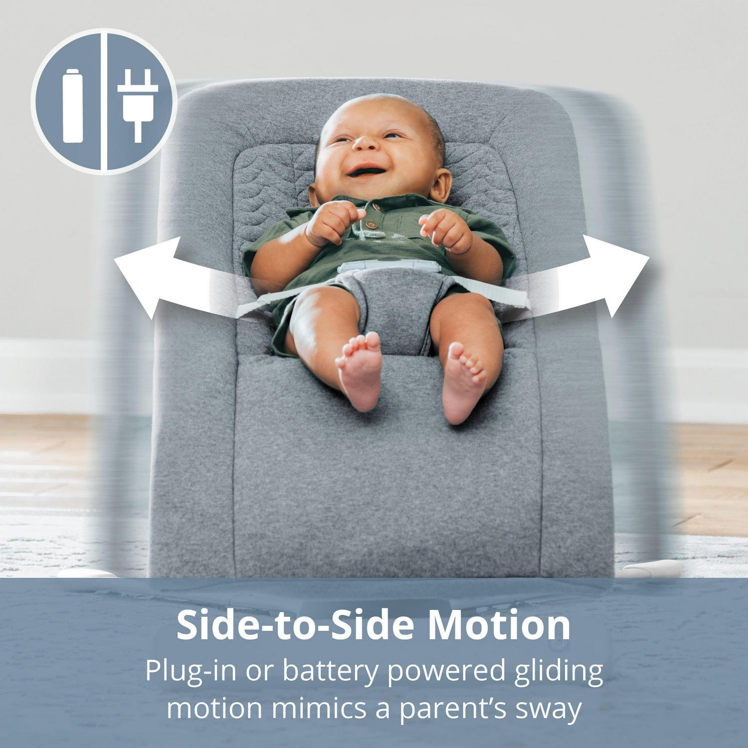 When you want your baby close but need some hands-free moments around the house, the E-Motion Auto-Glider & Bouncer is an ideal choice. While gently cradling your little one, the automated glider provides a comforting side-to-side glide that mimics a parent s sway. The timer offers 10 minutes of uninterrupted swaying while advanced motion-sensing technology can restart the timer with a gentle nudge or baby s natural movement. In addition to movement, E-Motion features soothing sounds including four nature sounds and three melodies. AC and battery-operated options keep the E-Motion moving wherever you are. Switch modes to standard bouncer to put your little one in control of the action.