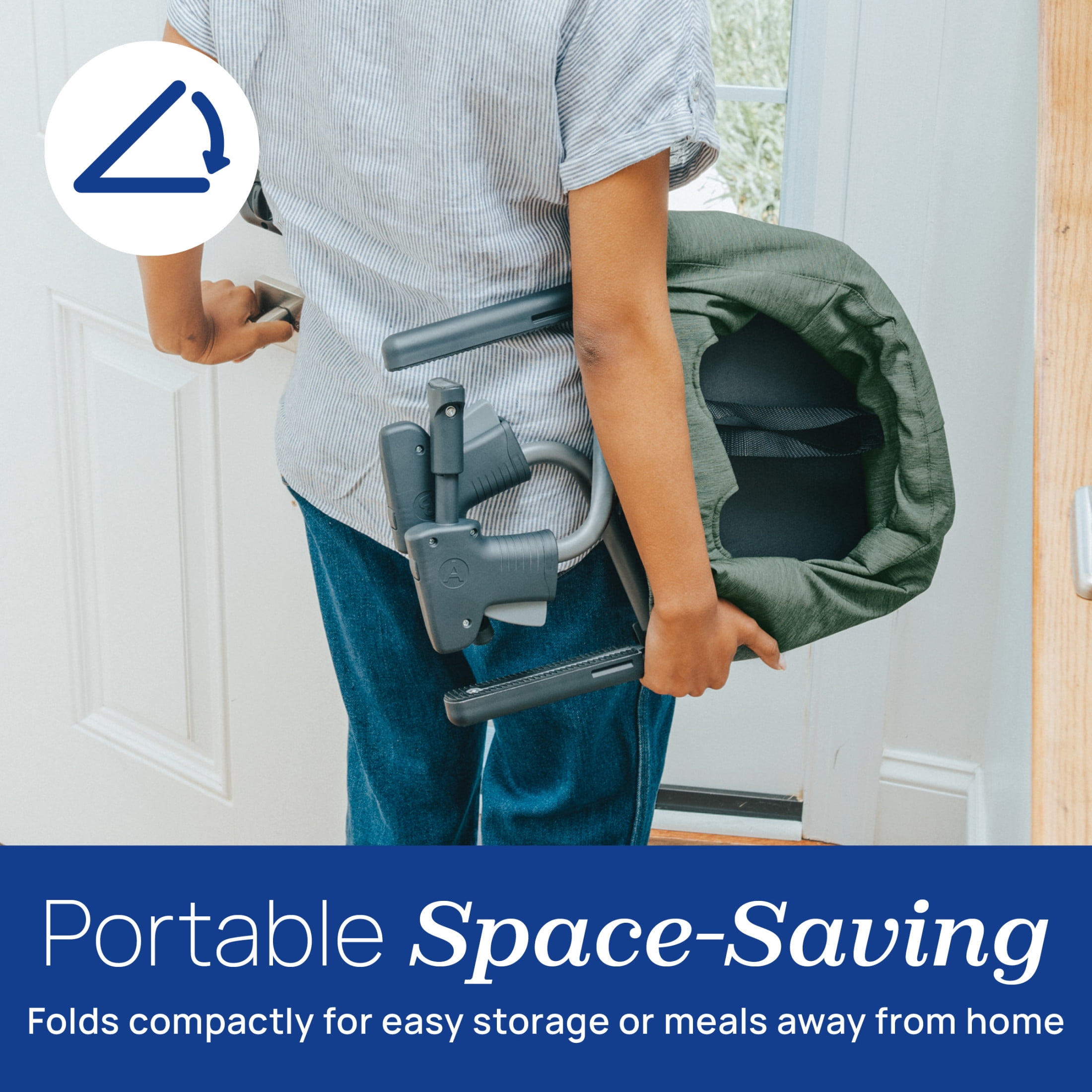 FastLock® clamps ensure a tight and secure fit to table in seconds Rubberized feet enhance grip and protect table from scratches or scuffing Featuring eco-friendly fabric made from recycled plastics Soft-grip arms firmly clamp onto the top of the table without scratching Compatible with most tables and navigates table skirts up to 5.25” thick Removeable seat pad is wipeable and machine washable Space-saving seating takes up less room than a traditional highchair Folds compactly for easy storage or meals away from home The Moss fashion features a durable ripstop fabric in an earthy olive green hue.