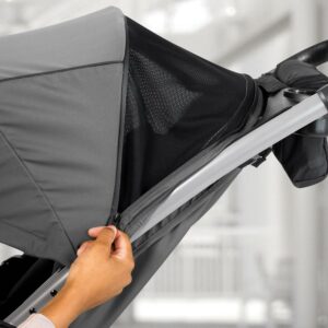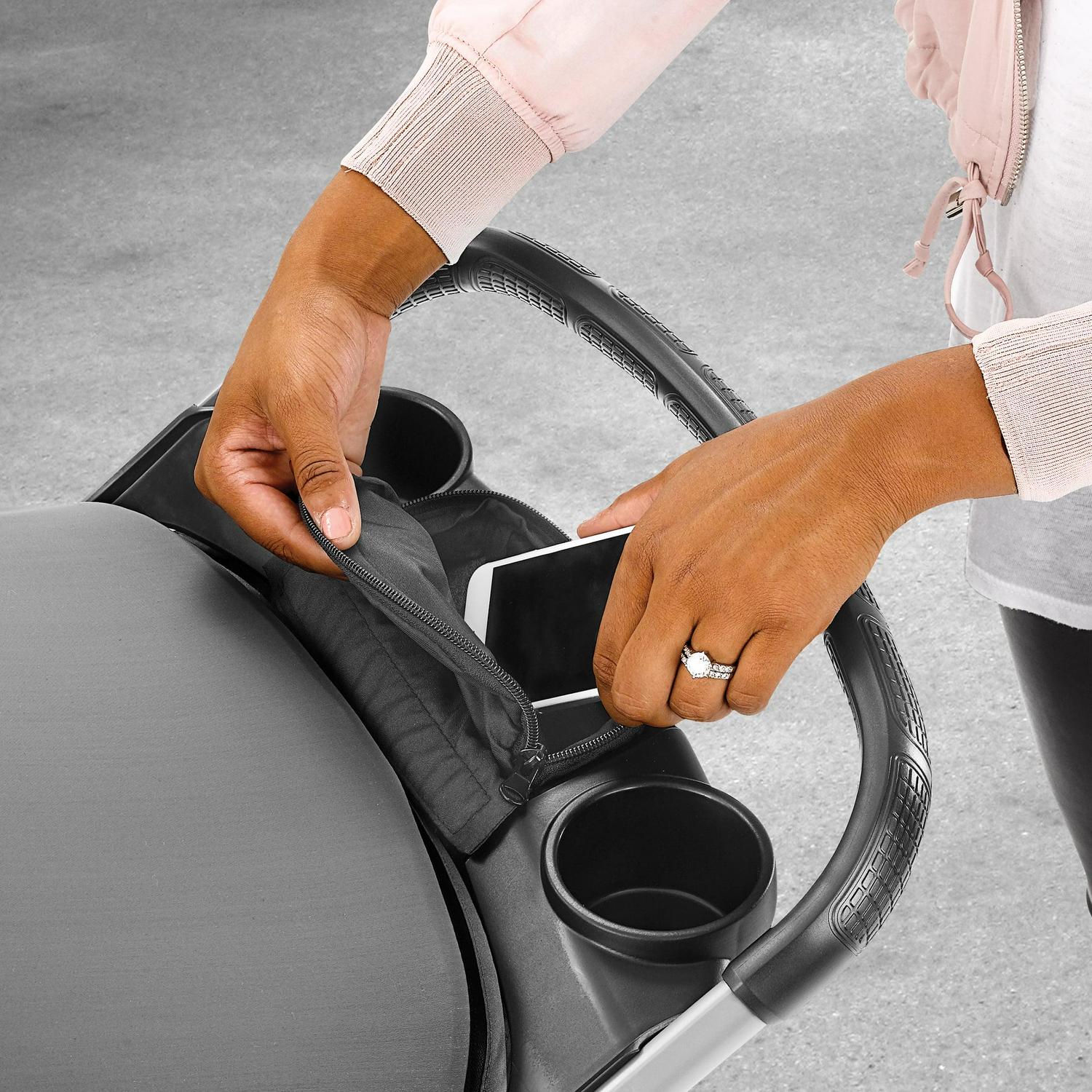 Thoughtful design offers a smooth ride with swivel wheels and secure parking with toe-tap brakes. An easy-grip handle and parent tray with two cup holders and zippered storage put comfort and convenience at your fingertips. A large basket stows must-haves down below. A detachable child tray, 3-position backrest, and adjustable UPF 50+ canopy with mesh extension panel help make every ride more comfortable.
