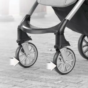 Thoughtful design offers a smooth ride with swivel wheels and secure parking with toe-tap brakes. A padded handle and parent tray with two cup holders put comfort and convenience at your fingertips, and a large basket stows must-haves down below.