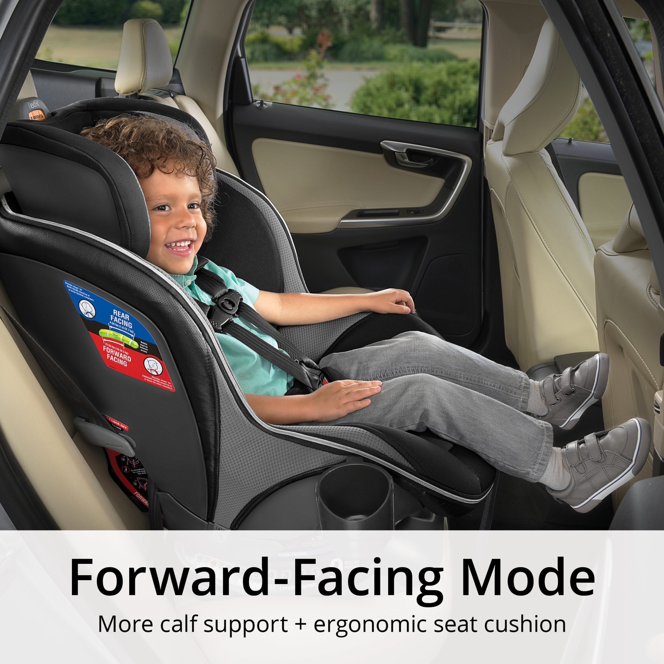 Comfortably maximizes rear-facing use with 25% more legroom* and a 50 lb. weight limit Offers more calf support in forward-facing mode for older children up to 65 lbs. Easy-care zip & wash seat pad 3D AirMesh backrest for ventilation and comfort 9-position Easy-Extend Headrest System with one-hand adjustment DuoGuard® head and torso protection with a deep rigid shell and EPS energy-absorbing foam; steel-reinforced frame Premium LATCH connectors and SuperCinch® force-multiplying tightener Best in class, 9-position ReclineSure™ leveling system for improved vehicle fit and child comfort Dual RideRight™ bubble levels to verify seat angle LockSure® steel-reinforced seatbelt locking system Vero evokes cool, refreshing style with performance textiles and function. Surround your child in comfort with breathable 3D AirMesh knitted in a stylish silver hue. Layering texture on texture with a solid black knit, a striking light grey mélange knit, and premium black vegan leather accents, Vero delivers a comfortable ride with a premium automotive trim design.