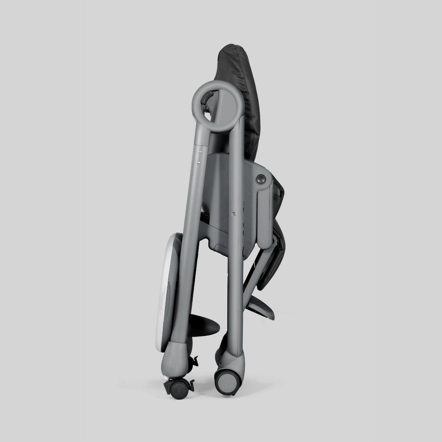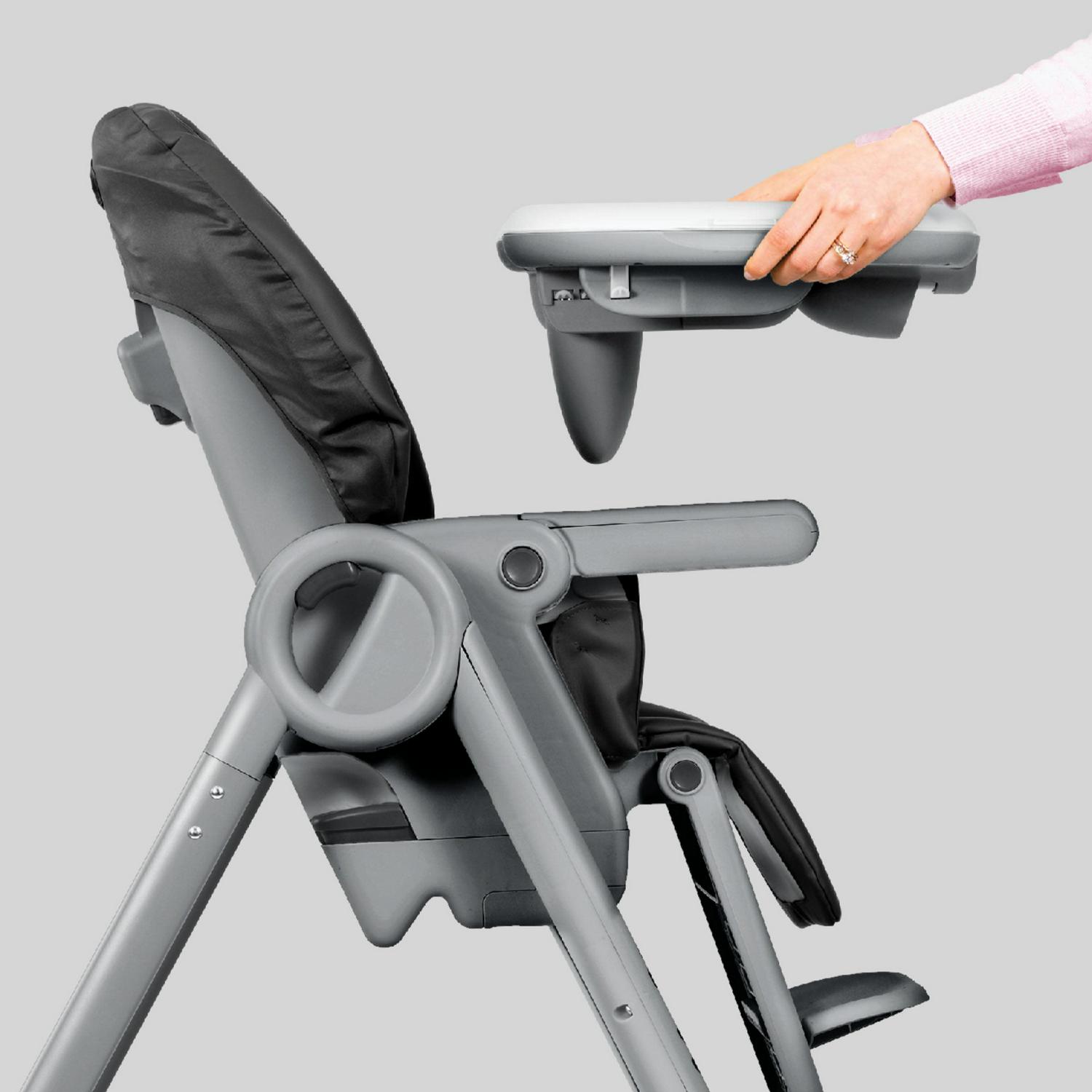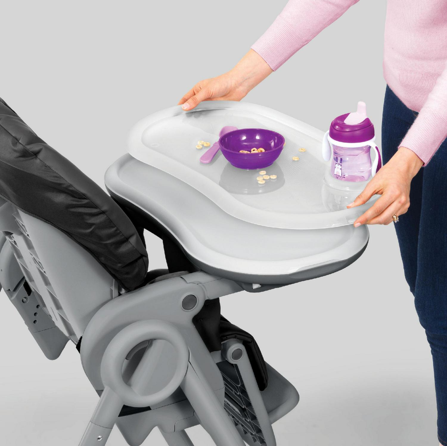 For meals away from the table, a large tray snaps easily onto the armrests, then slides neatly onto the rear legs for storage. A removable tray liner and soft wipeable seat pad offer easy-clean convenience, and rubberized rear locking swivels navigate from room to room without marking floors. The Polly2Start also folds compactly for storage between meals.