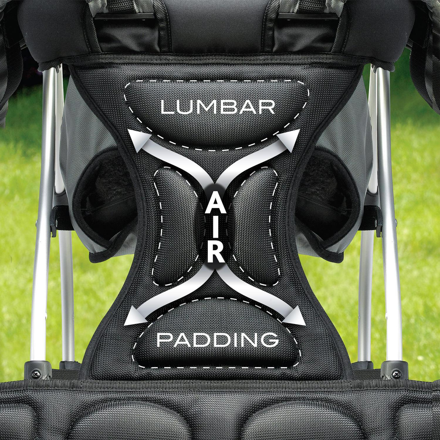 For parents, a lightweight aluminum frame, with padded waist and shoulder straps and energy-absorbing lumbar, helps reduce strain on the back and shoulders. The unique shape of the lumbar is designed to increase airflow and provide ventilation for more comfortable adventures together.