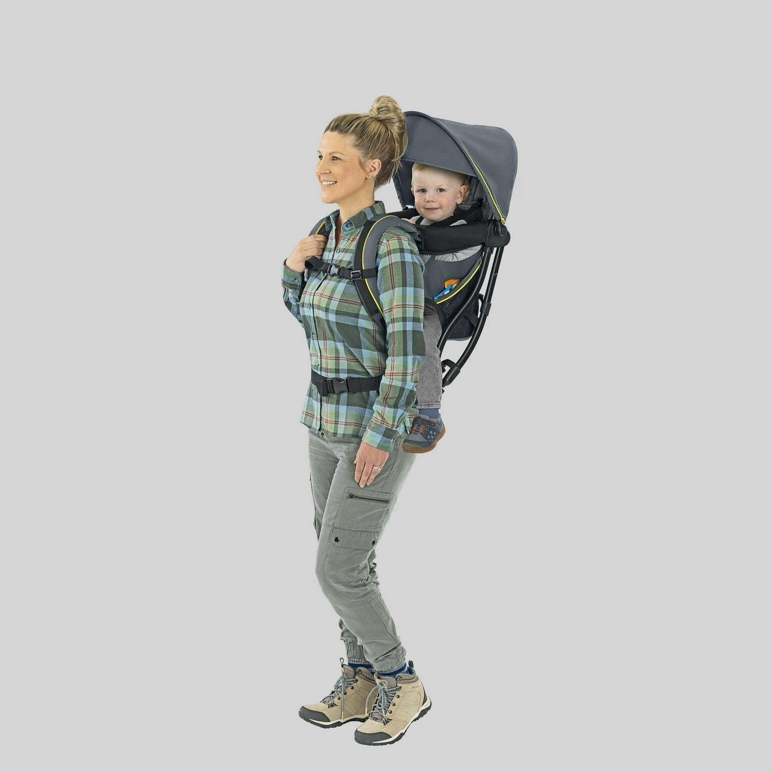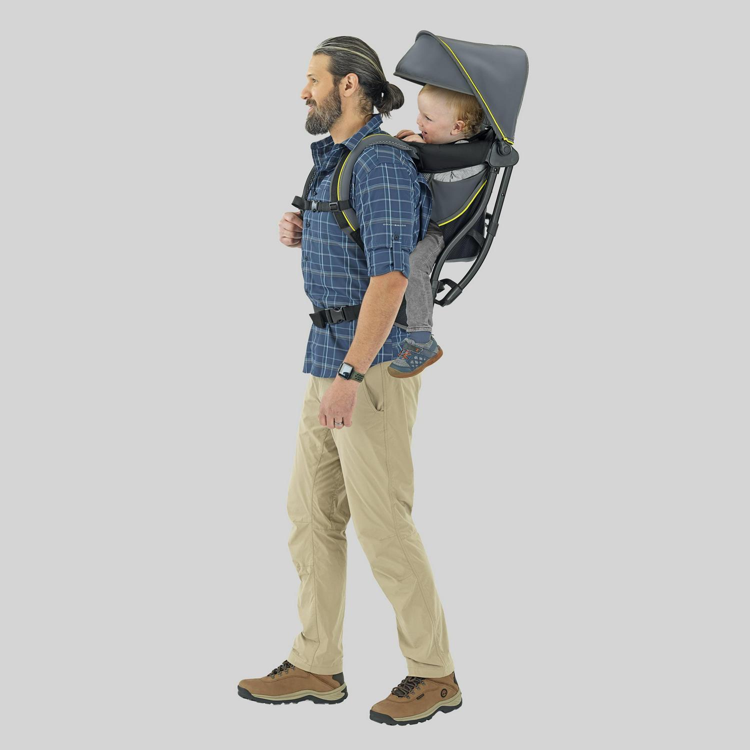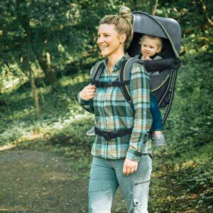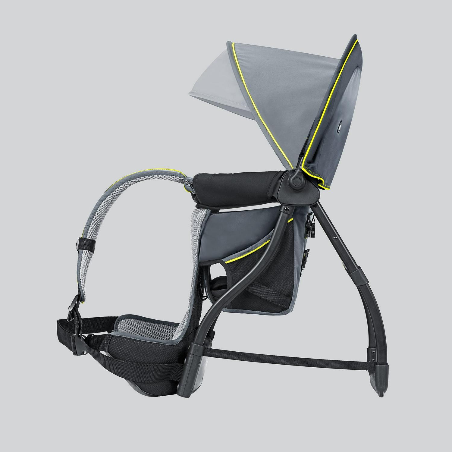 For the adult wearer, padded ergonomic shoulder and waist straps on the baby backpack carrier easily adjust to create a custom fit. The aluminum frame evenly distributes weight, while 3D breathable mesh on lumbar, back and straps offers increased ventilation, providing comfort for parents even in warmer temperatures. Convenient side pockets store snacks and small necessities.