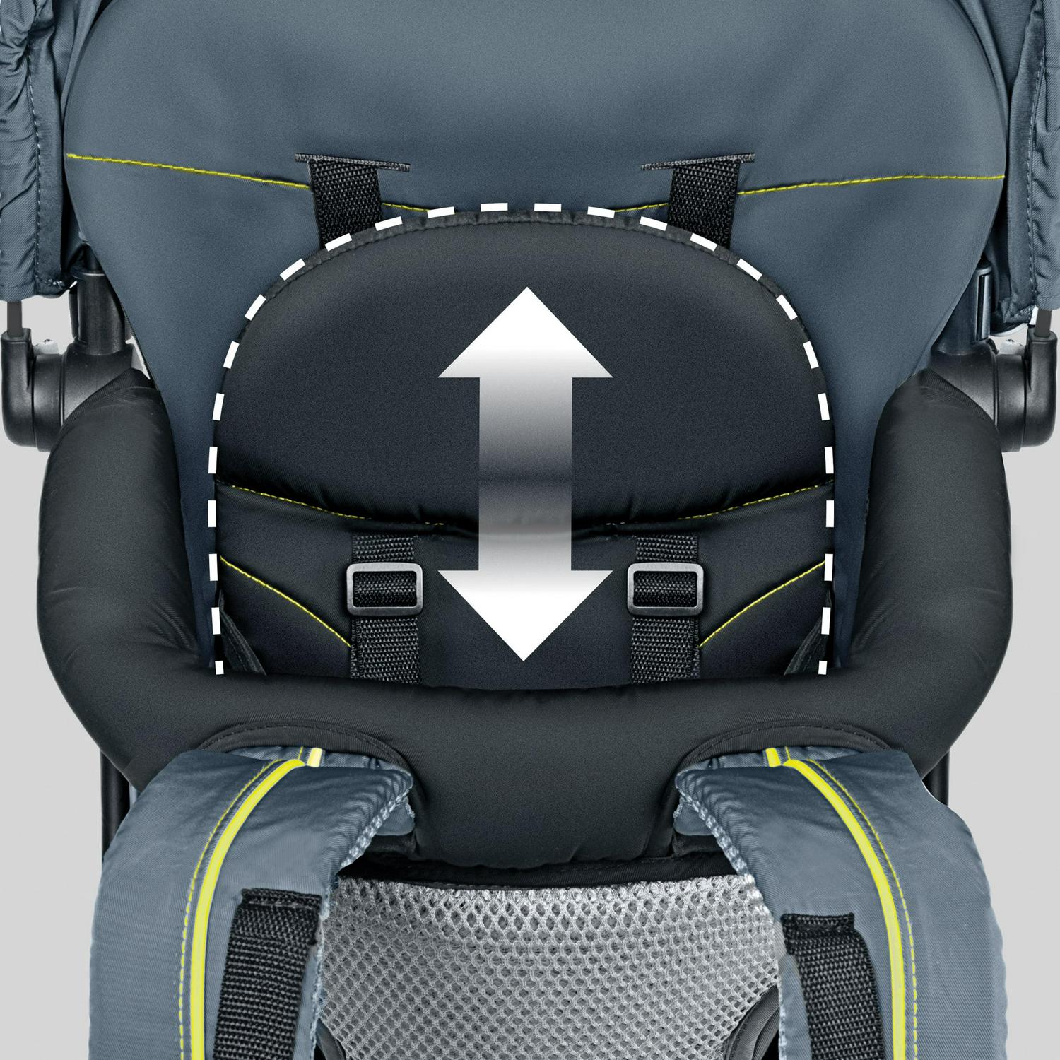 A two-position, height-adjustable seat with padded backrest offers a comfortable ride as your child grows, and the 5-point harness secures your little one, giving you confidence on variable terrain. An adjustable, UPF 50+ canopy with pull-out visor shelters baby from sun and light rain.