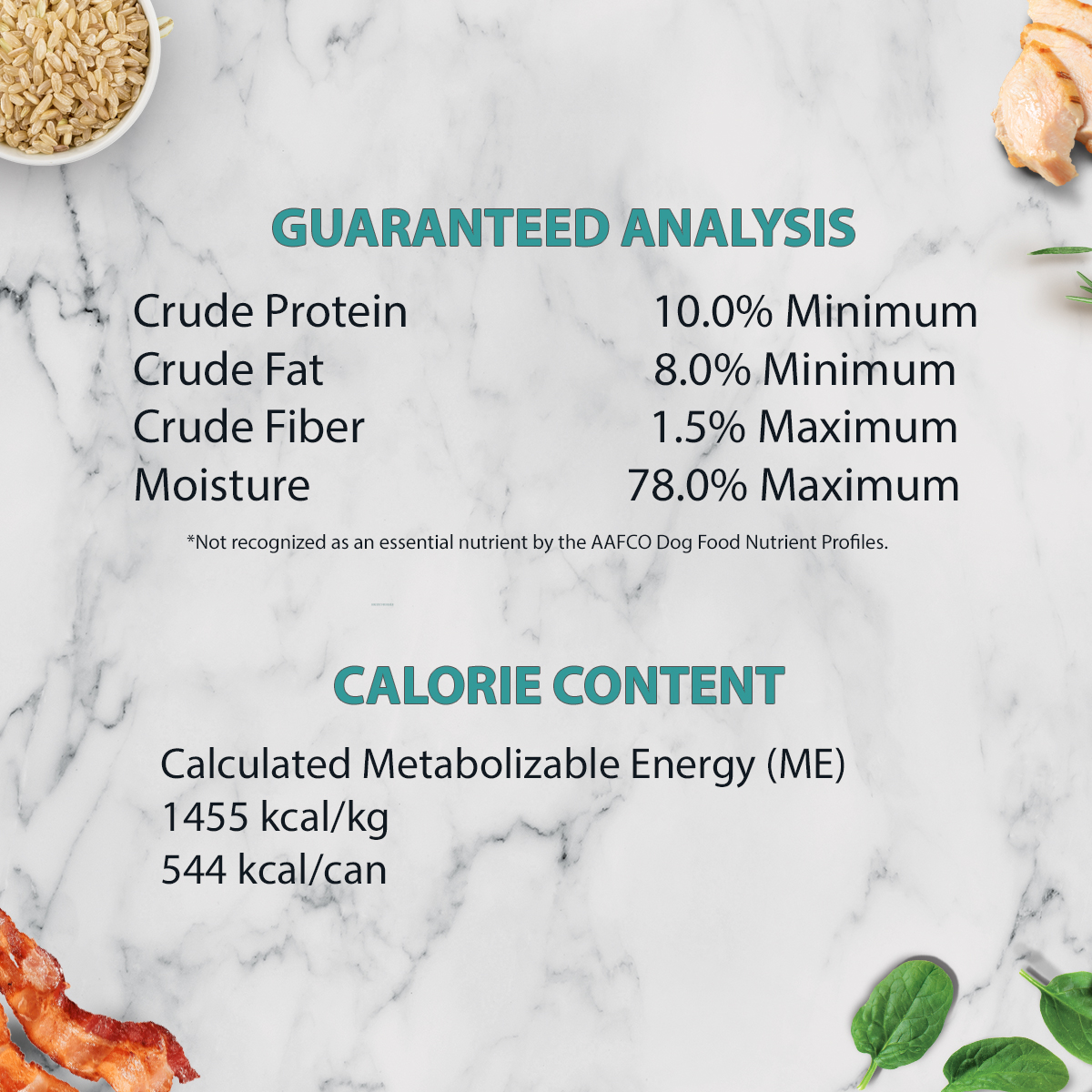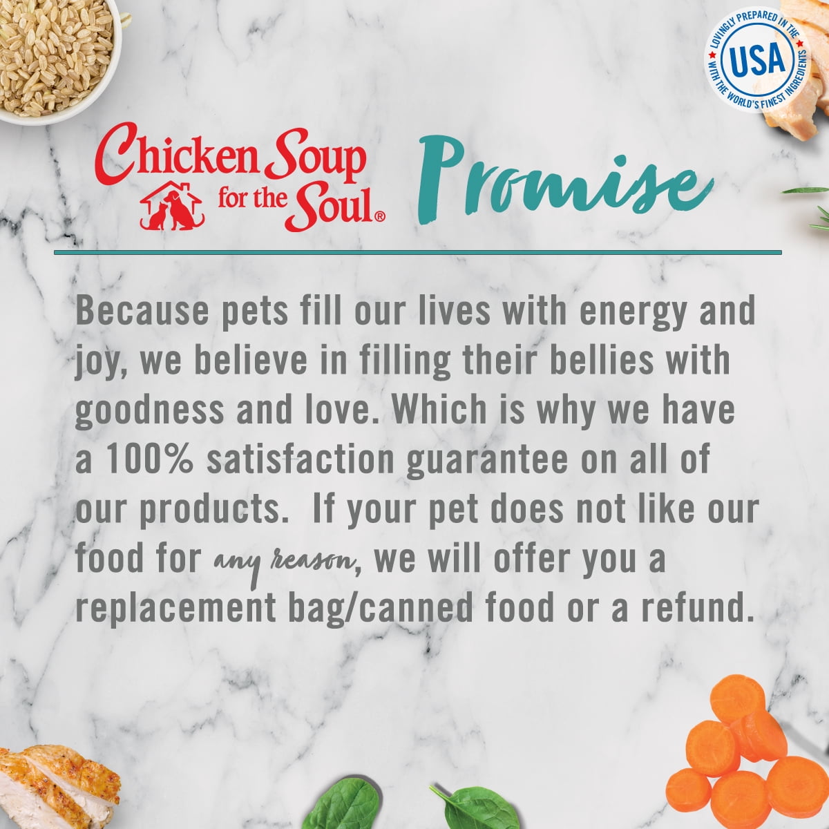 This Chicken Soup for the Soul Turkey & Bacon wet adult dog food recipe boasts real turkey and bacon presented in a rich pate texture that dogs adore. No by-product meals, corn, wheat, soy, artificial coloring, flavoring or preservatives. 100% Complete & Balanced, this pate meal can be served as an excellent stand-alone meal or a great supplement to dry kibble. Our premium pet food products have been available since 2004.
