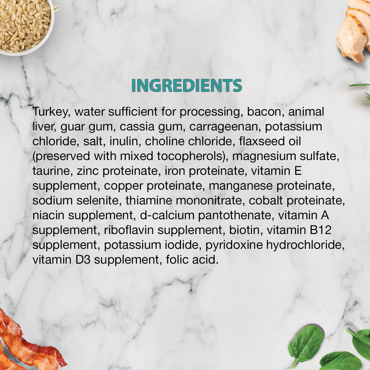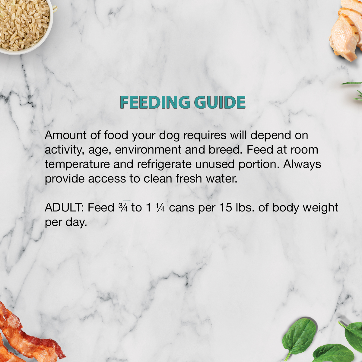Real Turkey & Bacon – proteins adult dogs devour! 100% Complete & Balanced to serve alone as a main meal or a tasty topper to kibble. Pate for a texture dogs love. No by-product meals. No wheat corn or soyNo artificial coloring, flavoring or preservatives. Premium Nutrition from a Name You Know & Trust since 2004
