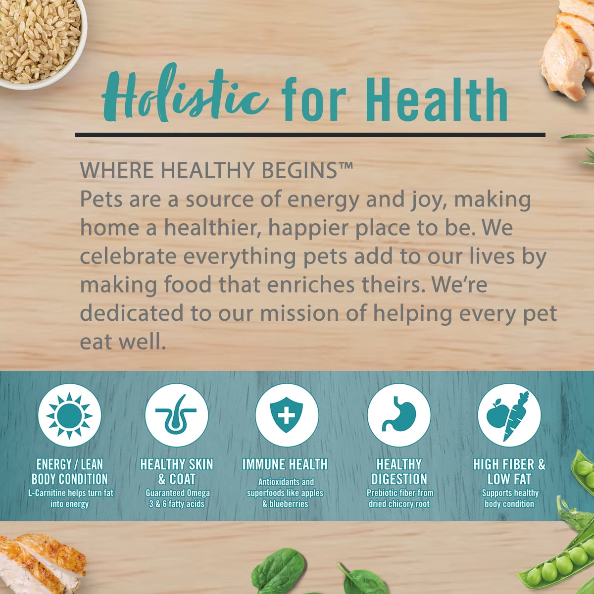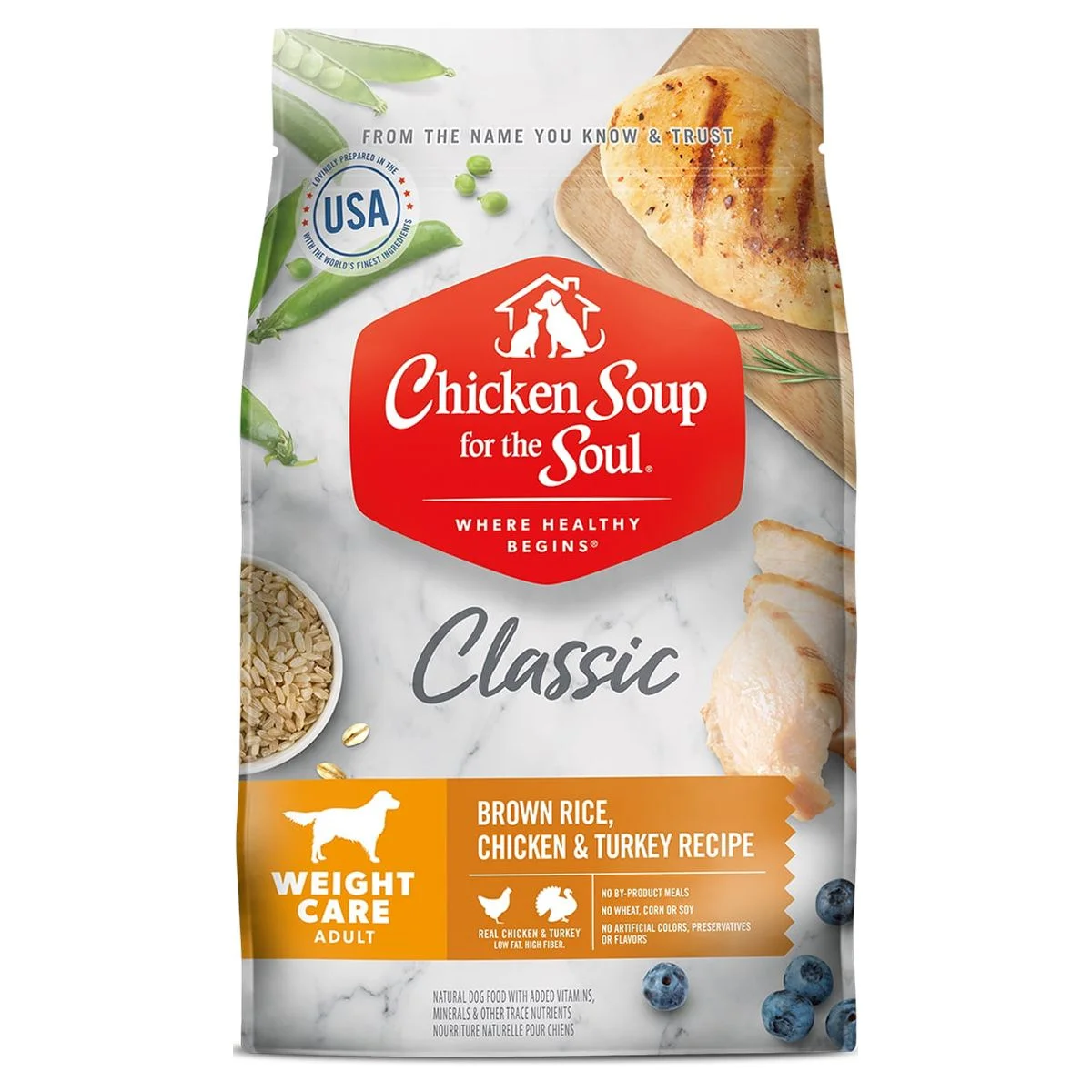 Give your adult dog the support he/she needs with Chicken Soup for the Soul Adult Weight Care Dry Dog Food. This food also aids healthy digestion with prebiotic fiber from dried chicory root and omega 3 and 6 fatty acids to promote healthy skin and coat. With no by-product meals, wheat, corn or soy, Chicken Soup for the Soul Adult Weight Care Dry Dog Food will keep your paw-tner looking and feeling good. Four (4) real animal proteins: CHICKEN, TURKEY, DUCK & SALMON blend for an irresistible taste! It contains real chicken as the first ingredient with antioxidants and superfoods like apples, blueberries and spinach help build immune health. This diet is high in fiber and low in fat to assist healthy body condition while L- carnitine helps turn fat into energy.