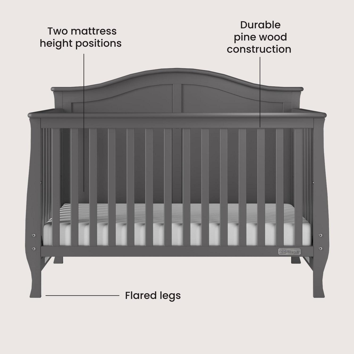 The Camden 4-in-1 Lifetime Convertible Fixed-Side Crib has timeless style and features a soft arched top, detailed cap rails, and flared legs, making it the perfect addition to any nursery. The Camden 4-in-1 convertible crib grows with your child by converting from a crib into a toddler bed, daybed, and full-size bed. The crib is constructed from selected woods with a strong, steel mattress support that will adjust to two heights.