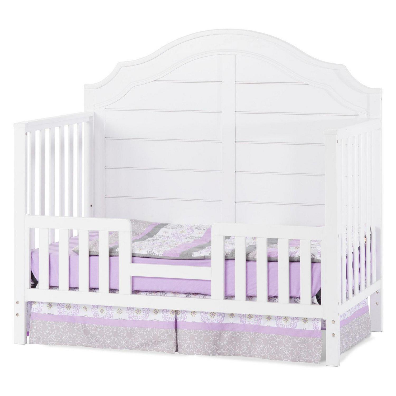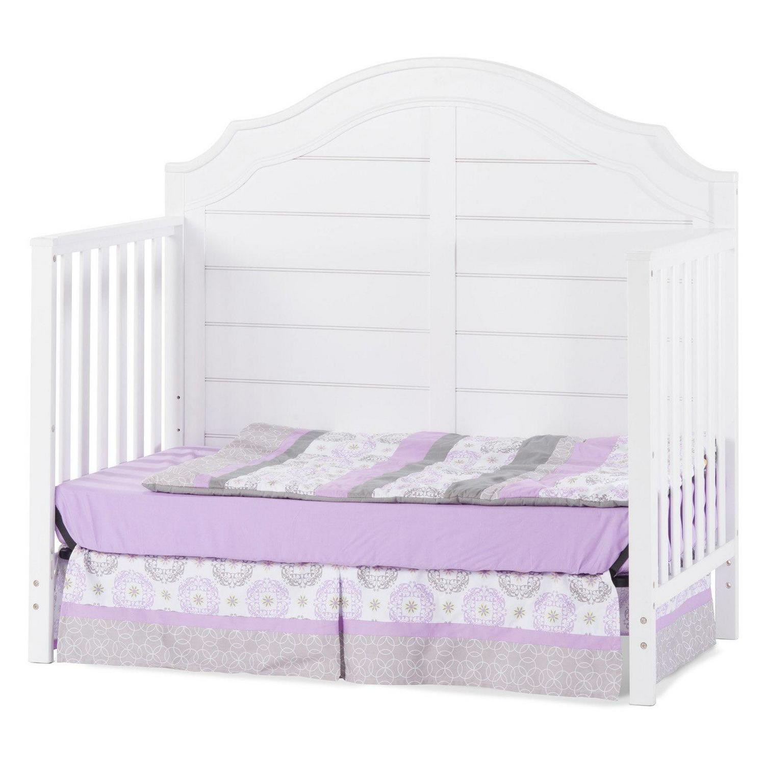 The Child Craft Penelope 4-in-1 convertible crib features classic scalloped edges and a paneled backdrop conveying a delightful cozy cottage vibe. The crib will look great through the years as it converts from a crib to a toddler bed, to a day bed, and finally to a full-sized bed. Designed with safety in mind Child Craft quality construction that will last. Made from wood and coated in a baby-safe, non-toxic finish.