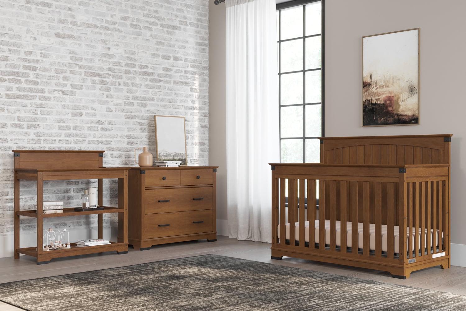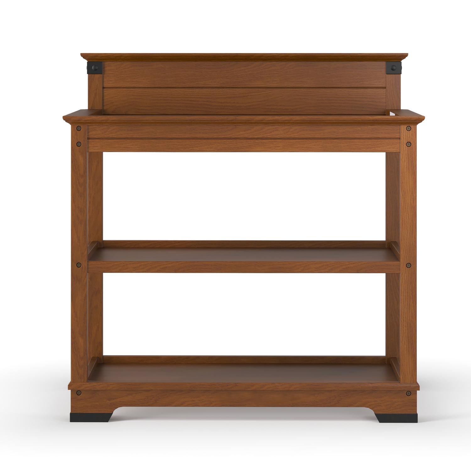 Classic lines and modern materials combine to inspire the Redmond Collection. You will love the versatility and style of the rich cherry finish and sturdy, craftsman-era hardware that create a unique, timeless collection that will impress for years to come. The changing table features two shelves for extra storage, wrought iron style hardware and accents, and it includes a dressing pad with security strap and buckle. Quality construction will last for years.