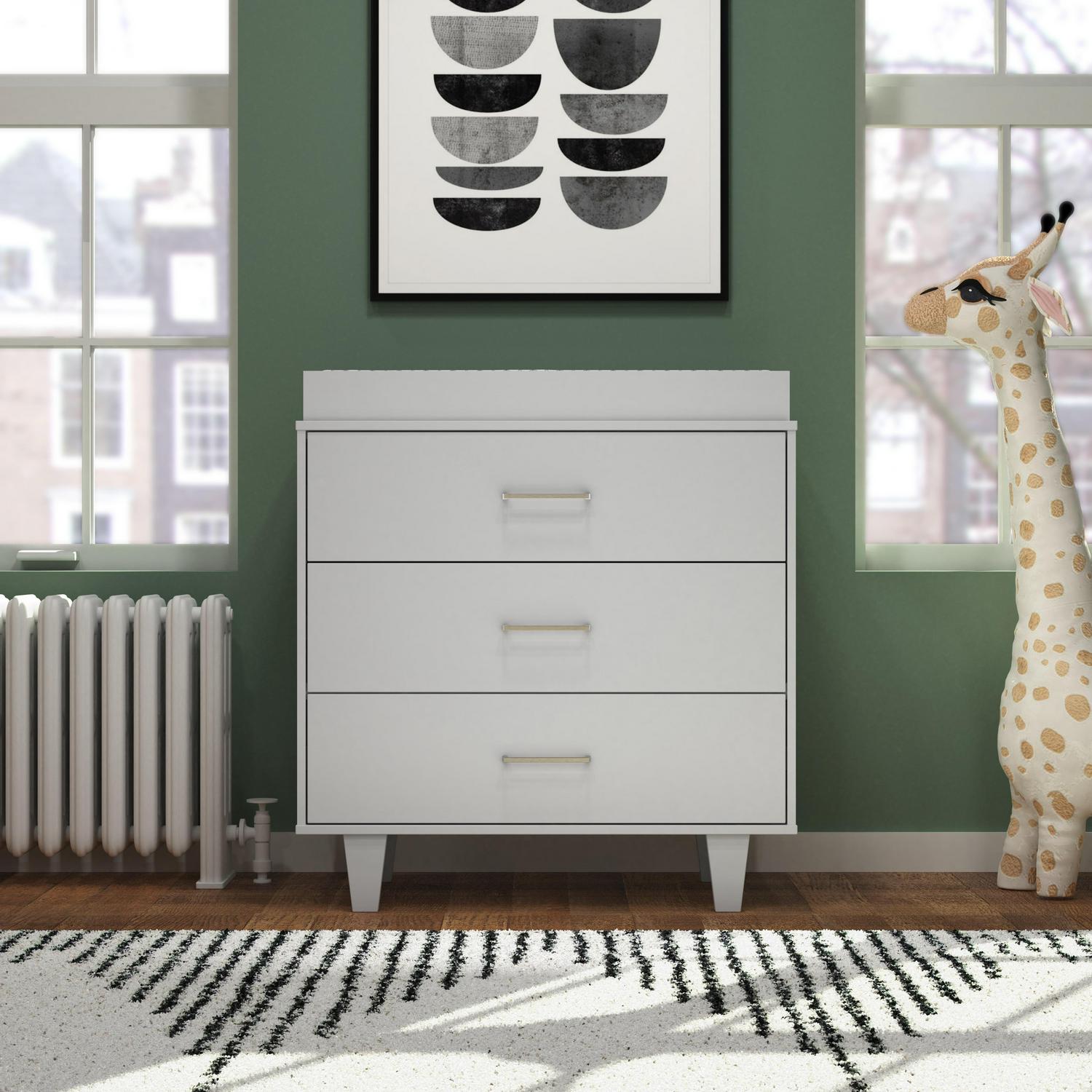 The Tremont 3 Dresser Changing Table introduces a fresh, mid-century modern style to your baby’s nursery with its clean lines and tapered legs. Features a single, simple nickel pull design on each drawer with ball-bearing glides, and is offered in 3 solid-painted, non-toxic finishes. The removable changing table topper enables this kid’s dresser to be a part of your child s room as they grow up. Pairs perfectly with the Euro-style 4-in-1 convertible crib and other coordinating items from the Child Craft Tremont collection.