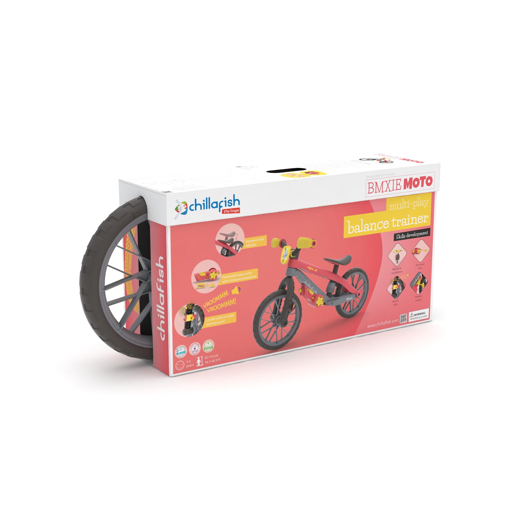 The Chillafish BMXie MOTO gets kids excited while learning multiple skills. BMXie Moto is a multi-play balance trainer and now comes with detachable play motor & sound ‘turbo cards’. Learning balance on a balance bike gets even better: insert the Turbo Cards to make real motor sounds while riding, VROOM VROOM. Or unassemble your play motor to fix your bike in the pits. The play motor has 2 small storage areas closed off with the child safe screws & screwdriver included in the packaging. It’s fun and helps kids to improve their fine motor & cognitive skills. It’s like they are riding a real motorcycle, especially as they also have a child safe starter key to act like a grownup ! The 3 included Turbo Cards make roaring noises at the front fork ~ VROOM VROOM ! The Turbo Cards have different settings to adjust the sound level. Great to help kids develop their sensory skills. The hand protectors are just like a real motorbike: they protect the hands and make you look like a boss! Airless Rubber Skin tires give you the best grip possible, and you don’t even need to inflate them. A foam core means they cannot puncture; an outside rubber layer makes them just like rubber tires, unlike other foam tires on the market. Great grip and no pumps – that’s best of both worlds, and that’s what a Chillafish balance bike deserves! Need anything more? Maybe a detachable front number plate with various stickers for cool customization? Yup, we got that too! BMXie balance bike has been in the Chillafish family since the very beginning and is one of the most widely used balance bikes in the world. This is our 2nd generation of the BMXie bike, with improved engineering and features. Chillafish products are trusted by over 1 million households around the globe. BMxie2 seat adjusts without tools from 12,5-16 inch / 32-41cm. Recommended kid’s height : 31-47 inch / 80-120 cm.Chillafish is a leading manufacturer of activity toys and specialist in balance bikes and other wheeled toys – inspiring children and their parents around the world to play actively, develop healthy motor skills have fun with their innovative and super-duper cool toys. Chillafish products are design-inspired, manufactured with the highest sustainable quality standards in mind, offering fantastic play value. Entering the households of more than 1 million people makes us experts in creating fun, innovative and sustainable toys ! Each Chillafish product is covered by a default 2 year warranty. Additionally, warranty is automatically extended to 5 years when you register your balance bike at Chillafish, PLAY LONGER !