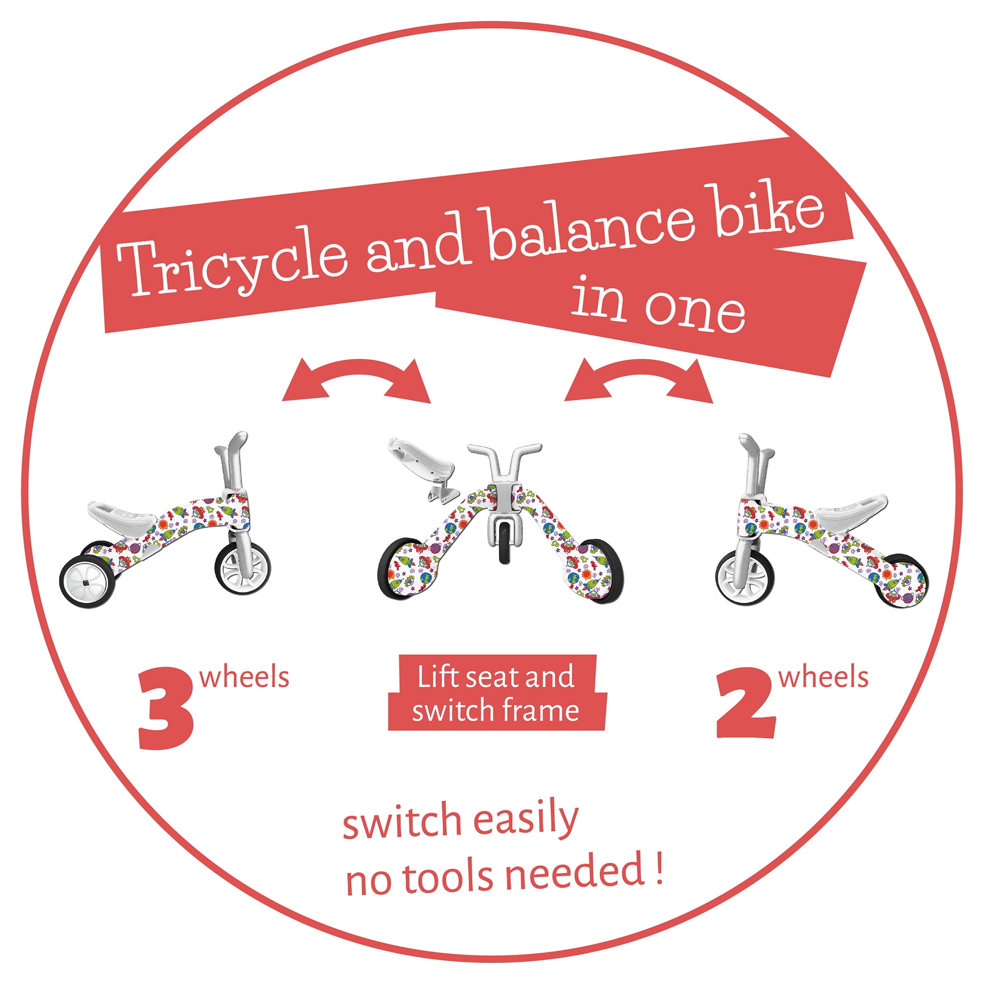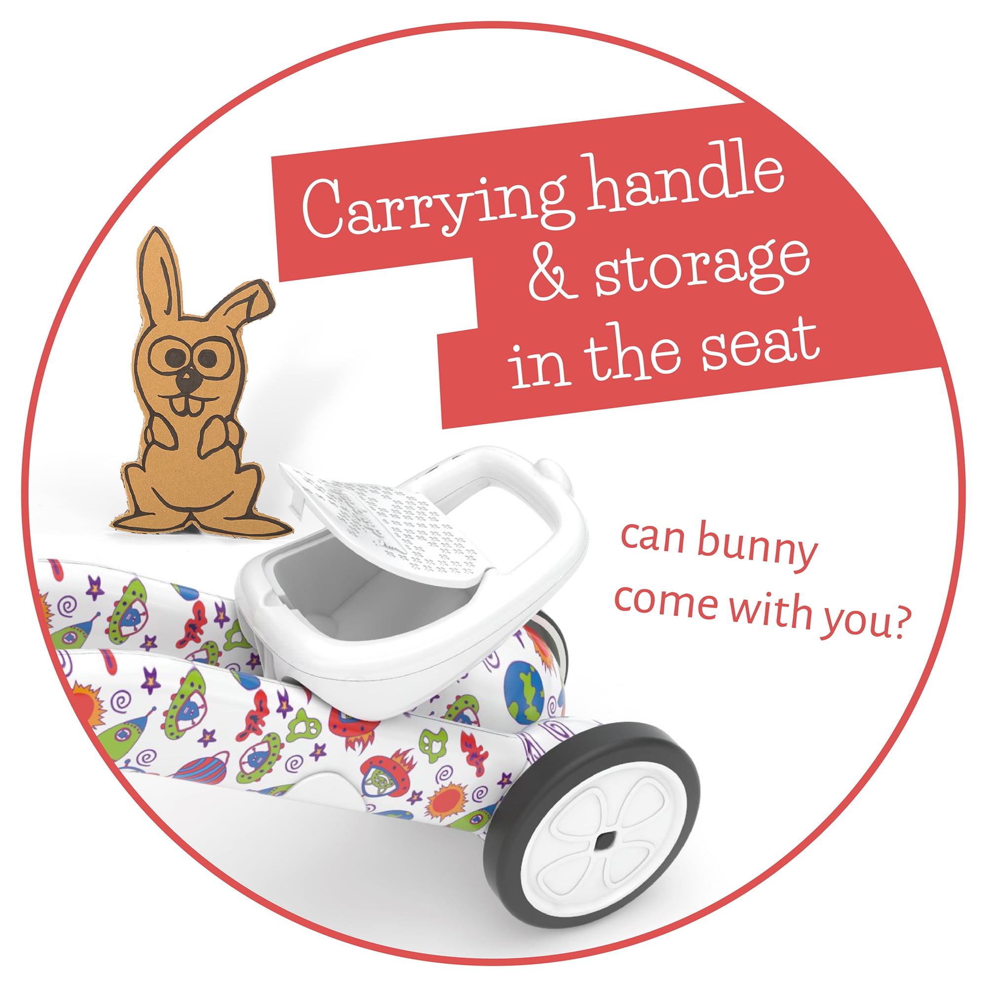 Chillafish Bunzi 2-in-1 gradual balance bike and tricycle is uniquely designed to help teach your child balance at his own pace in a fun way. Your child learns to balance step by step on 3 wheels and when it’s ready, on 2 wheels. Made of high-quality ABS material, the frame can switch between a 3-wheel mode to a 2-wheel mode in just a few seconds; no tools required. The back wheels in 3-wheel mode still offer more stability, but are purposely close to each other, hence less stable than a traditional tricycle or 4-wheel ride-on, so your child feels in control of his own balance. The seat grows with your child (8,7 inch / 22 cm in 3-wheel mode to 10,2 inch / 26 cm in 2-wheel mode). Only in this way the new skills of your son or daughter can be better supported, just until he or she has mastered balance and is ready for a bigger balance bike like BMXie2 or Charlie. The silent anti-skid synthetic rubber tires are non-marking; so no worries when your toddler wants to ride inside the house. But the material of the tires is also strong enough to be used outside and to survive the wildest outdoor treks. Bunzi is made of a very lightweight high-quality ABS material (4,2 lbs / 1,8 kg), which makes it easy to carry around thanks to the handgrip built into the back of the seat. You can easily bring the Bunzi on all your child’s trips and adventures. Your child can bring along a toy or snack for the ride in the hidden storage box. Your son or daughter will love it and it’s at the same time also very useful to train the fine motor skills of your lovely toddler. With cute bunny-style handlebars, an intuitive form that grows with your child and vibrant colors to display the personality of your child, Bunzi is sure to become the preferred bike buddy for your kids; recommended for ages 1-3, maximum weight 55 lbs (25 kg). Bunzi is being sold worldwide for 7 years already and most parents have this little Bunzi in the family for many years, giving it to little sis or bro after the first use. You can’t lose the tool, as there are no tools needed, Bunzi arrives assembled in the packaging and the seat adjust without any tool.
