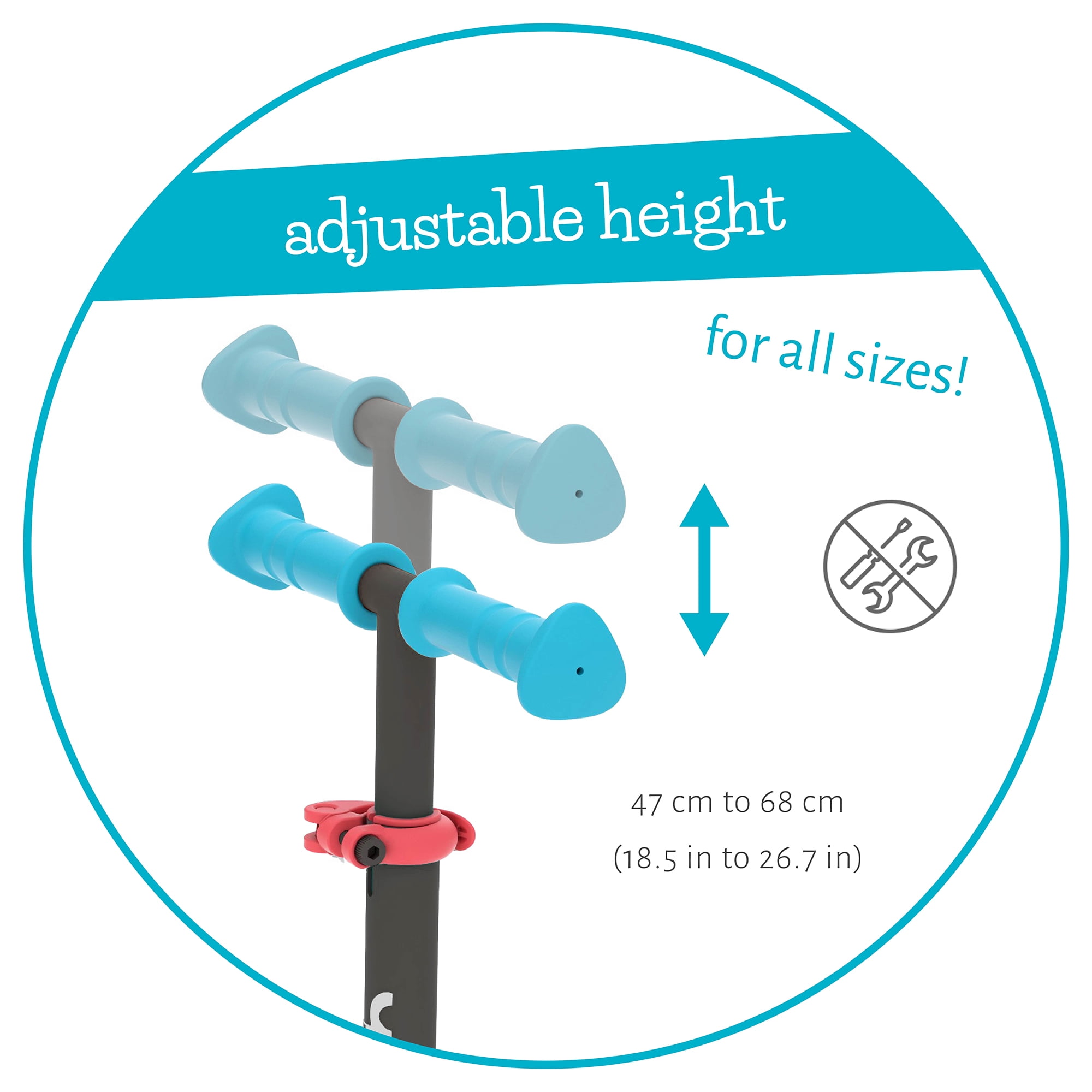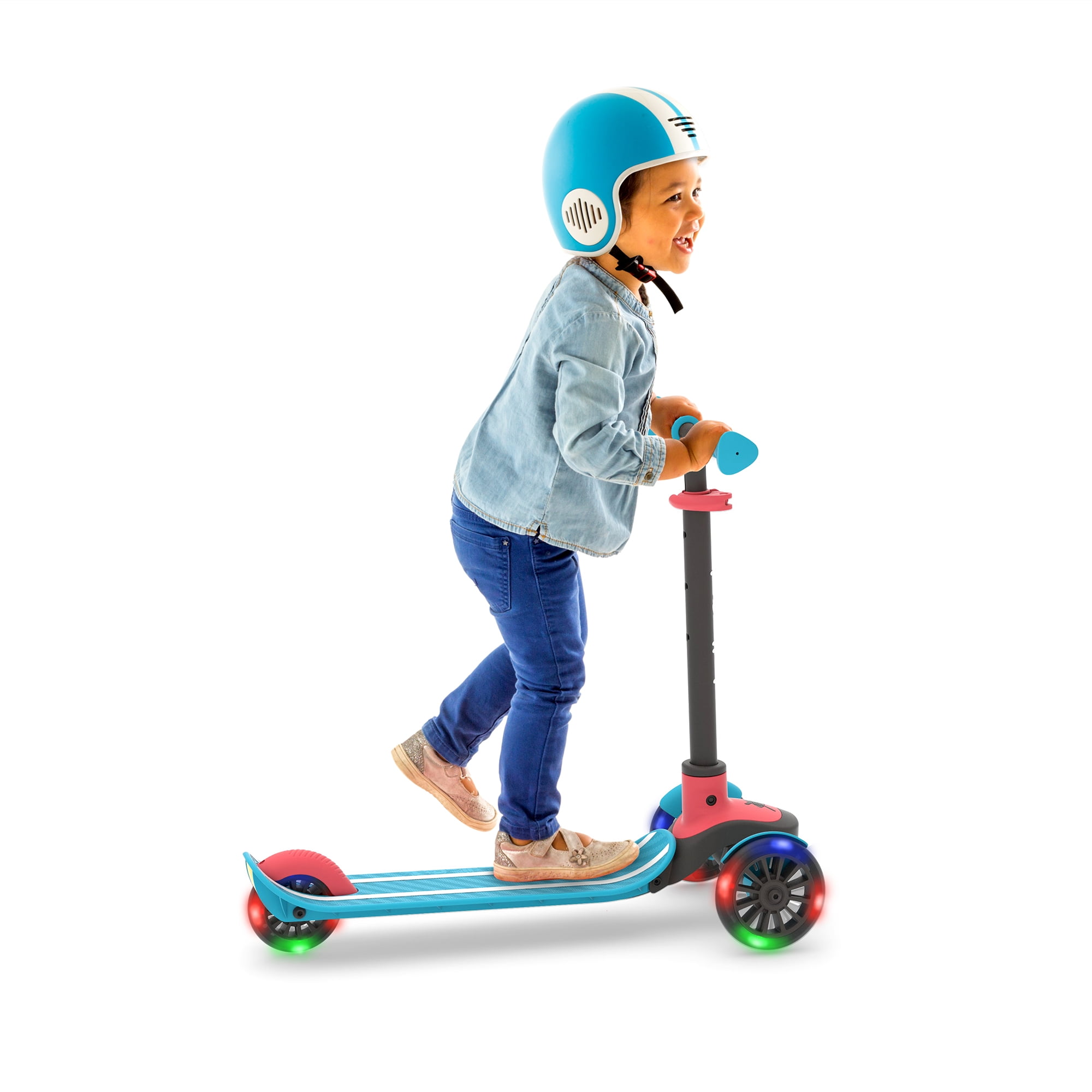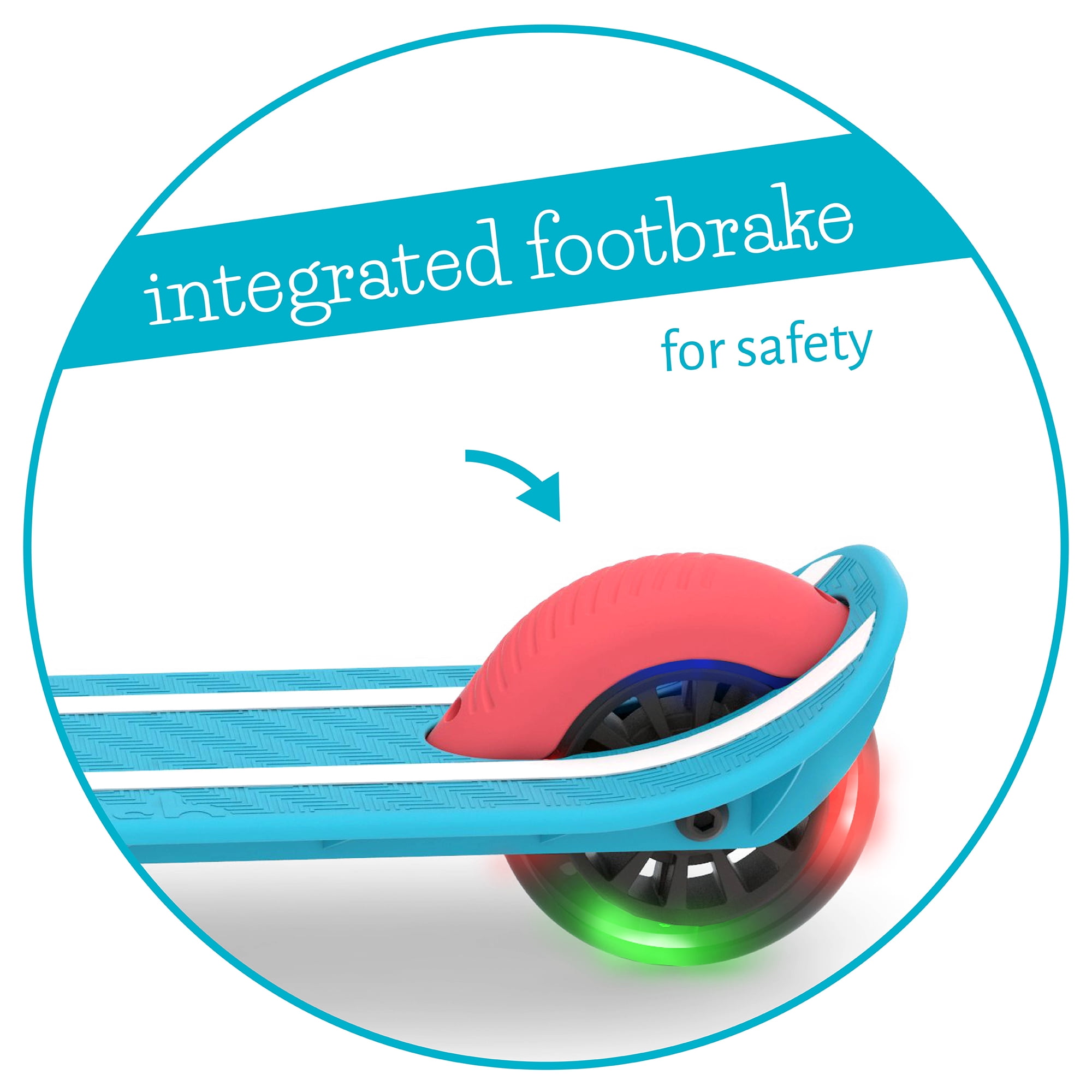 Lightweight 3-wheel scooter for kids age 3 and up. Wheels light up while riding – No batteries required! Lean to steer mechanism: just lean your weight to turn – super easy. Re-invented twintip deck design with integrated footbrake for safety. No-tools detachable handlebar can be taken out for easy storage/transport. High-quality ABEC-5 wheels make you roll like you’ll never stop.