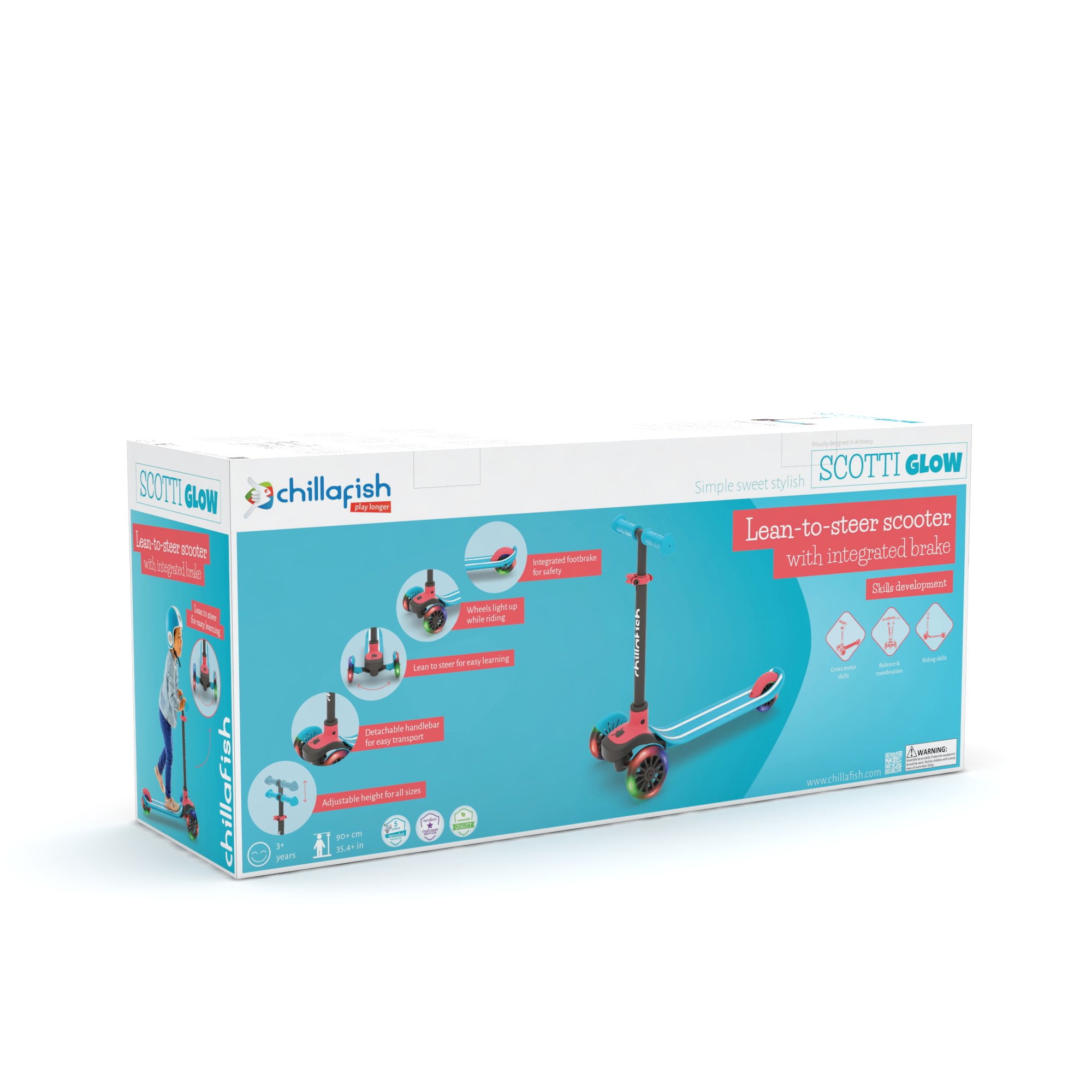 Scotti GLOW is our Chillafish interpretation of the classic 3-wheel scooter, now with LED lights in the wheel !! This lightweight scooter for kids age 3 and up is a re-invention of the lean-to-steer scooter, featuring our signature twintip deck with integrated footbrake. The handlebar comes off in a snap without tools so you can easily take Scotti along to friends or to the park. Adjust the height to suit small kids and tall friends – the handlebar can adjust from 52cm to 72cm (from the ground). The high quality ABEC-5 wheels make you roll like you’ll never stop and the comfy handgrips feel like you’ll never want to let go. The LED lights do not need any batteries, they are simply powered by riding the Scotti. The deck is lightweight yet strong, for kids and adults up to 50kg (but we tested higher :-)). Scotti, lightweight, simple, stylish fun quality by Chillafish. Play Longer. Comes fully assembled in the packaging, just snap-in the handlebar and ready to roll ! Recommended age: 3+ / Recommended weight: max 50kg No batteries required for LED lights.
