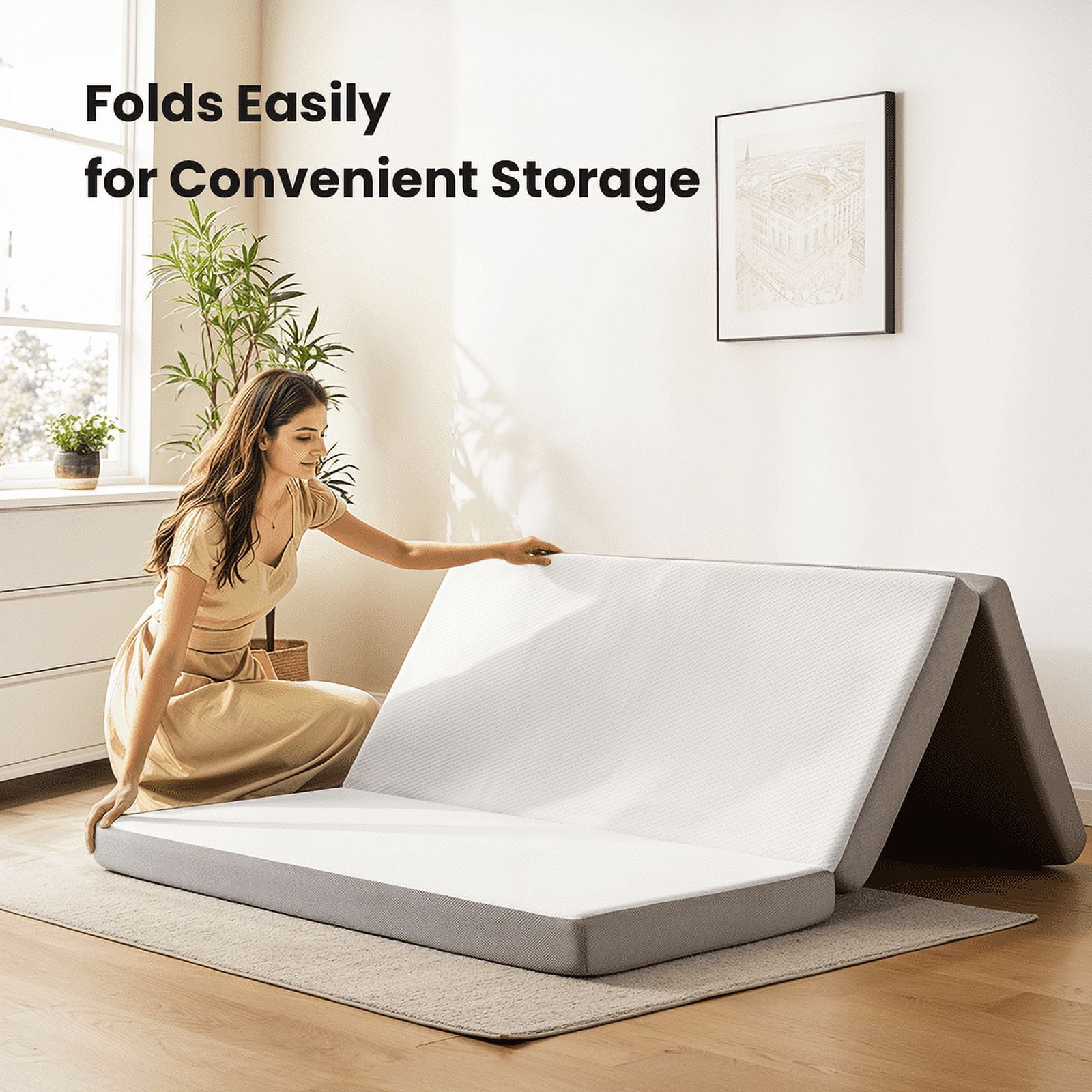 Feature: Space-Saving Design: The 4 inch Tri-fold Memory Foam Mattresses are engineered to fold into three sections, allowing for easy storage in tight spaces. When folded, they can be stacked vertically or horizontally, making them ideal for closets, under beds, or even in the trunk of a car Easy to Carry: The Tri-fold Mattresses combined with the ability to fold into a compact size, makes tri-fold mattresses highly portable. Whether going camping, visiting friends, or simply rearranging furniture, these mattress can be effortlessly transport without hassle Multifuntion: Our Tri Folding Mattress serve a multitude of purposes beyond just sleeping at night. During the day, they can be used as a makeshift sofa or lounging area for reading, watching TV, or playing games Comfortable Support: This Tri Folding Memory Foam features a higher density support foam. This upgraded support foam will keep the mattress from collapsing, provides perfect support for your body and a restful night’s sleep Specifications: Color:White+Gray Thickness: 4 inch Closure Type : Zipper Material: Memory Foam Product Care Instructions: Machine Wash Size: Single: 75″×25″ Twin: 75″×38″ Full: 75″×54″ Queen: 80″×60″ General warning: It is also a good idea to find out the size and height of the folding mattress in advance to ensure that you order the correct size. Please allow any potential odors to dissipate after 48 hours of opening the folding mattress, and adjust to the final feeling after the foam has fully expanded. When using a folding mattress, it’s important to ensure it’s placed on a stable surface to prevent tipping or sliding.