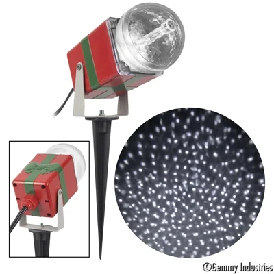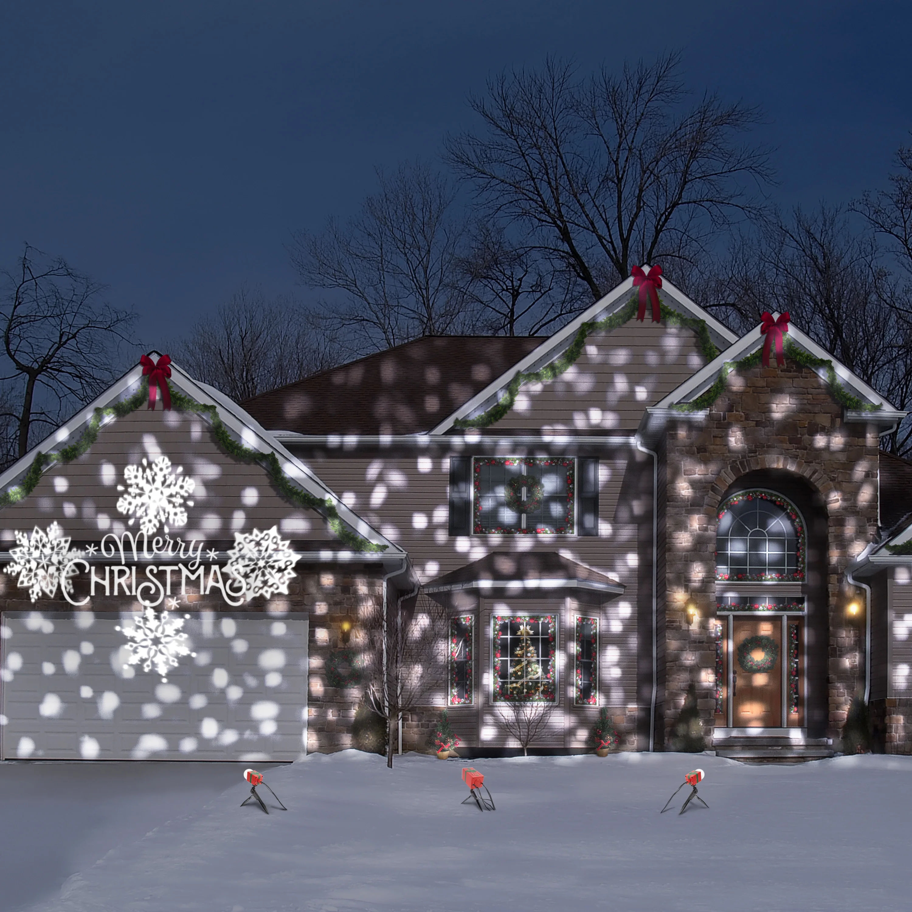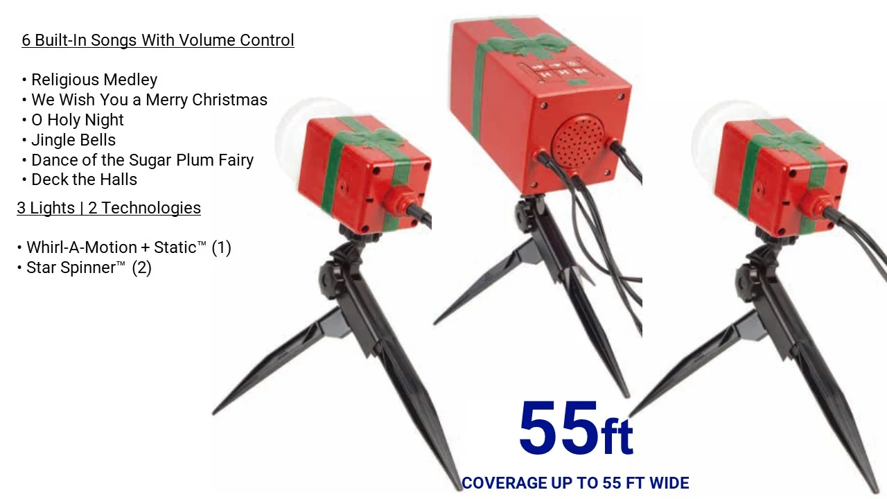 Christmas Lightshow Projection LightSync with Sound Clear • Includes built-in speaker with 6 programmed holiday songs. • Lightsync LightShow Projection includes two Star Spinner projection lights, one Whirl-A-Motion + Static. • Set includes a built-in speaker with preprogramed songs for the ultimate holiday light show with music. • Music plays and lights create a dazzling show to each individual song. • Projects up to 55 ft wide, 16ft cord length. • Decorative holiday casing. • Stakes easily into the ground. • Clear lights