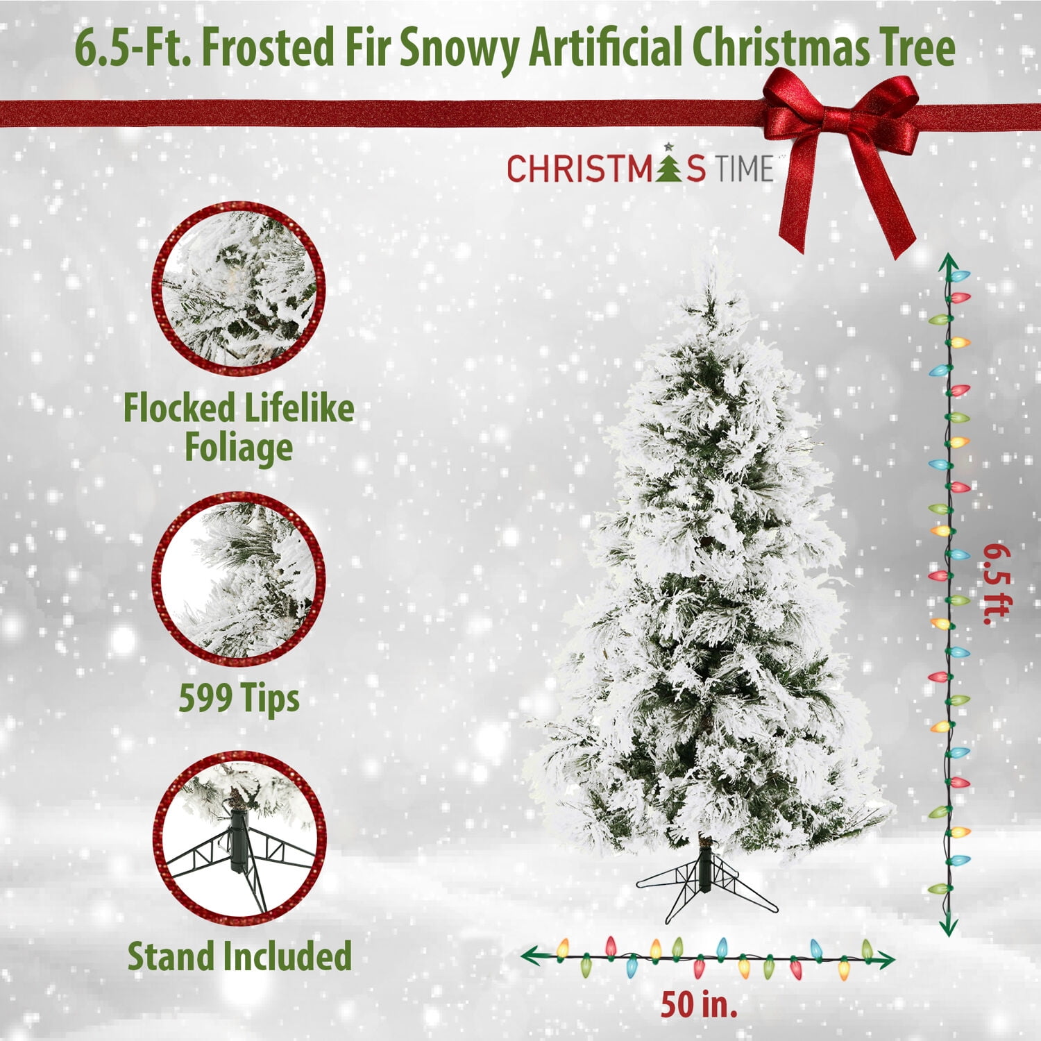 FULL, TRADITIONAL SHAPE: Standing 6.5-foot tall this traditional silhouette snow flocked tree is the perfect fit for your room with 8-ft. to 9-ft. ceilings. The 50-in diameter makes this a great tree for small spaces, entryways, and corners. HINGED BRANCHES: Metal hinged branches attached to the center pole sections allow for easy set-up, take down, and storage year after year. A sturdy metal stand is included. FULL AND DENSE: 599 snow covered lifelike needle tips create the appearance of a natural cut tree. Our premium flock is bright white and fade resistant. NOT YOUR AVERAGE ARTIFICIAL TREE: Christmas Time produces the most realistic artificial Christmas trees on the market, featuring all the long-term benefits that come with owning an artificial tree. WE ARE HERE TO HELP: Our customer service team is available to assist you with any product questions or shipping related issues. If you are not completely satisfied please reach out to us for assistance. Frosted Fir snowy artificial Christmas tree with flocked lifelike foliage Full, traditional silhouette stands 6.5-ft. high with a 50-in. diameter Long, high-quality PVC needles and all-metal hinged branch construction Easily folds back into slim silhouette for easy storage Flame-retardant and non-allergenic Standard model – lighting sold separately Metal stand included Number of tips: 599