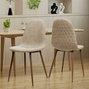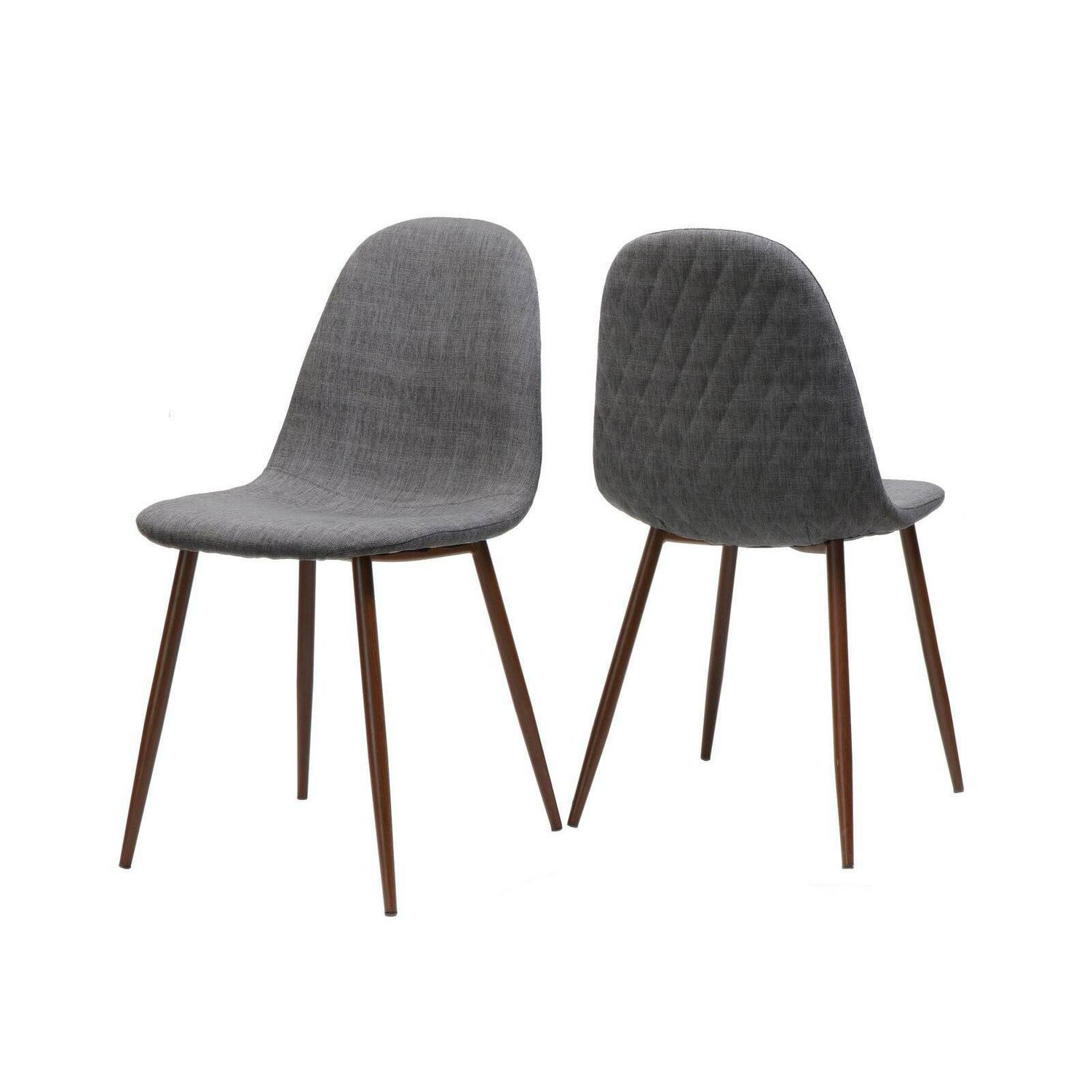 Showing off quilted backrests and curvy seats, the furnishings in the Caden Fabric Dining Side Chairs – Set of 2 make a sophisticated statement from every angle. The two dining chairs feature contoured seats clad in polyester fabric for comfortable support. To enhance the mid-century modern appeal of the chairs, the durable iron legs are finished to resemble natural wood.