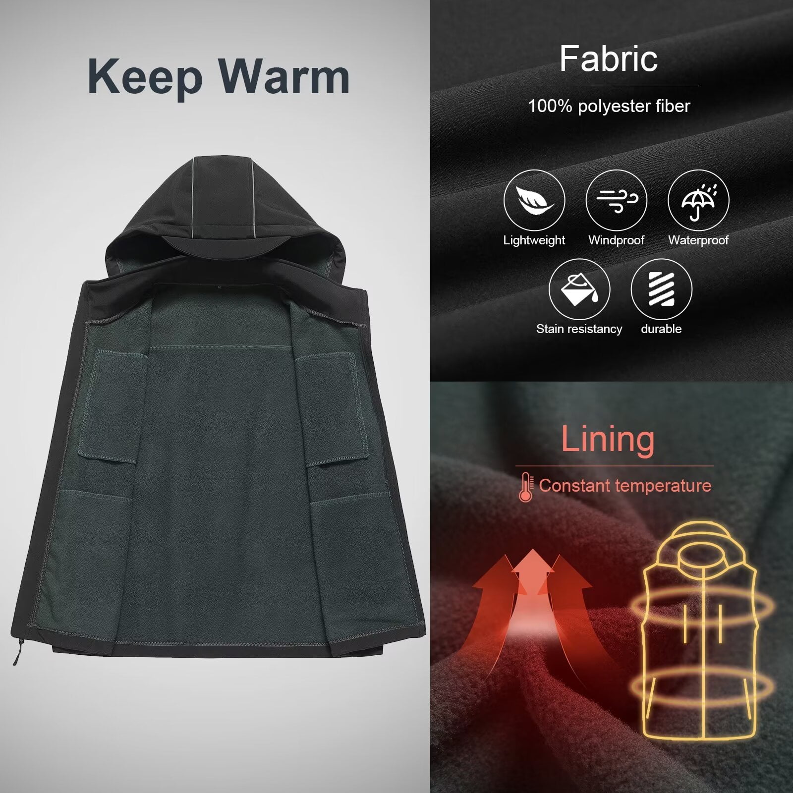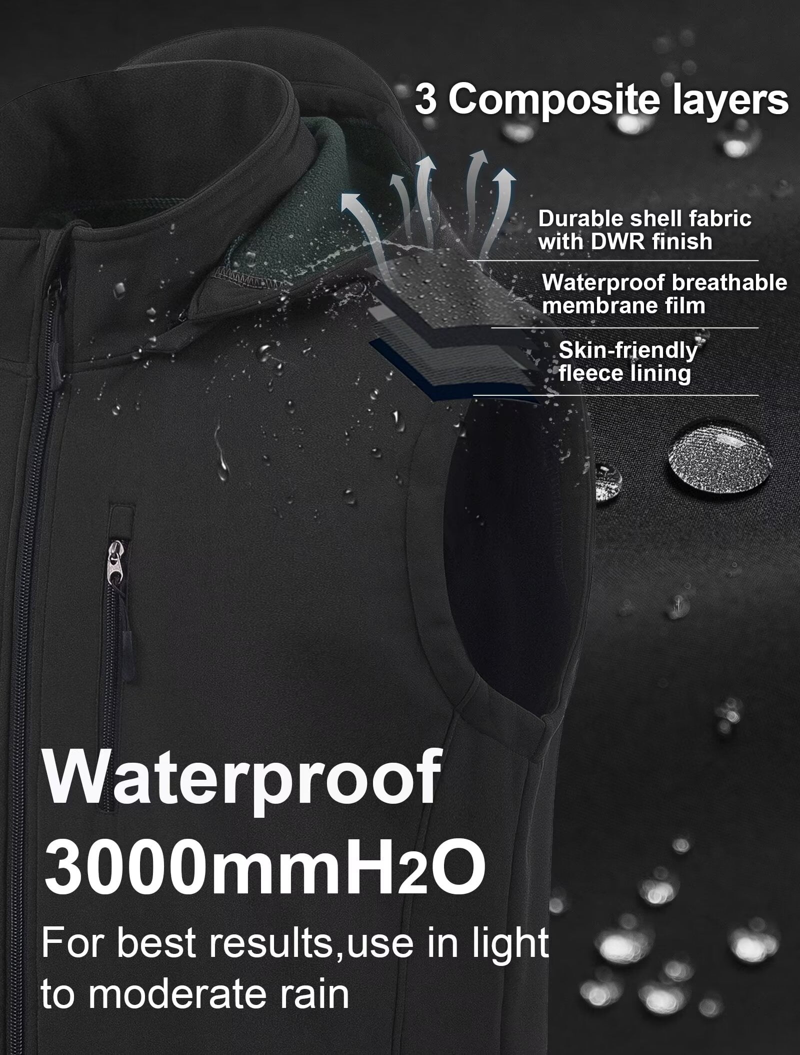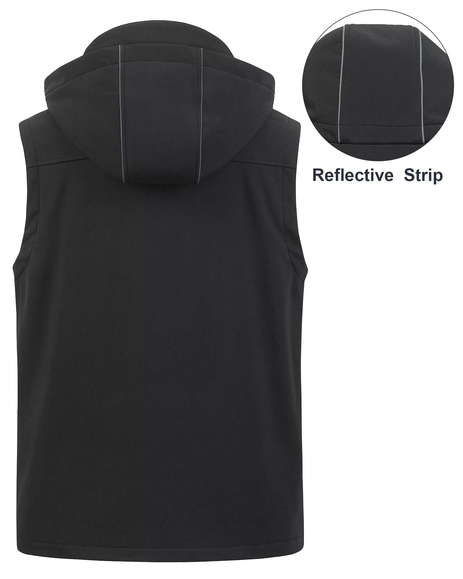 ⭐Windproof& Water Repellent Lightweight Vest: This outdoor recreation vest peculiar outer shell is a highly wind-resistant fabric with a water-repellent finish.Mid-layer fabric is laminated with TPU membrane,featuring water-repellent and 3000/m2/24hr breathability to keep your core comfortable and dry in the light rain(the water bead up and roll off).A practical choice as fabric is synthetic and will resist stains and wrinkle resistance.Adjustable drawstring hood & hem prevent cold wind ⭐Keeps Core Warm: The utility vest fully lined in a 100% polyester micro fleece that feels soft and warm,the outer is a water resistant soft shell material.Double layered for insulation and durability.Hood is detachable to provide protection from the wind andworks well on its own or with another layer,provides good protection in windy or wet cold weather.This classic sleeveless vest is well insulated to give additional warmth ⭐keep Your Arms Free: Soft shell slight stretches wel and pops back to original form.Takes up little space,very packable.Plenty of room to swing.So it’s completely comfortable when you’re active.(Tips:cold water on the delicate cycle and then let it air dry) ⭐Functional Details & 6 Pockets Design: This active vest has 2 center front zippers with zipper guard and zipper garage under the chin for comfort.The neck comes up to under the chin when zipped up so your neck stays warm.There are 2 zippered side pockets,2 inner deep pocket and they are sized to hold a large cell phone, gloves,etc.There are 2 reflective strips behind the hood for safety at night ⭐Occasion: It’s lightweight,comfortable, breathable,windproof,rain resistance,Stylish Sleeveless Jacket.This cozy fleece vest can be worn in the spring,summer,and fall and even in winter under a heavier coat.Easy to pack and practical for layering.Morning gardening early dawn helps keep your warm and dry.Great for golf,hike,early morning walk,tennis,jog,motorcycle,hunt,fish,adventure,travel,work indoor and outside