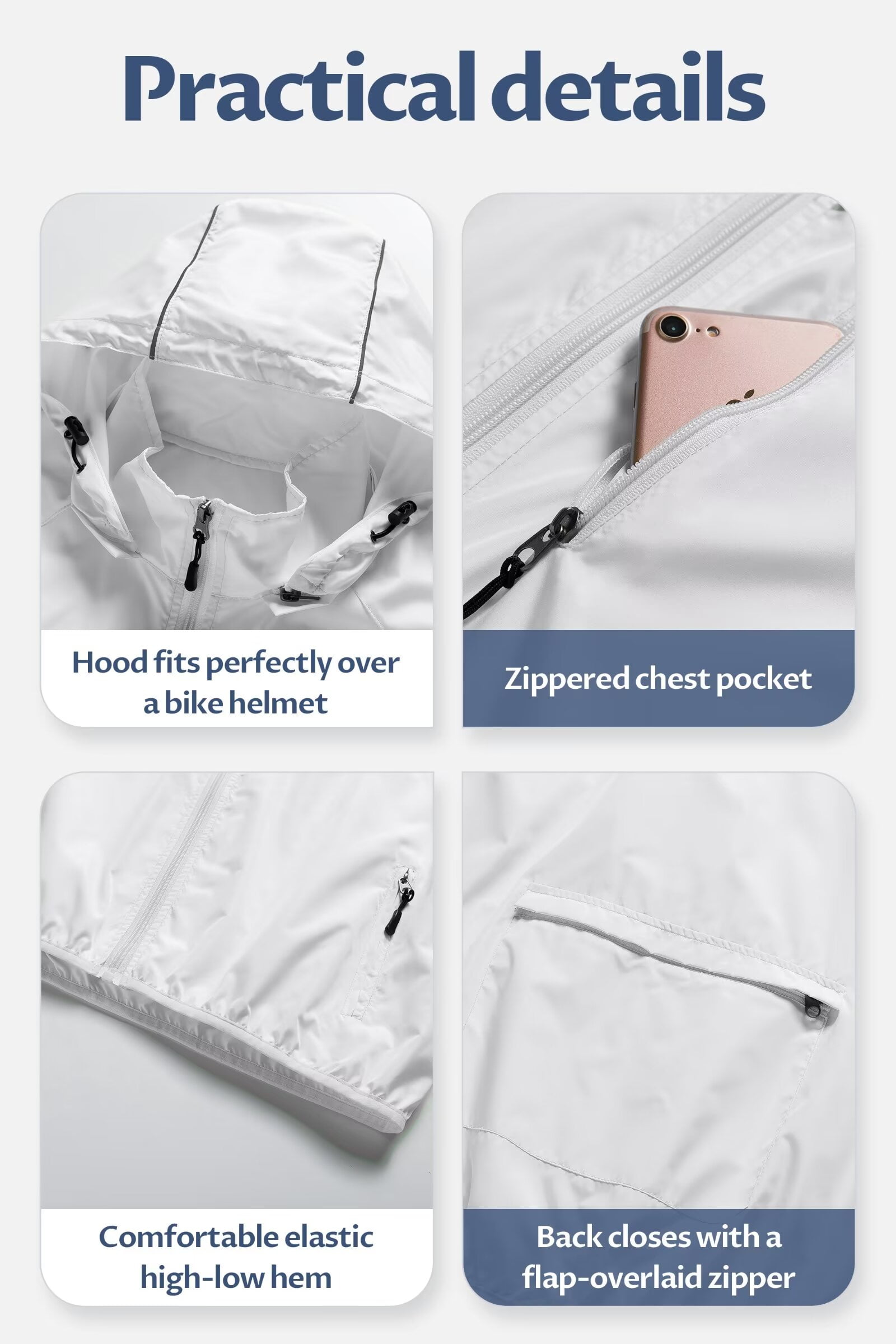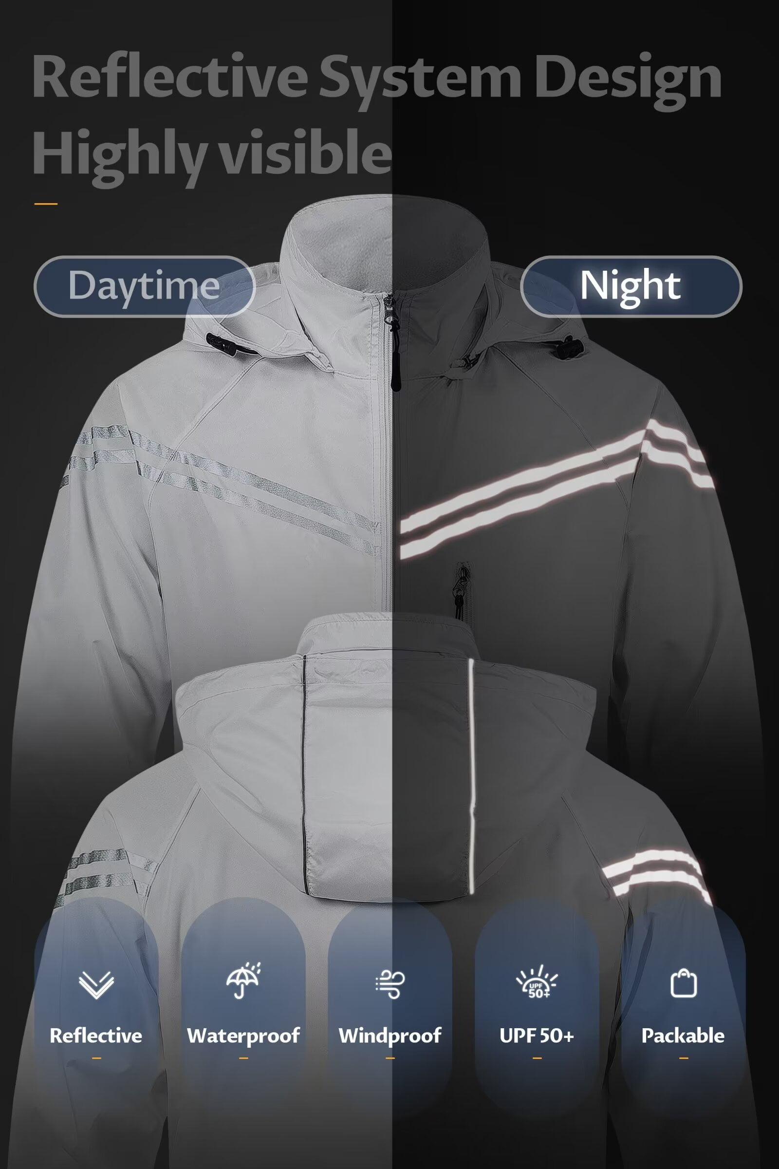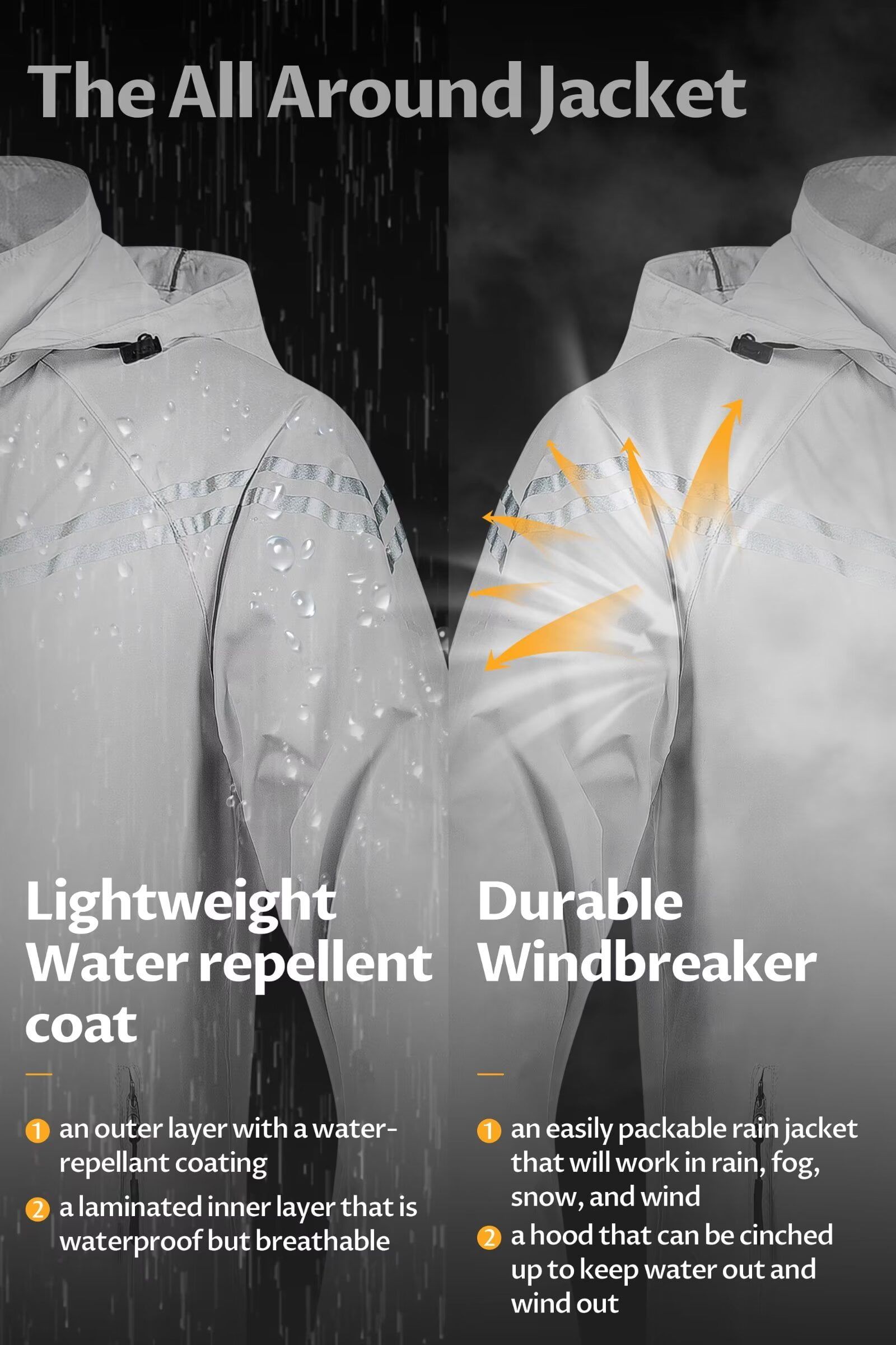Waterproof Fabric&Sun Protection:This 100% polyester rain jacket has an outer layer with a water-repellant coating,plus a laminated inner layer that is waterproof but breathable.The large pocket at the rain coats bottom back closes with a flap-overlaid horizontal zipper.Outer reflective stripping plus bright coloration guarantees the running jacket visibility.UPF 50+ provides excellent protection against harmful ultraviolet rays Windproof Quick Dry Jacket:Keep warm and dry all day in the pouring rain and cool temperatures.Dependable and packable cycling rain jacket when the weather changes.Suit for wet climate(rain, mist, fog)held up against light rain and protected you from being pelted by sand one windy day at the beach.This summer windbreaker not too hot,so can be worn in the rain in any season and it’s not too loud and swishy Practical & Reflective System:Bright colors,compact design,water resistant ability with breathing gaps.durable and water resistant Hiking lightweight jacket.Excellent all around jacket and extremely comfortable.Great for packable track jacket.Stores easy.Reflective straps on the hood,the front and arm to keep you visible in low light conditions to help ensure safety in low-light conditions.It is super reflective and day glow Constructed Jacket & Durable:The cycling jacket seams are well-sewn with no gaps or loose threads.Super smooth zipper,outer seams are reinforced with interior waterproof adhesive stripping.Elastic wrist,elastic hem,solid color with visible logos.Detachable hood fits perfectly over a bike helmet( can be cinched up to keep water out and wind out)Under arm vents,1 Large back pocket with zip closure,1 chest pocket,2 side zip pocket,2 generously-sized inner cargo pockets, keep you phone safe and dry Occasion:The multifunctional jacket useful for everything in everyday life.it allows for good range of motion.Perfect for cycling, camping, running,walking,fishing,biking,climbing, kayaking,a summer rafting trip ,work out,quick hiking trips,outdoor activities.Protection from morning humidity.just any casual wear(Tips:Machine wash cold gentle, wash separately, do not bleach, tumble dry low)