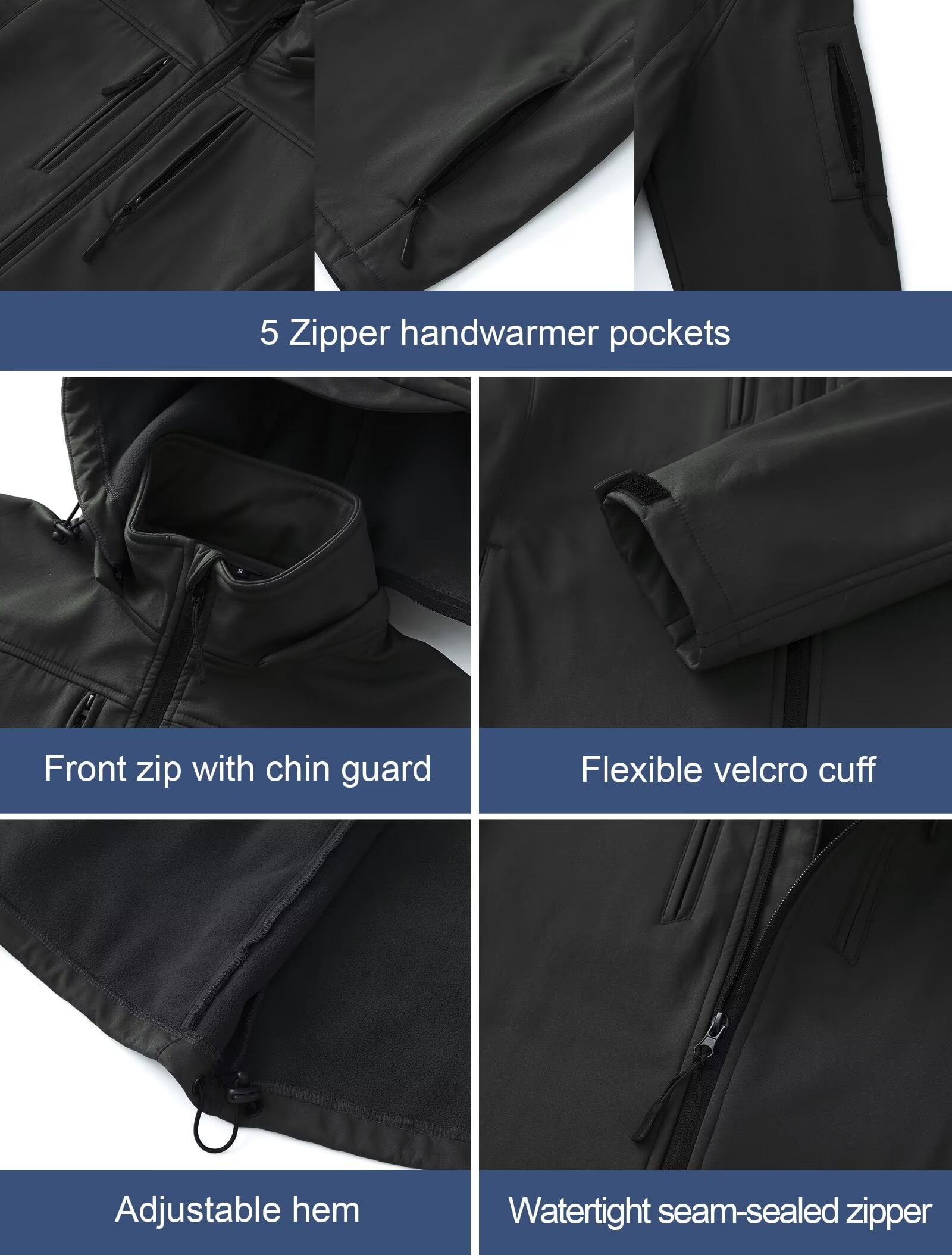 Waterproof and keep warm:DWR (Durable Water Resistant) treated softshell exterior offers windproof performance while maintaining breathable comfort and repels light rain, moisture and snowflake.Men’s softshell jacket features our durable water and wind resistant shell to keep the elements out while keeping you dry and warm. With 3000mm/H2O waterproof index.Built-in high permeability film contribute significantly to waterproof Durable Breathable Fabric : This Lightweight Tactical Coat is crafted of a 100% polyester soft shell .with superior durability and resilience,These lightweight, stretchy and durable materials provides you with maximum movement, comfort and security when you enjoy adventure.Fully machine washable More Detail Design:5 outside pockets (2 zippered chest pocket and 2 zippered slash hand pockets,1 Arm pocket) guarantee enough room to stash items.2 Large interior pockets.multiple pockets to offer plenty storage for essentials.Fully zips up to the stand collar protecting your body and neck from the elements. softshell exterior, fleece-lined interior .Adjustable Velcro cuffs with hook and loop fastener and a drawstring hem line. These adjustable parts offers a perfect fit Reflective and Occasion: Removable hood back reflective strip design .Keep you safe in low light environment,suit for Outdoor activities in the night.Lightweight soft shell warm fleece jacket is the great choice for casual daily work wear, military army outdoor, outdoor sports, snowboarding, skiing, mountaineering, skating, traveling, camping, hiking, cycling, climbing, fishing, riding, hunting, travelling and adventure. Customer Service:This insulated jackets is perfect for any season. If you have any questions, please feel free to contact us