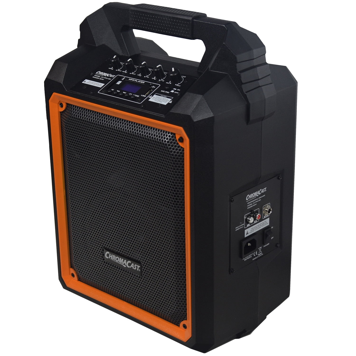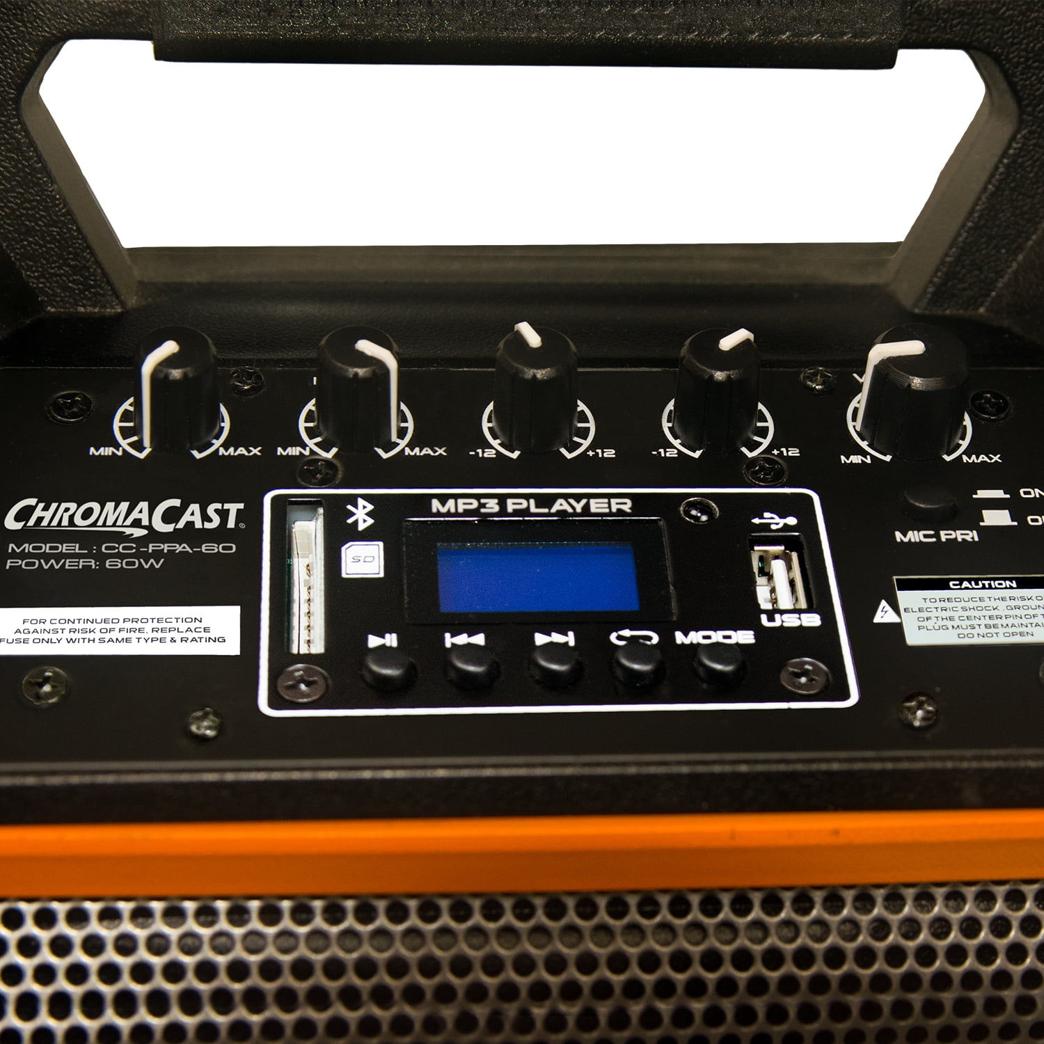 Whether before the game or a fun gathering in your backyard, your favorite music makes it a special occasion. The ChromaCast CC-PPA-60 makes these events truly memorable with great sound, thanks to its 2-way speaker system and 60-watt dynamic power amplifier. You can stream your favorite music from any Bluetooth device, USB device, SD card, MP3 Player, or create your own memories with the included microphone. With a 1/8” (3.5mm) aux input for non-Bluetooth devices and a rechargeable battery with up to 18 hours of enjoyment on a single charge, The ChromaCast CC-PPA-60 always delivers the fun.