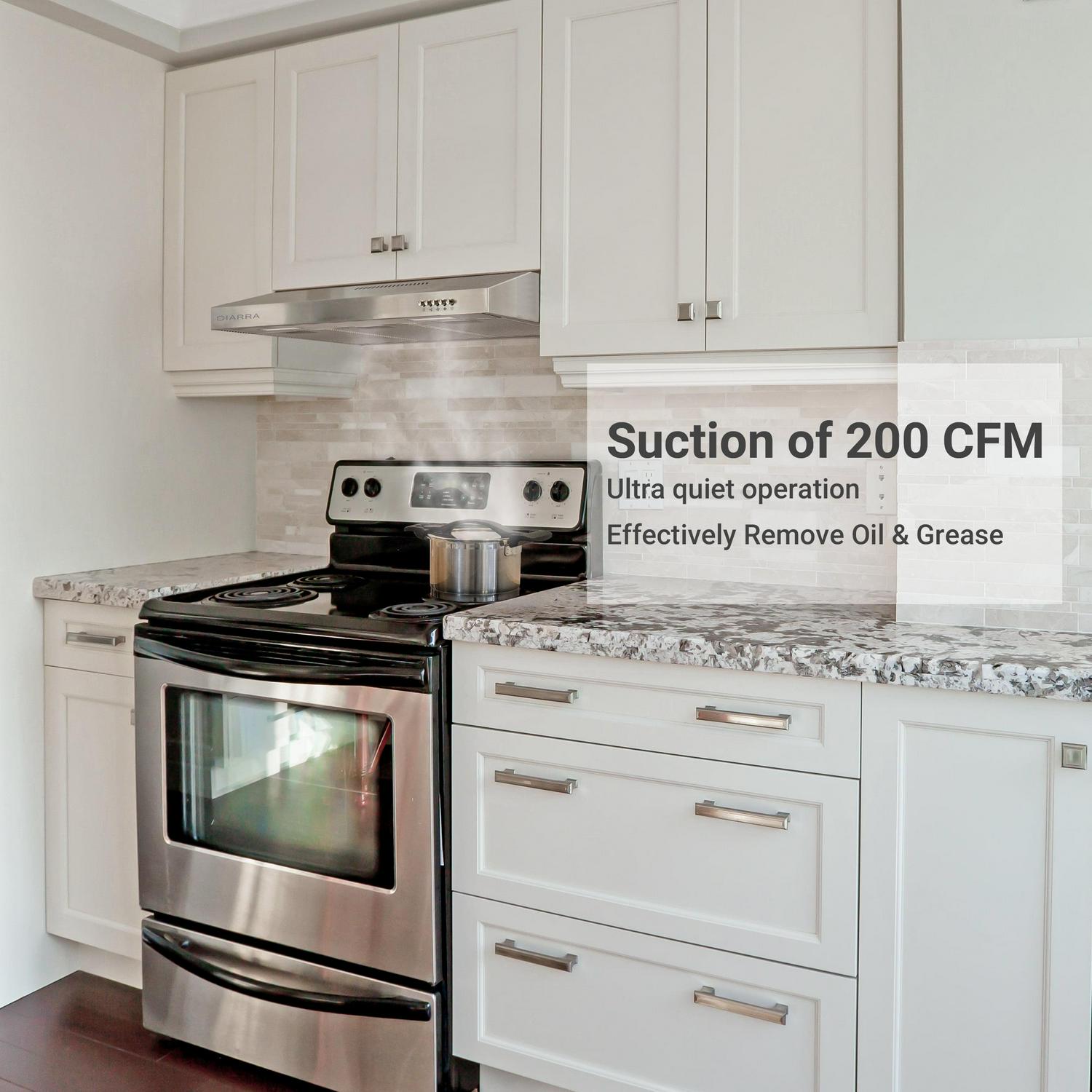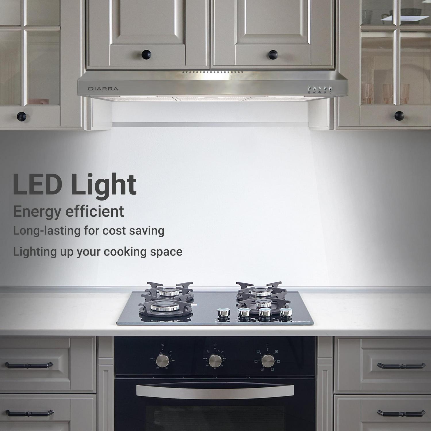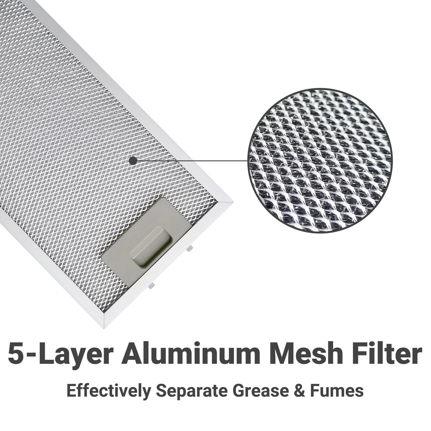 – SUPERIOR FILTRATION: Under cabinet range hood with mesh filters, trap cooking grease and oil with ease, preventing smells and odors from spreading in your kitchen.