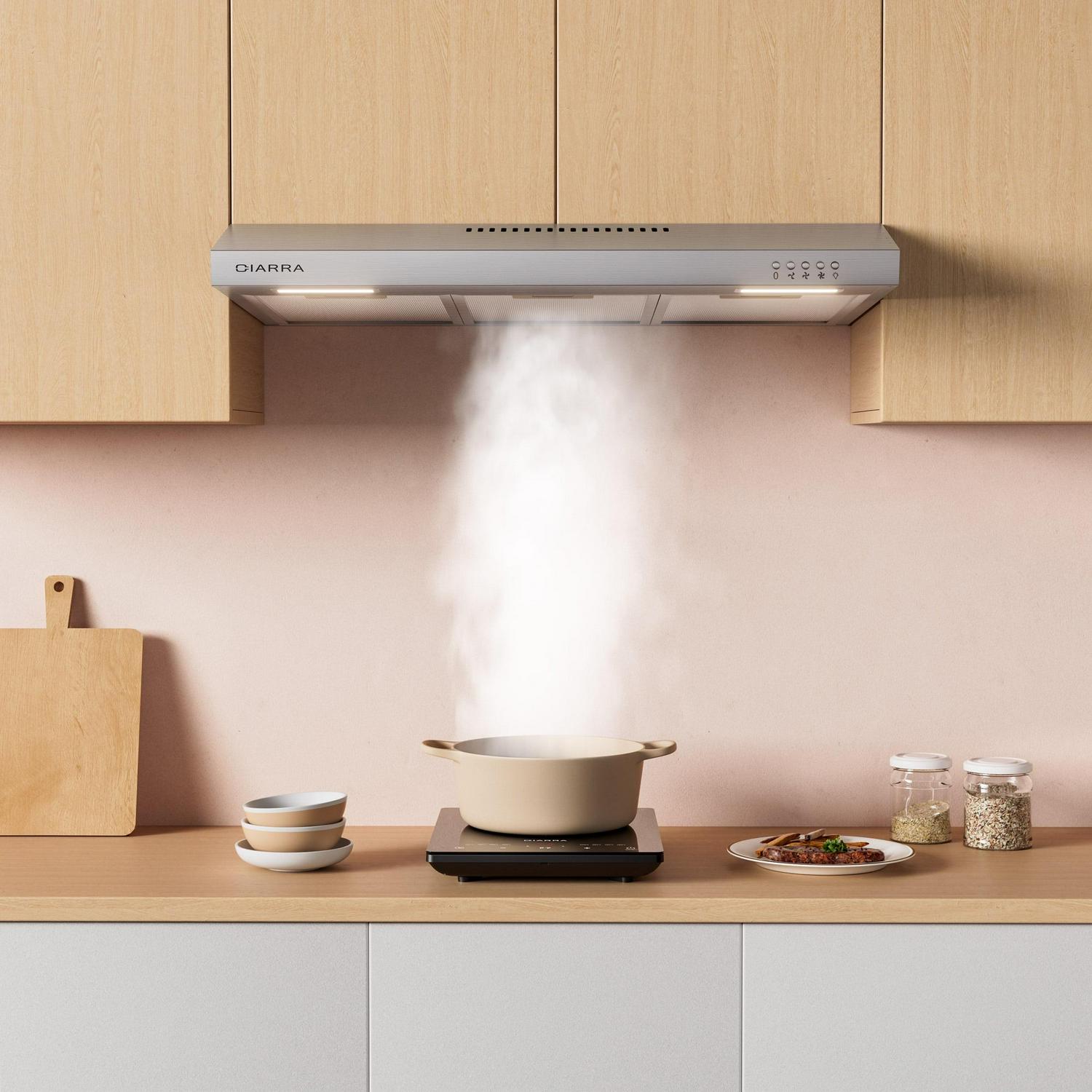 CIARRA range hood with modern design to fit a variety of kitchens. Expect cooking and cleaning experiences that make life easier, brighten up your kitchen, and protect your health. CAS918A75 Kitchen Hood CIARRA CAS918A75 is a 30-inch under cabinet range hood in stainless steel finish that combines sleek lines to bring a refreshing change to contemporary kitchens. 3.94 in. ultra-slim body can seamlessly integrate with any kitchen cabinet, perfect for small condos and apartments. This stainless steel range hood with 200 CFM suction removes smoke and odor as well as keeps noise levels less than 63dB at high speed. Our Kitchen hood is designed with push-button for convenient control. Built-in 2 led lights help illuminate your cooktop surface. Equipped with 5-layer aluminum mesh filters for easy clean-up, will make using this vent hood a simple, enjoyable experience for years to come.”