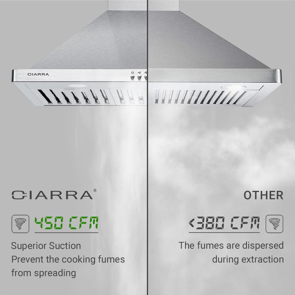 CIARRA CAS30275 wall mount range hood with a cast aluminum motor housing, ensure powerful ventilation performance for an odourless and fume-free kitchen. Our 30 in vent hood are constructed of stainless steel finished surface, with highly scratch and stain resistant, easy cleaning.Up to 450 CFM suction can remove grease and cooking odors and keep your kitchen fresh and clean. This ductless range hood features push button,so you can control different suction, lights and 3 fan speeds easily. Built in 2 LED lights Light up your cooking space for better visibility. Equipped with 5-layer aluminum mesh filter for easy clean-up, will make you enjoy the time preparing delicious meals for your family and friends.