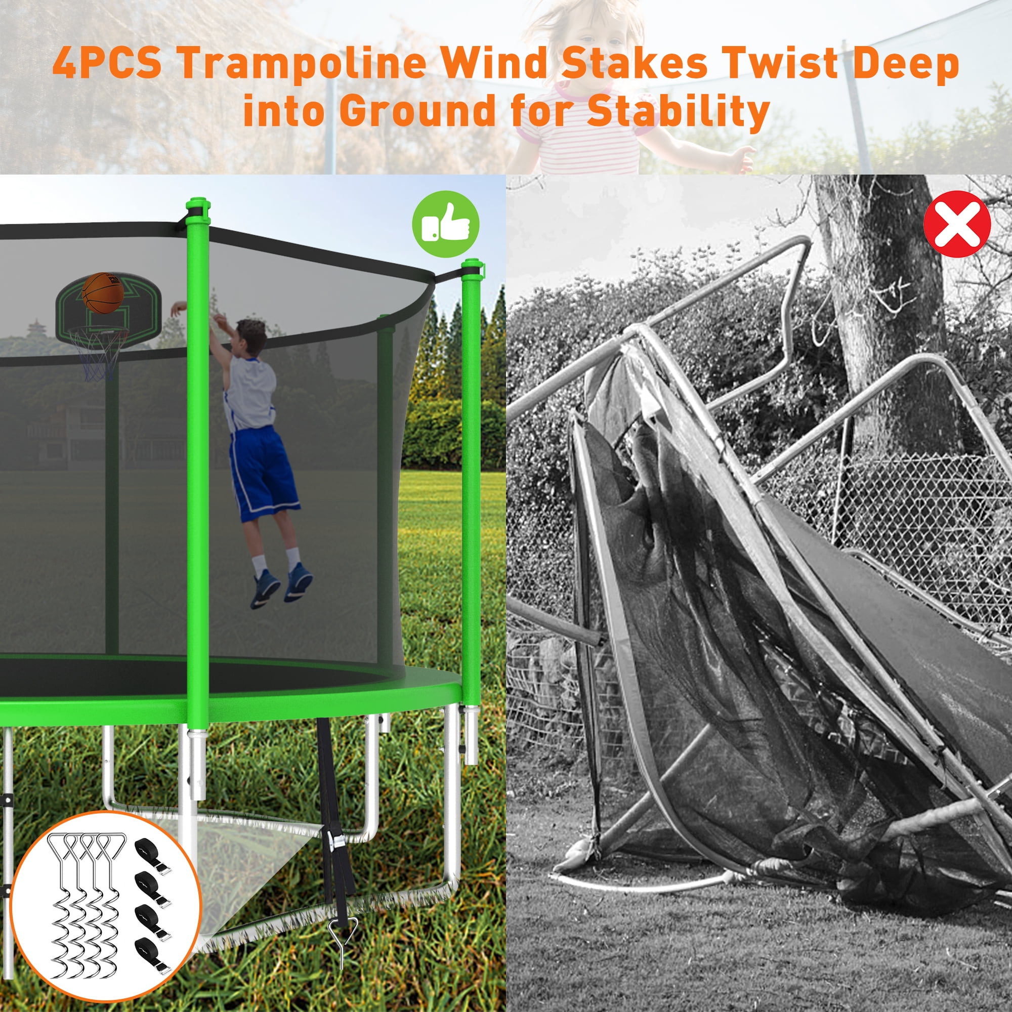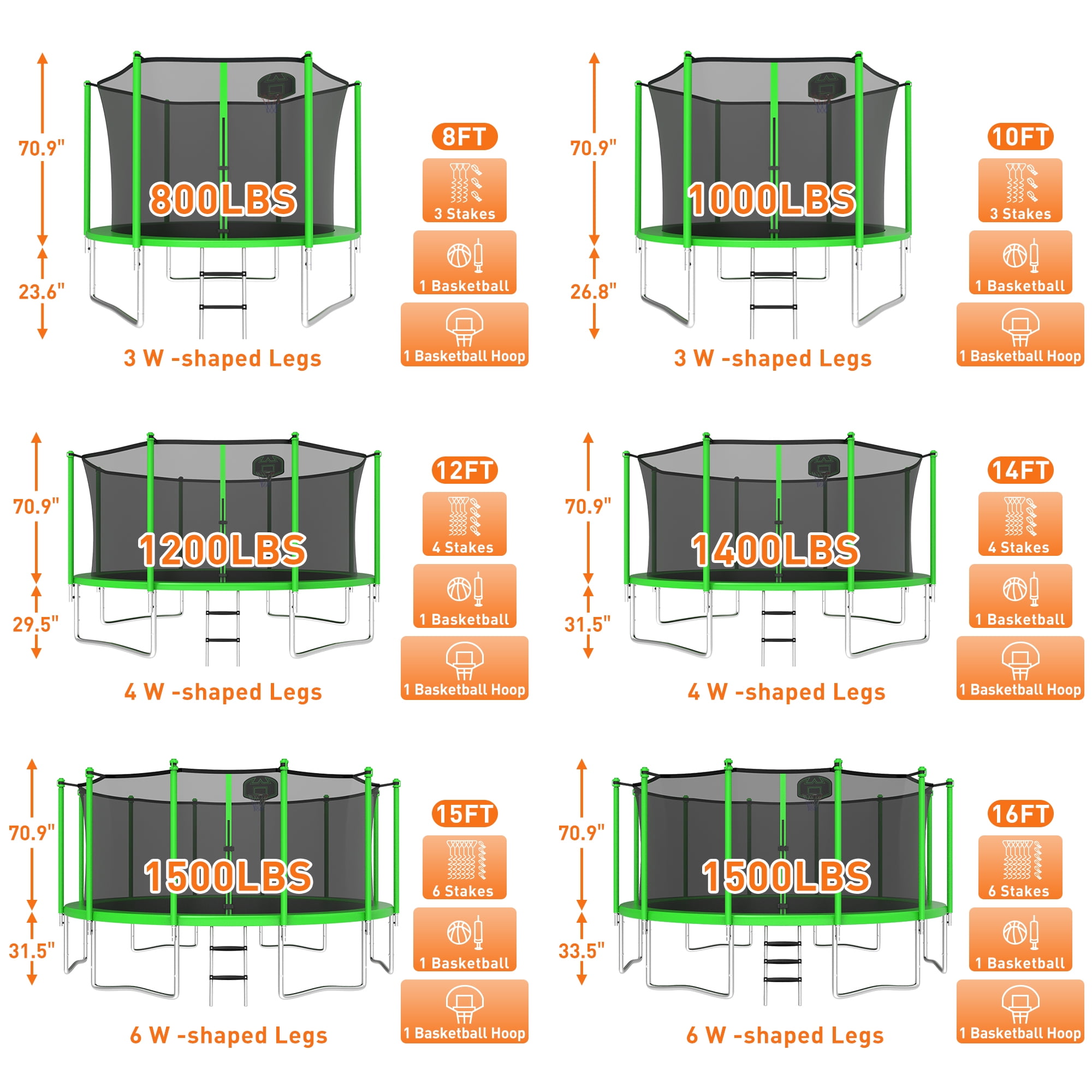 CITYLE 2024 NEW UPGRADED trampoline is back! We have upgraded CITYLE 12FT trampoline from performance, appearance and quality in many dimensions. We will always strive to create a premium outdoor trampoline that meets all your needs. UPGRADED: — CITYLE Backyard Trampoline 2024 will use bright color scheme to make your green trampoline with net look simple and advanced. — Our heavy duty trampoline frame is designed with galvanized coating to fully protect the frame from chemical damage. — We have upgraded the design of the basket to make the installation easier and the structure more stable. — We have upgraded the assembly of the frame to make the assembly easier and labor-saving. — We have updated the ladder to wide treads for more comfortable and easy climbing. — The upgraded spring cover is waterproof and UV resistant, protecting the spring and frame from chemical damage. — We redesigned and optimized the assembly instructions to be easier to read and guide you step by step assembly. Premium Design: 1. Our trampoline net poles are covered with PE sleeves over EPE foam, and our trampoline frames are fully covered with a galvanized coating that protects the poles from the sun, wind and rain, thus helping to extend their service life. 2. Our trampoline with enclosure is equipped with high-density safety net and 8 safety poles with internal net design, and the distance between the net and poles is kept enough to ensure that users will not be injured by hitting the poles directly. 3. Our heavy duty 12 feet trampoline for adults is equipped with 4 W-shaped support legs, providing 8 pivot points to make the trampoline for kids more stable. The attached wind pile ensures that it is not affected even in extreme weather. 4. The reinforced jumping mat PP has passed the American UV standard 5000 hours test. Padding cover PE and safety net PE have passed the American UV standard 500 hours test. 5. Sun-proof and waterproof spring cover prevents the spring from being damaged by chemicals. 6. 80pcs 180mm high tension springs ensure our 12′ trampoline becomes a super trampoline. Product Name: 12 FT Trampoline with Basketball Hoop and Enclosure Net Product Type: Outdoor Trampoline 12 FT Maximum Weight Capacity: 1200LBS Product size: 12FT* 12FT* 8.5FT Product N.W.: 160LBS Spring quantity: 80PCS Weight capacity: 1200lbs Wind Stakes: 4pcs W-Shaped Legs: 4pcs Jumping Mat Material: PP Spring Cover Material: PE Frame Material: Galvanized Steel