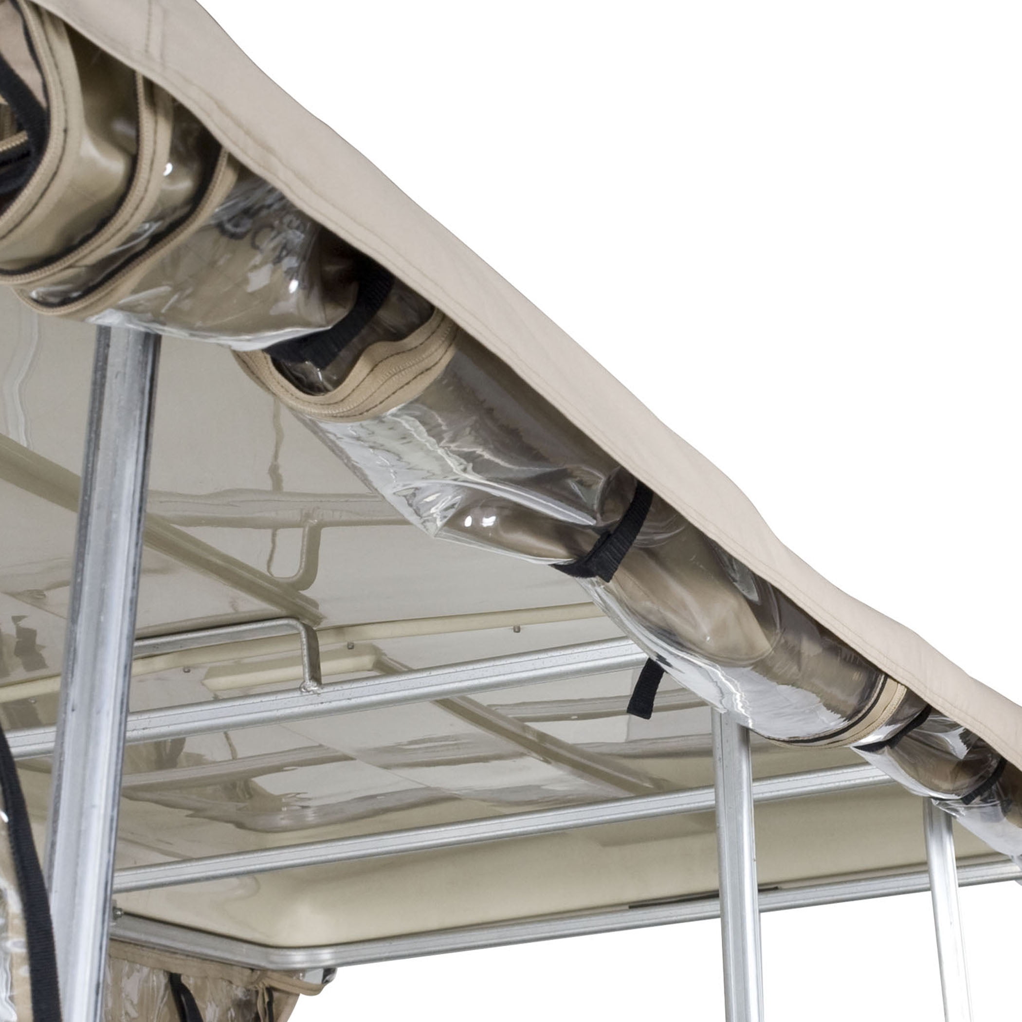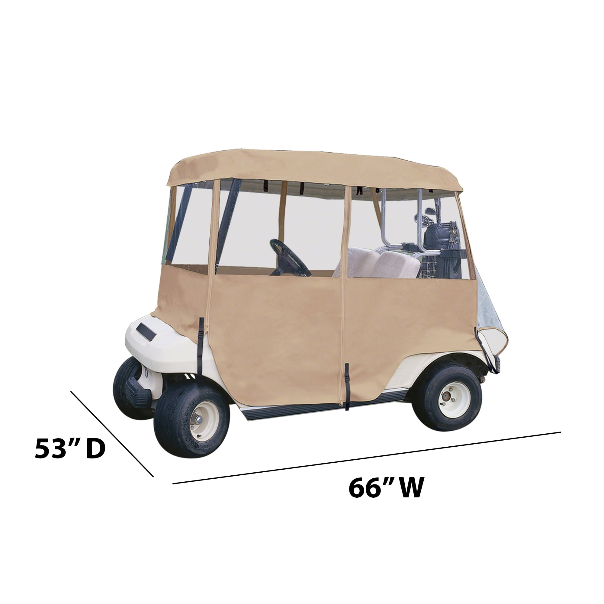 Fits most two-person golf carts 66″L x 53″W Three-year limited warranty Fits over roof – just roll down sides when bad weather threatens Keeps golf cars clean and dry in storage Super-clear window material with heavy-duty polyester walls and top Six zip-open panels roll up and down independently for quick and easy adjustment to any weather condition Roof valance covers rolled up panels Carrying case included