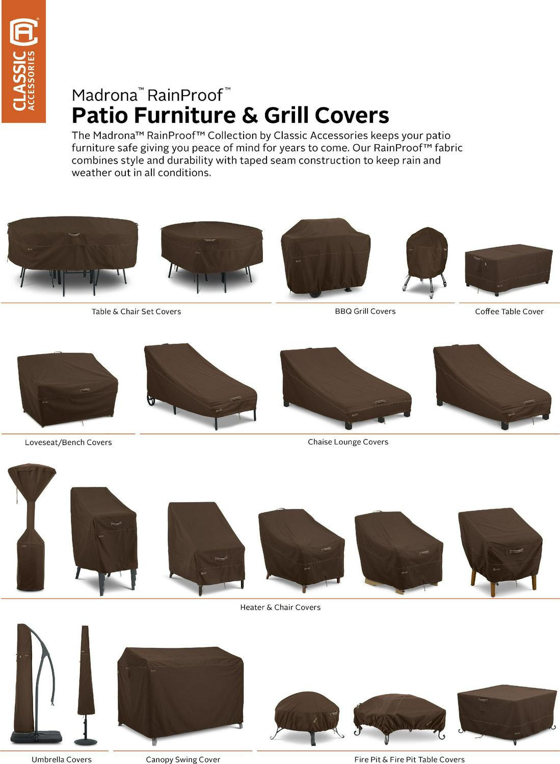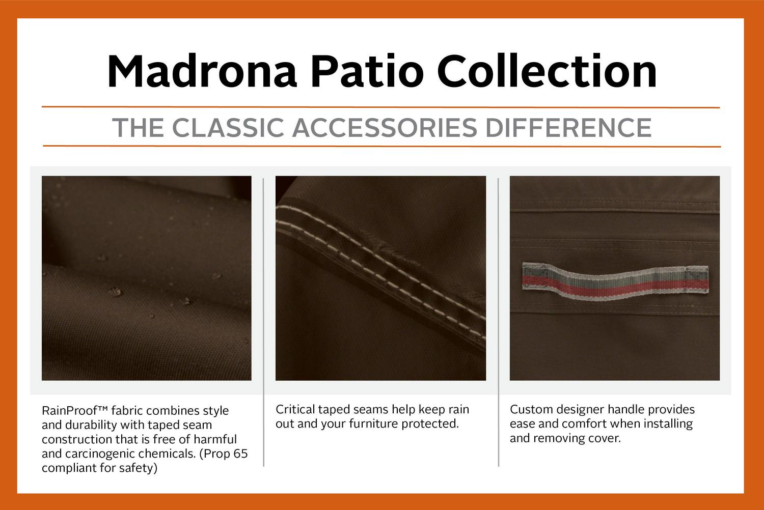The Madrona RainProof Collection by Classic Accessories keeps your patio furniture safe giving you peace of mind for years to come. Our RainProof fabric combines style and durability with taped seam construction to keep water out in all conditions. When you buy a Classic Accessories grill or patio furniture cover you are not just getting a cover; you are also purchasing peace of mind. Not only will your grill and patio furniture be protected from the elements, but you will be protected with the easiest warranty in the industry. If your product fails within the warranty period, look for us online and take advantage of our Hassle-Free warranty program supported by our US-based customer service team.