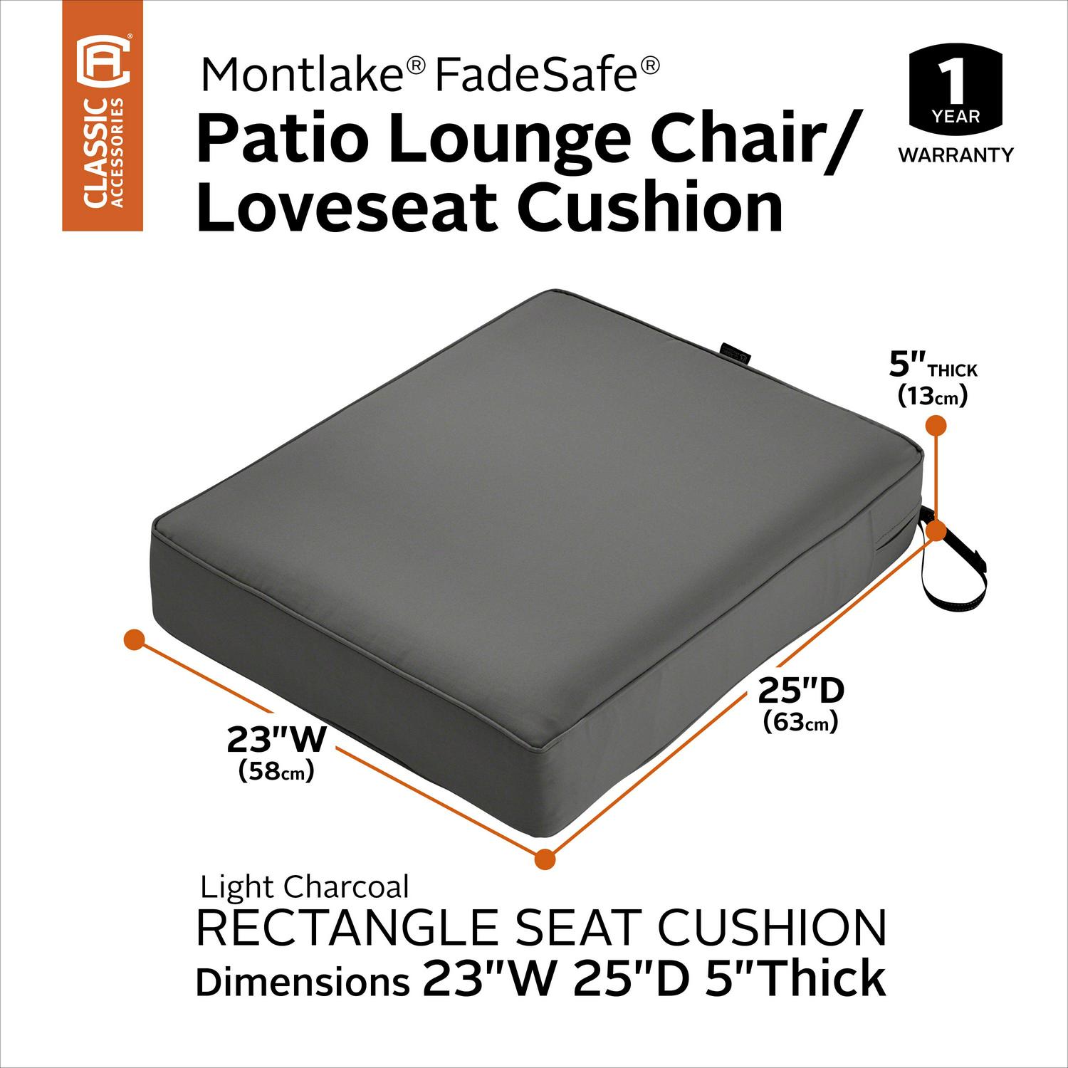 Classic Accessories Montlake FadeSafe Water-Resistant Patio Chair Seat Cushion, 23 x 25 x 5 inch, Light Charcoal