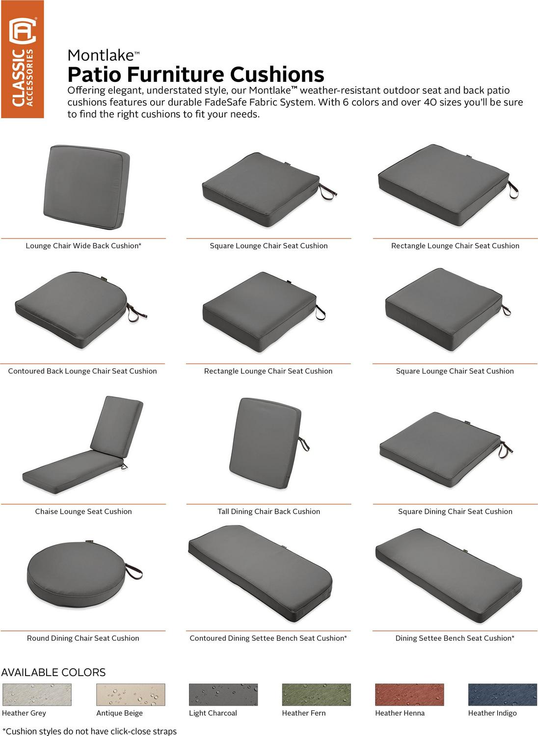 Classic Accessories’ Montlake Cushion Collection is offered in 6 colors and 28 sizes and is made with FadeSafe solution-dyed fabric to ensure that colors last in all conditions. Montlake FadeSafe fabric uses a high-denier polyester to give you maximum comfort and lasting performance. High-quality foams use a dense core with a softer outer layer to provide just the right amount of give for a firm but comfortable surface. These cushions provide a fashion-forward look with durable materials to make your patio space appealing and inviting whenever you want to go outdoors. When you buy a Classic Accessories patio cushion you are not just getting a cushion; you are also purchasing lasting comfort and peace of mind. Not only will your patio cushions be protected from the elements, but you will be protected with the easiest warranty in the industry. If your patio cushion fails within the warranty period, look for us online and take advantage of our Hassle-Free warranty program supported by our US-based customer service team.