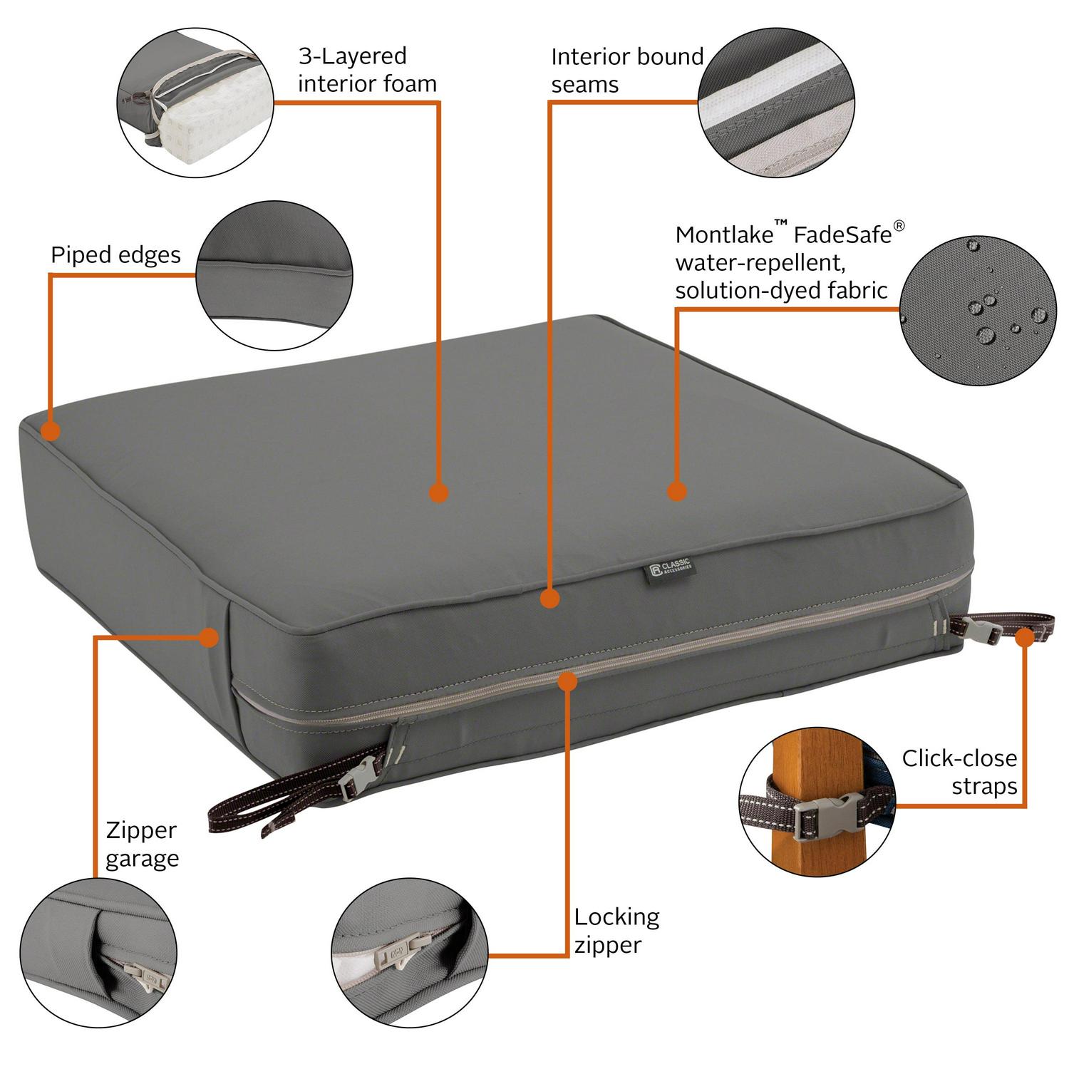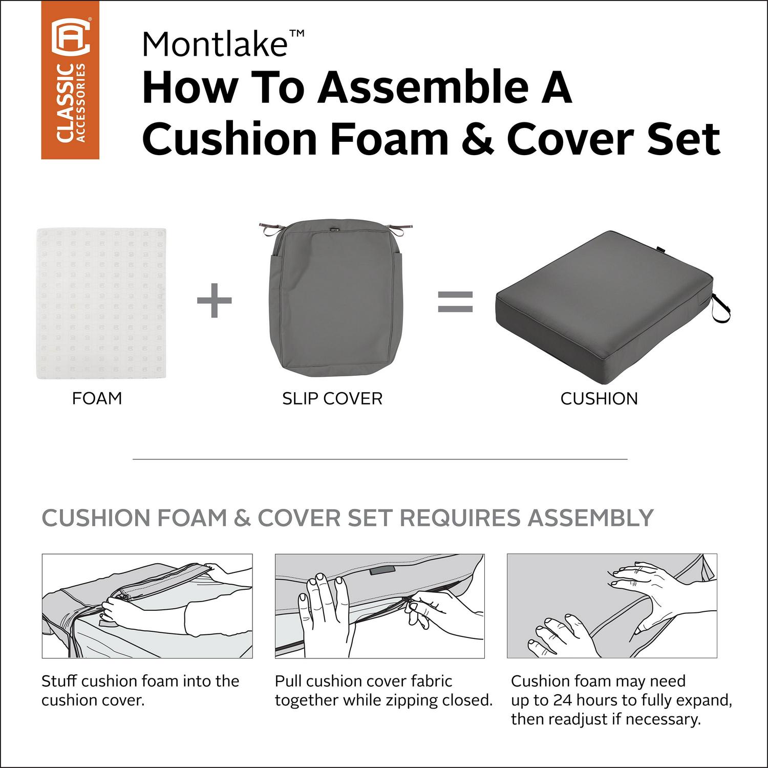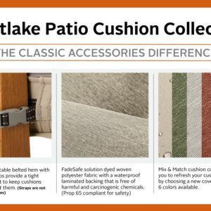 – UPDATE WITH EASE: No need to purchase a whole new set of cushions if your foam or skin wears out. With the Classic Accessories Montlake Cushion Collection you can refresh your cushions by choosing a new cover color to match any occasion. Or, replace worn out foam with our high-density replacements that provide a firm and comfortable seating surface